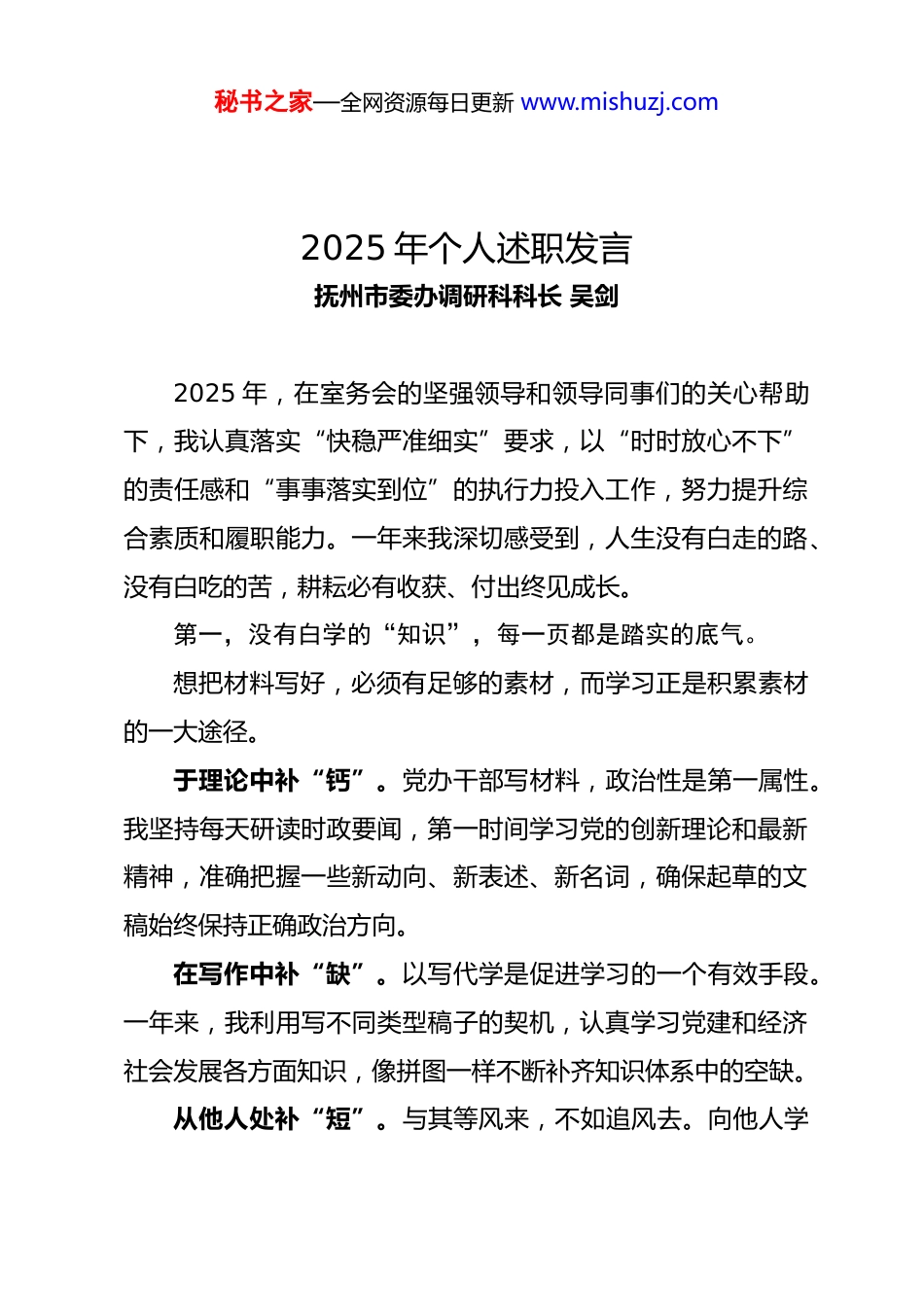 秘书之家—全网资源每日更新 www.mishuzj.com2025 年个人述职发言抚州市委办调研科科长 吴剑2025 年,在室务会的坚强领导和领导同事们的关心帮助下,我认真落实“快稳严准细实”要求,以“时时放心不下”的责任感和“事事落实到位”的执行力投入工作,努力提升综合素质和履职能力。一年来我深切感受到,人生没有白走的路、没有白吃的苦,耕耘必有收获、付出终见成长。第一,没有白学的“知识”,每一页都是踏实的底气。想把材料写好,必须有足够的素材,而学习正是积累素材的一大途径。于理论中补“钙”。党办干部写材料,政治性是第一属性。我坚持每天研读时政要闻,第一时间学习党的创新理论和最新精神,准确把握一些新动向、新表述、新名词,确保起草的文稿始终保持正确政治方向。在写作中补“缺”。以写代学是促进学习的一个有效手段。一年来,我利用写不同类型稿子的契机,认真学习党建和经济社会发展各方面知识,像拼图一样不断补齐知识体系中的空缺。从他人处补“短”。与其等风来,不如追风去。向他人学秘书之家—全网资源每日更新 www.mishuzj.com习是拓宽视野、补齐短板的有效路径。幸运的是材料口有几位领导的常指导、常教导,有同事之间经常的思维碰撞、头脑风暴,让我能够跳出个人经验的局限,不断弥补自身的短板,让笔下的文字承载更广的视野、更实的思考和更强的说服力。第二,没有白写的“废稿”,每一篇都是积累的宝藏。好文章既是改出来的,也是磨出来的。在材料口,“一稿过”是水平,“多稿过”则是常态。但正是这些被推翻、被修改的稿件,成为我提升文稿质量的宝贵财富。不轻视每一份初稿。无论大会、小会,亦或是对上、对内的汇报、讲话材料,我都坚持高标准、严要求,不轻信基础素材、基础文稿,精心构思、反复推敲,从框架搭建到观点提炼,从数据核实到语句润色,不放过任何一个细节,努力做到尽善尽美。不厌烦每一次修改。文章不厌百回改,反复推敲出好文。在几位领导的严格要求下,让我不断提高写材料的标准,把每一次修改,都当成是一次对标看齐、思路梳理、水平提升的过程,写出来的稿子也更加契合市委意图。不回避每一个问题。今年办公室推行了错情登记制度,我也在本子里记下了碰到的各种问题,有因工作不熟导致的,也有因不好的写作习惯产生的。为此,我定期对已完成的文稿进秘书之家—全网资源每日更新 www.mishuzj.com行复盘,分析领导修改后的、其他同事写的同类型材料和我写的有何不同,不断总结经验、汲取教训,努力追求更高的质量标准。第三,没有白加的“夜班”,每一次都是进步的阶梯。材料口常常是大事要事交织、急事难事叠加,任劳任怨是心态,加班加点是常态。写材料虽然“苦”,但能从领导肯定中感受到“乐”,从完成繁重任务中体验到“乐”,从个人素质能力提升中享受到“乐”。用心用力方能苦有所为。党办工作绝非简单“出力”就能见效,唯有倾注心力、深思熟虑,才能把大事办成、小事办实。加班的价值也不在于“熬时间”,而在于“用真心”,否则只能算值班,不能算加班。夜深人静之时,更容易沉浸到写作状态中,提前把手上的稿子完成,留出更多的时间给领导审稿,避免因时间不足而影响稿件质量。任劳任怨方能苦有所得。文稿工作人员藏于“幕后”、隐于“纸下”,写得好是应该的,出了错是要挨批的,心态非常重要。下半年几次科里周末轮班都碰到“忙碌局”,多个材料叠加在一起,不仅要写得快,还要送审的及时。但也正是这些经历,让我的应急能力、抗压能力得到提升。戒骄戒躁方能苦有所值。成绩面前易骄傲,复杂局面易急秘书之家—全网资源每日更新 www.mishuzj.com躁,特别是加班写材料,更容易让人觉得烦躁。党办虽然是“清水衙门”,但因地位特殊、岗位重要,依然容易面对诱惑挑战。一年来,我时刻提醒自己在诱惑面前要有戒心、在风浪面前学会静心、在杂乱面前保持细心,始终保持定力、严于律己,维护好办公室和党办干部的良好形象。展望 2026,我将秉持“学习永远在路上、磨砺永远无止境、奋斗永远正当时”的信念,努力锤炼好文笔、养成好文风,为服务市委中心工作、保障办公室高效运转贡献智慧力量。