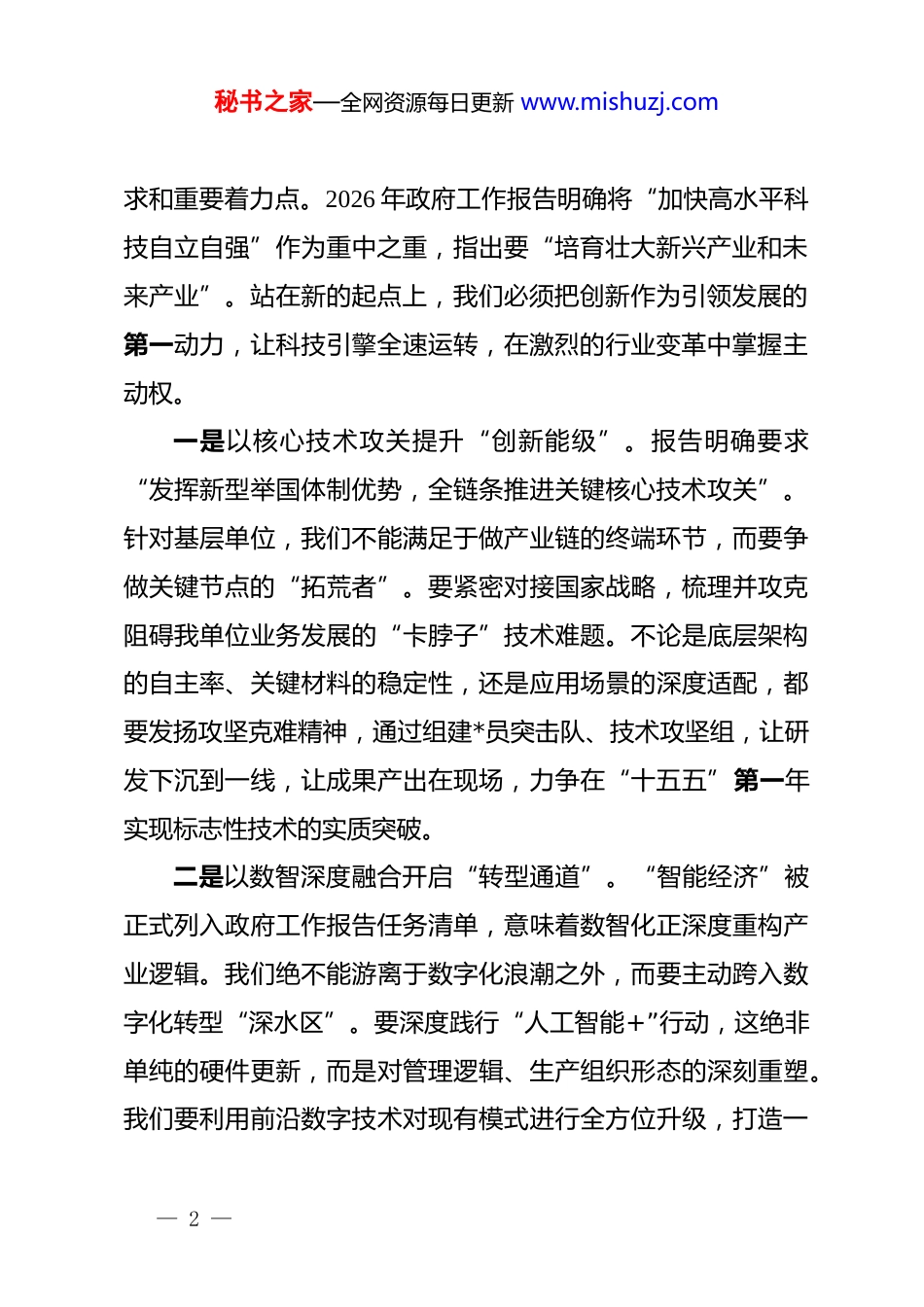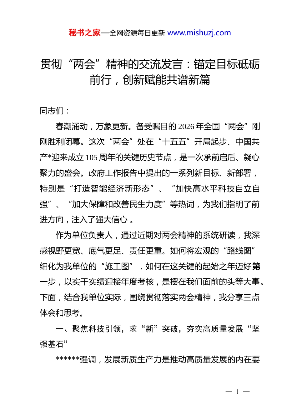 秘书之家—全网资源每日更新 www.mishuzj.com贯彻“两会”精神的交流发言:锚定目标砥砺前行,创新赋能共谱新篇同志们:春潮涌动,万象更新。备受瞩目的 2026 年全国“两会”刚刚胜利闭幕。这次“两会”处在“十五五”开局起步、中国共产*迎来成立 105 周年的关键历史节点,是一次承前启后、凝心聚力的盛会。政府工作报告中提出的一系列新目标、新部署,特别是“打造智能经济新形态”、“加快高水平科技自立自强”、“加大保障和改善民生力度”等热词,为我们指明了前进方向,注入了强大信心 。作为单位负责人,通过近期对两会精神的系统研读,我深感视野更宽、底气更足、责任更重。如何将宏观的“路线图”细化为我单位的“施工图”,如何在这关键的起始之年迈好第一步,以实干实绩迎接年度考核,是摆在我们面前的头等大事。下面,结合我单位实际,围绕贯彻落实两会精神,我分享三点体会和思考。一、聚焦科技引领,求“新”突破,夯实高质量发展“坚强基石”******强调,发展新质生产力是推动高质量发展的内在要— 1 —秘书之家—全网资源每日更新 www.mishuzj.com求和重要着力点。2026 年政府工作报告明确将“加快高水平科技自立自强”作为重中之重,指出要“培育壮大新兴产业和未来产业”。站在新的起点上,我们必须把创新作为引领发展的第一动力,让科技引擎全速运转,在激烈的行业变革中掌握主动权。一是以核心技术攻关提升“创新能级”。报告明确要求“发挥新型举国体制优势,全链条推进关键核心技术攻关”。针对基层单位,我们不能满足于做产业链的终端环节,而要争做关键节点的“拓荒者”。要紧密对接国家战略,梳理并攻克阻碍我单位业务发展的“卡脖子”技术难题。不论是底层架构的自主率、关键材料的稳定性,还是应用场景的深度适配,都要发扬攻坚克难精神,通过组建*员突击队、技术攻坚组,让研发下沉到一线,让成果产出在现场,力争在“十五五”第一年实现标志性技术的实质突破。二是以数智深度融合开启“转型通道”。“智能经济”被正式列入政府工作报告任务清单,意味着数智化正深度重构产业逻辑。我们绝不能游离于数字化浪潮之外,而要主动跨入数字化转型“深水区”。要深度践行“人工智能+”行动,这绝非单纯的硬件更新,而是对管理逻辑、生产组织形态的深刻重塑。我们要利用前沿数字技术对现有模式进行全方位升级,打造一— 2 —秘书之家—全网资源每日更新 www.mishuzj.com批“黑灯工厂”和“智能体”应用示范点,驱动数据要素价值化,让算法优势转化为竞争优势,加速从传统模式向智造形态的根本转变。三是以管理机制改革释放“制度红利”。创新的活力源于体制的顺畅。两会强调要“推动科技创新和产业创新深度融合”,这意味着我们必须破除一切束缚创新的制度藩篱。要进一步深化内部科研管理体制改革,探索更为灵活的“揭榜挂帅”机制,给予科研团队在技术路径选择和资源统筹上更大的自主权。同时,建立健全以创新价值、业务贡献为核心的考评导向,让实干者有位、创新者有回报,全方位激发人才的内生动力,让创新的泉眼充分喷涌。二、聚力结构优化,向“质”跃升,塑造产业竞争“增长核心”今年的政府工作报告首次明确提出“打造智能经济新形态”,并就传统产业升级与未来产业前瞻布局作出了全面部署。对于我单位的中长期战略而言,必须坚持稳中求进,在巩固存量优势的同时拓宽增量空间,通过产业层次的迭代升级,实现发展质效的整体跃迁。一是转型赋能,推动传统业务“蝶变升级”。实体经济始终是我们的立身之本,传统产业绝非“低端”代名词,关键在— 3 —秘书之家—全网资源每日更新 www.mishuzj.com于科技赋能。我们要主动承接国家“安排 2000 亿元超长期特别国债资金支持大规模设备更新”的政策红利,坚决出清落后产能,引进先进智造装备。要全面开展“上云用数赋智”专项行动,将 5g、工业互联网技术深度植入研发、生产、营销的全链条,全方位提高全要素生产率,把我们的“基本盘”守得更稳、做得更精。二是前瞻研判,助力新兴业态“破茧成林”。两会明确支持“低空经济、生物制造、具身智能、6g”等未来产业发展,这为我们寻找新增长...