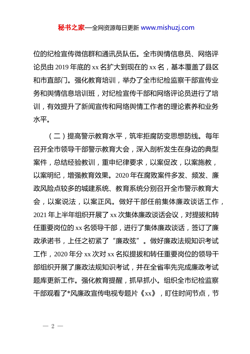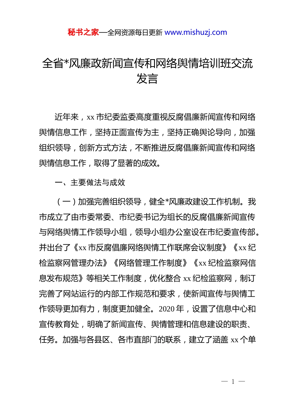 秘书之家—全网资源每日更新 www.mishuzj.com全省*风廉政新闻宣传和网络舆情培训班交流发言近年来,xx 市纪委监委高度重视反腐倡廉新闻宣传和网络舆情信息工作,坚持正面宣传为主,坚持正确舆论导向,加强组织领导,创新方式方法,不断推进反腐倡廉新闻宣传和网络舆情信息工作,取得了显著的成效。一、主要做法与成效(一)加强完善组织领导,健全*风廉政建设工作机制。我市成立了由市委常委、市纪委书记为组长的反腐倡廉新闻宣传与网络舆情工作领导小组,领导小组办公室设在市纪委宣传部。并出台了《xx 市反腐倡廉网络舆情工作联席会议制度》《xx 纪检监察网管理办法》《网络管理工作制度》《xx 纪检监察网信息发布规范》等相关工作制度,优化整合 xx 纪检监察网,制订完善了网站运行的内部工作规范和要求,使新闻宣传与舆情工作领导更加有力,制度更加健全。2020 年,设置了信息中心和宣传教育处,明确了新闻宣传、舆情管理和信息建设的职责、任务。加强与各县区、各市直部门的联系,建立了涵盖 xx 个单— 1 —秘书之家—全网资源每日更新 www.mishuzj.com位的纪检宣传微信群和通讯员队伍。全市舆情信息员、网络评论员由 2019 年底的 xx 名扩大到现在的 xx 名,基本覆盖了县区和市直部门。强化教育培训,举办了全市纪检监察干部宣传业务和舆情信息培训班,对纪检宣传干部和网络评论员进行了培训,有效提升了新闻宣传和网络舆情工作者的理论素养和业务水平。(二)提高警示教育水平,筑牢拒腐防变思想防线。每年召开全市领导干部警示教育大会,深入剖析发生在身边的典型案件,总结经验教训,重申纪律要求,以案促改,以案施教,以案明纪,增强教育效果。2020 年在腐败案件多发、频发、廉政风险点较多的城建系统、教育系统分别召开全市警示教育大会,以案说法,以案正风。做好干部任前集体廉政谈话工作,2021 年上半年组织开展了 xx 次集体廉政谈话会议,对提拔和转任重要岗位的 xx 名领导干部,进行了集体廉政谈话,签订了廉政承诺书,上任之初紧了“廉政弦”。做好廉政法规知识考试工作,2020 年分 xx 次对 xx 名拟提拔和转任重要岗位的领导干部组织开展了廉政法规知识考试,并在全省率先完成廉政考试题库更新工作。强化教育提醒,抓早抓小。组织全市纪检监察干部观看了*风廉政宣传电视专题片《xx》,盯住时间节点,节— 2 —秘书之家—全网资源每日更新 www.mishuzj.com假日向全市各级各部门*政一把手、班子成员发送廉政短信 xx条。(三)抓好常规宣传教育,营造正风反腐良好社会氛围。定期不定期召开新闻宣传和网络舆情工作联席会议,适时召开由组织、宣传、网信办等相关部门和重点新闻媒体、网站参加的通气会,加强正面宣传报道,加大新闻投放量和频次,进行立体式、全方位宣传。2020 年累计在 xx 电视台、xx 日报和 xx晚报等市级媒体开展新闻报道近 xx 次。加强对外宣传,全年累计在人民日报、中国纪检监察报等国家级媒体发表文章 xx 篇,在 xx 日报、xx 廉政网等省级媒体发表文章 xx 篇。拍摄了题为《xx》的廉政专题片,在 xx 电视台分两期播出,展示了我市纪检监察工作的特色和亮点,营造了正风反腐良好社会氛围。坚持办好廉政大讲堂。前移防腐倡廉关口,邀请相关领域、不同层面的领导、专家,2020 年分别开展了以做好新形势下国有企业*风廉政建设、旁听法院庭审、宣讲十九届五中全会精神等为主题的 xx 场次大讲堂活动,累计参加人员达 xx 多人,强化了*员领导干部的廉洁自律意识。坚持办好《清风 xx》,优化了栏目设置,及时解读中央及省市*风廉政建设重大部署,全面展示全市纪检监察机关工作亮点、成果和经验,充分发挥了杂志的— 3 —秘书之家—全网资源每日更新 www.mishuzj.com宣传教育功能。(四)提升廉政文化建设水平,传播正风反腐正能量。着力营造崇廉拒腐、尚俭戒奢的文化环境和社会环境,通过优秀的廉政文化教育引导干部群众。深入开展全市廉政文化“六进”活动,认真抓好廉政文化示范点创建工作,对 xx 个市级廉政文化建设示范单位进行了表彰。组织参加“xx 清风”微电影、廉政今日头条请搜索...