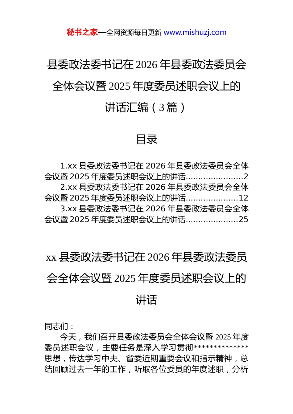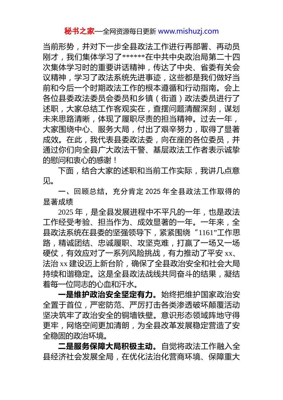 秘书之家—全网资源每日更新 www.mishuzj.com县委政法委书记在 2026 年县委政法委员会全体会议暨 2025 年度委员述职会议上的讲话汇编(3 篇)目录1.xx 县委政法委书记在 2026 年县委政法委员会全体会议暨 2025 年度委员述职会议上的讲话.......................22.xx 县委政法委书记在 2026 年县委政法委员会全体会议暨 2025 年度委员述职会议上的讲话.....................123.xx 县委政法委书记在 2026 年县委政法委员会全体会议暨 2025 年度委员述职会议上的讲话.....................25xx 县委政法委书记在 2026 年县委政法委员会全体会议暨 2025 年度委员述职会议上的讲话同志们:今天,我们召开县委政法委员会全体会议暨 2025 年度委员述职会议,主要任务是深入学习贯彻**************思想,传达学习中央、省委近期重要会议和指示精神,总结回顾过去一年的工作,听取各位委员的年度述职,分析秘书之家—全网资源每日更新 www.mishuzj.com当前形势,并对下一步全县政法工作进行再部署、再动员刚才,我们集体学习了******在中共中央政治局第二十四次集体学习时的重要讲话精神,传达了中央、省委有关会议精神,学习了政法系统先进事迹,这些都是我们做好当前和今后一个时期政法工作的根本遵循和行动指南。会上各位县委政法委员会委员和乡镇(街道)政法委员进行了述职,大家总结工作客观实在,查摆问题清醒深刻,谋划未来思路清晰,体现了履职尽责的担当精神。过去一年,大家围绕中心、服务大局,付出了艰辛努力,取得了显著成效。在此,我代表县委政法委,向在座的各位委员,并通过你们向全县广大政法干警、基层政法工作者表示诚挚的慰问和衷心的感谢!下面,结合大家的述职和当前工作实际,我讲几点意见。一、回顾总结,充分肯定 2025 年全县政法工作取得的显著成绩2025 年,是全县发展进程中不平凡的一年,也是政法工作经受考验、担当作为、成效显著的一年。一年来,全县政法系统在县委的坚强领导下,紧紧围绕“1161”工作思路,精诚团结、忠诚履职、攻坚克难,打赢了一场又一场硬仗,有效应对了一系列风险挑战,有力推动了平安 xx、法治 xx 建设迈上新台阶,确保了全县政治安全和社会大局持续和谐稳定。这是全县政法战线共同奋斗的结果,凝结着每一位同志的心血和汗水。一是维护政治安全坚定有力。始终把维护国家政治安全置于首位,严密防范、严厉打击各类渗透破坏颠覆活动坚决筑牢了政治安全的铜墙铁壁。意识形态领域阵地守得更牢,网络空间更加清朗,为全县改革发展稳定营造了安全稳固的政治环境。二是服务保障大局积极主动。自觉将政法工作融入全县经济社会发展全局,在优化法治化营商环境、保障重大秘书之家—全网资源每日更新 www.mishuzj.com项目建设、服务乡村振兴等方面主动作为,出台了一系列便民利企措施,依法平等保护各类市场主体合法权益,以法治力量护航高质量发展。三是平安 xx 建设成果丰硕。深入推进扫黑除恶常态化,严厉打击整治电信网络诈骗、盗抢骗、黄赌毒、食药环等突出违法犯罪,社会治安形势持续向好,人民群众安全感显著提升。扎实开展矛盾纠纷排查化解,大量风险隐患化解在基层、消除在萌芽状态。安全生产、公共安全监管责任压紧压实,未发生重大恶性案件和公共安全事故。四是法治 xx 建设纵深推进。全面深化政法领域改革,执法司法权力运行机制更加规范高效。持续加大全民普法力度,“八五”普法规划深入实施,全社会法治观念明显增强。公共法律服务体系更加健全,法治政府、诚信社会建设取得新进展。五是政法队伍建设持续加强。坚持政治建警、全面从严治警,扎实开展各类 zt 教育与政治轮训,广大干警的政治判断力、政治领悟力、政治执行力不断提升。政法队伍教育整顿成果巩固深化,纪律作风进一步好转,履职能力不断增强,涌现出一批先进典型和模范人物。在肯定成绩的同时,我们也要清醒地看到工作中存在的问题和不足。从述职和日常掌握的情况看,主要体现在一是风险防范化解的精准性、前瞻性有待进一步提升,部分领域风险隐患依然存在;二是基层社会治理的现代化水平有待提高,网格化服务管理的作...