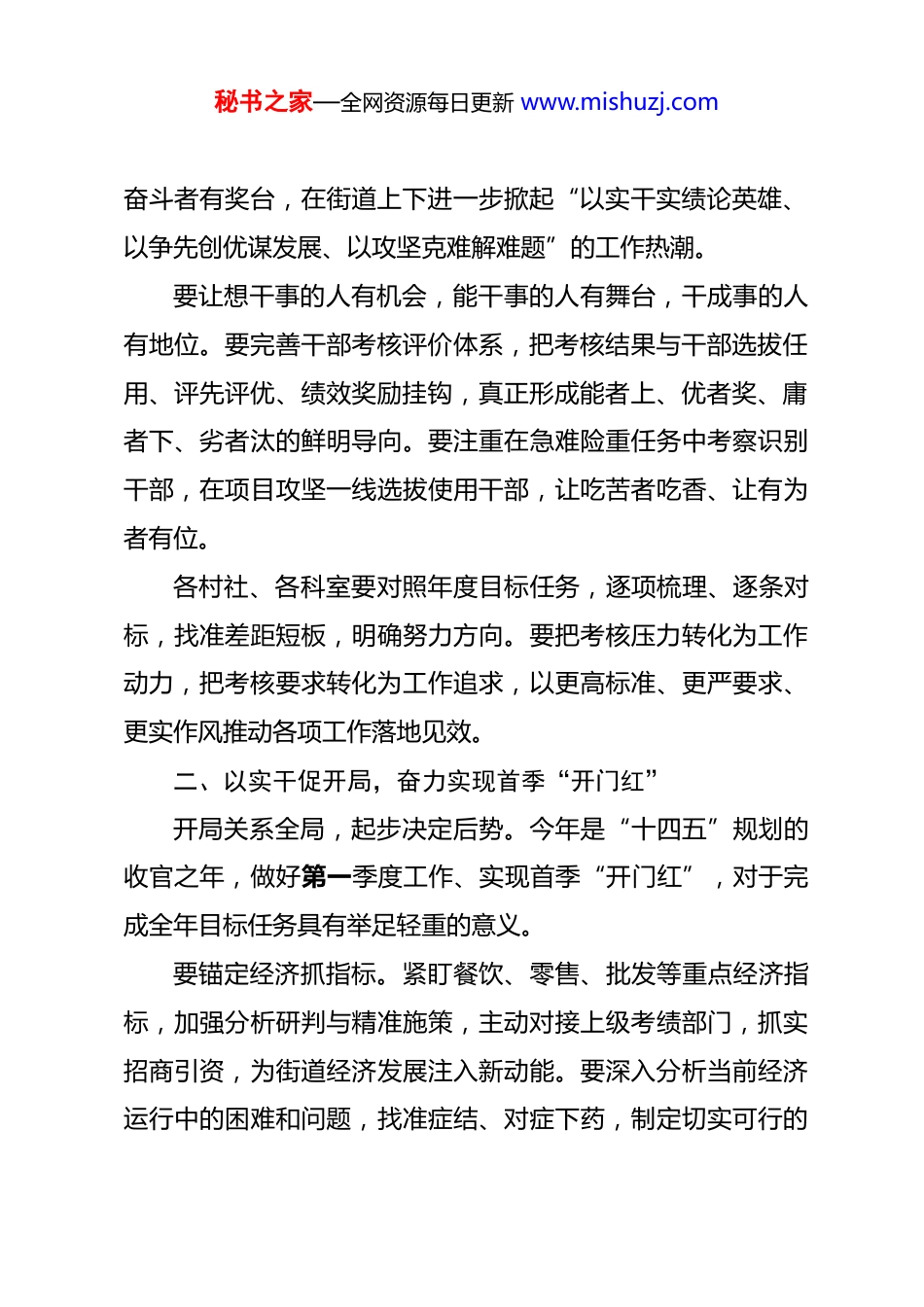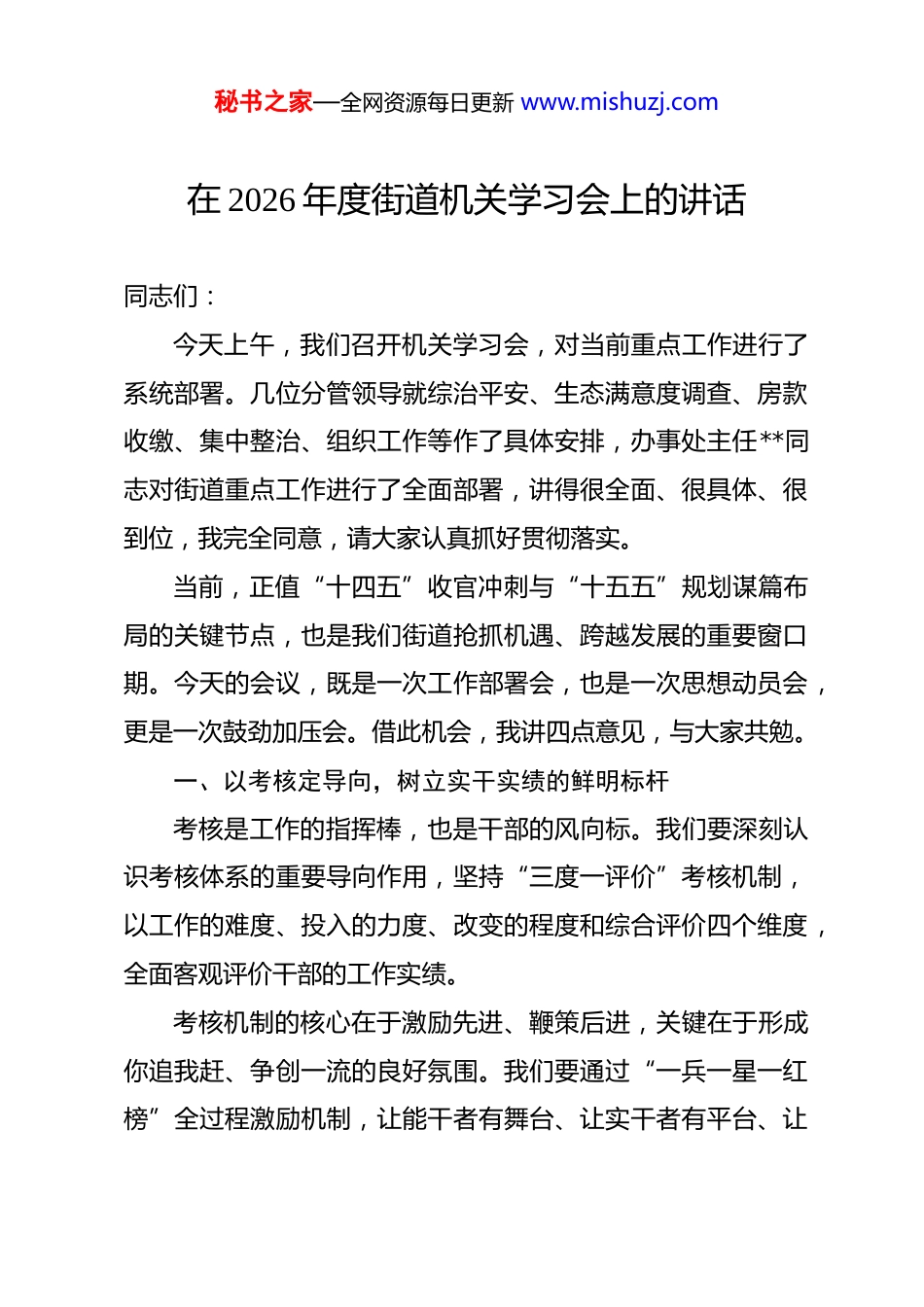 秘书之家—全网资源每日更新 www.mishuzj.com在 2026 年度街道机关学习会上的讲话 同志们:今天上午,我们召开机关学习会,对当前重点工作进行了系统部署。几位分管领导就综治平安、生态满意度调查、房款收缴、集中整治、组织工作等作了具体安排,办事处主任**同志对街道重点工作进行了全面部署,讲得很全面、很具体、很到位,我完全同意,请大家认真抓好贯彻落实。当前,正值“十四五”收官冲刺与“十五五”规划谋篇布局的关键节点,也是我们街道抢抓机遇、跨越发展的重要窗口期。今天的会议,既是一次工作部署会,也是一次思想动员会,更是一次鼓劲加压会。借此机会,我讲四点意见,与大家共勉。一、以考核定导向,树立实干实绩的鲜明标杆考核是工作的指挥棒,也是干部的风向标。我们要深刻认识考核体系的重要导向作用,坚持“三度一评价”考核机制,以工作的难度、投入的力度、改变的程度和综合评价四个维度,全面客观评价干部的工作实绩。考核机制的核心在于激励先进、鞭策后进,关键在于形成你追我赶、争创一流的良好氛围。我们要通过“一兵一星一红榜”全过程激励机制,让能干者有舞台、让实干者有平台、让秘书之家—全网资源每日更新 www.mishuzj.com奋斗者有奖台,在街道上下进一步掀起“以实干实绩论英雄、以争先创优谋发展、以攻坚克难解难题”的工作热潮。要让想干事的人有机会,能干事的人有舞台,干成事的人有地位。要完善干部考核评价体系,把考核结果与干部选拔任用、评先评优、绩效奖励挂钩,真正形成能者上、优者奖、庸者下、劣者汰的鲜明导向。要注重在急难险重任务中考察识别干部,在项目攻坚一线选拔使用干部,让吃苦者吃香、让有为者有位。各村社、各科室要对照年度目标任务,逐项梳理、逐条对标,找准差距短板,明确努力方向。要把考核压力转化为工作动力,把考核要求转化为工作追求,以更高标准、更严要求、更实作风推动各项工作落地见效。二、以实干促开局,奋力实现首季“开门红”开局关系全局,起步决定后势。今年是“十四五”规划的收官之年,做好第一季度工作、实现首季“开门红”,对于完成全年目标任务具有举足轻重的意义。要锚定经济抓指标。紧盯餐饮、零售、批发等重点经济指标,加强分析研判与精准施策,主动对接上级考绩部门,抓实招商引资,为街道经济发展注入新动能。要深入分析当前经济运行中的困难和问题,找准症结、对症下药,制定切实可行的秘书之家—全网资源每日更新 www.mishuzj.com对策措施。要加大企业服务力度,帮助企业解决实际困难,支持企业做大做强。要积极培育新的经济增长点,大力发展现代服务业,促进消费扩容提质。要精细管理促规范。持续加大市场秩序整治力度,重点推进流动摊贩管理、违法建设整治等工作。市场秩序直接关系到城市形象和群众生活质量,要建立健全长效管理机制,做到规范化、常态化、精细化。结合四个安置房小区实际,科学制定安置地下停车位收费方案,以精细化治理提升群众生活品质。安置房小区管理是一项系统工程,涉及群众切身利益,要充分听取群众意见,平衡各方利益诉求,确保方案科学合理、公平公正、群众认可。要抓实换届“后半篇”文章。深入开展“走村连心、履职践诺”活动,推动村社书记锤炼“主政一方”的底气、攻坚克难的勇气和舍我其谁的豪气。换届只是开始,干事才是根本。新当选的村社干部要尽快进入角色,熟悉情况、理清思路、谋划发展。要践行为民承诺,把竞选时的承诺转化为实实在在的行动,把规划的蓝图转化为看得见的实景。要紧抓**发展机遇,带着情怀谋发展,怀着激情招项目,顶着压力干事业,在推动街道高质量发展的实践中展现新担当、实现新作为。三、以纪律守底线,筑牢廉洁自律的坚固防线秘书之家—全网资源每日更新 www.mishuzj.com纪律是党的生命线,是党员干部的底线。我们每一名党员干部都要把纪律和规矩挺在前面,时刻绷紧纪律这根弦,做到心有所畏、言有所戒、行有所止。要筑牢廉洁自律防线。严格执行中央八项规定及其实施细则精神,坚决反对形式主义、官僚主义、享乐主义和奢靡之风。要自觉接受监督,习惯在监督下工作生活。要加强作风建设,深入基层、深入群众,察...