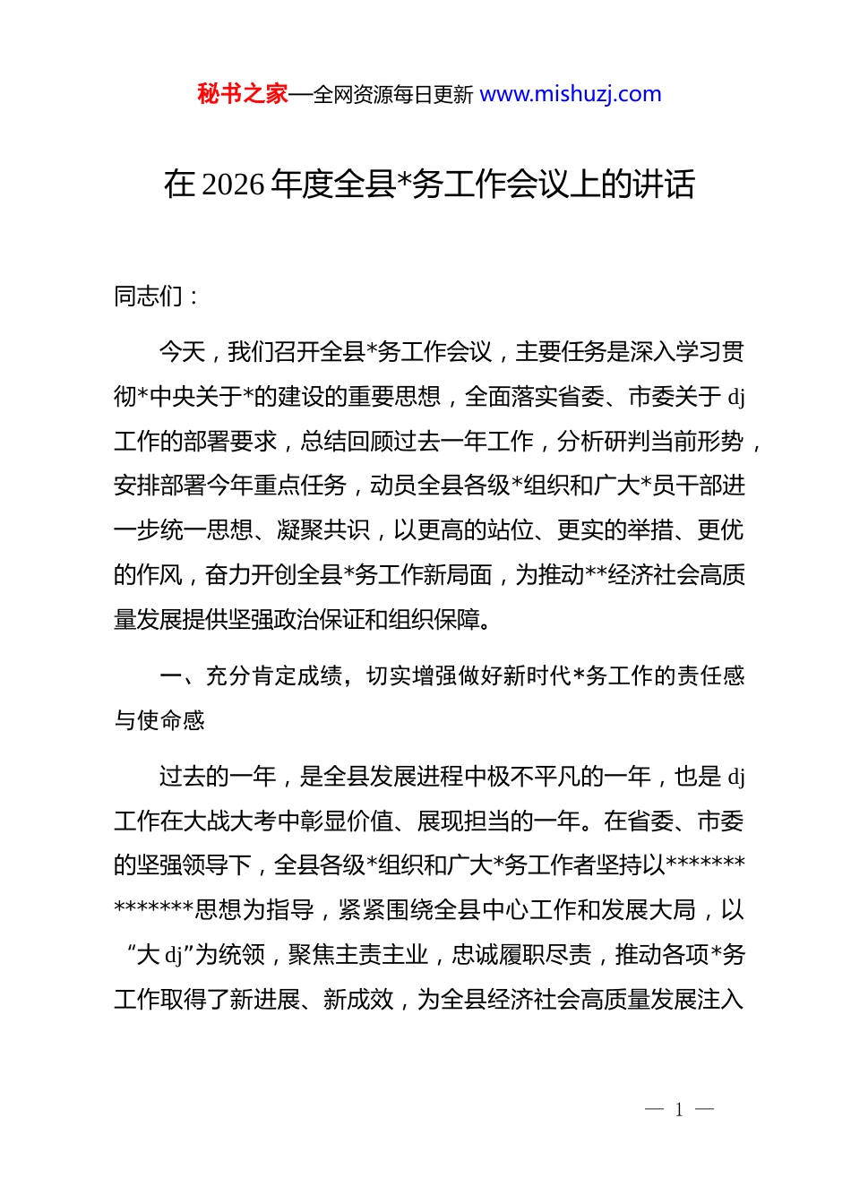 秘书之家—全网资源每日更新 www.mishuzj.com在 2026 年度全县*务工作会议上的讲话同志们:今天,我们召开全县*务工作会议,主要任务是深入学习贯彻*中央关于*的建设的重要思想,全面落实省委、市委关于 dj工作的部署要求,总结回顾过去一年工作,分析研判当前形势,安排部署今年重点任务,动员全县各级*组织和广大*员干部进一步统一思想、凝聚共识,以更高的站位、更实的举措、更优的作风,奋力开创全县*务工作新局面,为推动**经济社会高质量发展提供坚强政治保证和组织保障。一、充分肯定成绩,切实增强做好新时代*务工作的责任感与使命感过去的一年,是全县发展进程中极不平凡的一年,也是 dj工作在大战大考中彰显价值、展现担当的一年。在省委、市委的坚强领导下,全县各级*组织和广大*务工作者坚持以**************思想为指导,紧紧围绕全县中心工作和发展大局,以“大 dj”为统领,聚焦主责主业,忠诚履职尽责,推动各项*务工作取得了新进展、新成效,为全县经济社会高质量发展注入— 1 —秘书之家—全网资源每日更新 www.mishuzj.com了强劲动能。政治引领更加坚定有力。我们始终把*的政治建设摆在首位,教育引导广大*员干部深刻领悟“两个确立”的决定性意义,增强“四个意识”、坚定“四个自信”、做到“两个维护”。理论武装持续深化,全年开展各类*员教育培训 110 余场,覆盖*员 2.1 万人次,*的创新理论深入人心。意识形态工作责任制压紧压实,阵地管理坚强有效,主流思想舆论不断巩固壮大,为全县发展凝聚了强大精神力量。服务大局更加精准有效。各级*组织自觉将*务工作融入全县发展主战场。组织工作围绕“选贤任能”,大力选拔使用在改革发展一线、急难险重任务中表现突出的干部,干部队伍结构持续优化,活力竞相迸发。宣传工作聚焦“凝心铸魂”,中央、省级媒体累计刊播报道**新闻 4700 余篇,讲好了**故事,传播了**声音,提升了**形象。统战工作突出“团结联合”,促进非公有制经济健康发展和非公有制经济人士健康成长,“两个健康”创建经验在全市推广。政法工作坚守“守护平安”,平安**、法治**建设深入推进,社会大局持续和谐稳定,群众安全感满意度稳步提升。社会工作践行“暖心惠民”,聚焦群众“急难愁盼”,累计办结民生实事 1.2 万余件,解决了— 2 —秘书之家—全网资源每日更新 www.mishuzj.com一批历史遗留问题和群众反映强烈的突出问题。基层基础更加坚实稳固。深入实施“强基固本”工程,持续整顿软弱涣散基层*组织,年内纳入整顿的 58 个软弱涣散*组织已全部完成转化提升。*员队伍建设质量不断提高,全年发展*员 230 名,结构持续优化。基层*务工作者能力素质得到提升,举办专题培训班 16 期,培训*务干部 1574 人次。城市、农村、机关、企业、学校等各领域 dj 工作统筹推进,dj 引领基层治理效能日益显现,打造了**个基层 dj 示范点,形成了“*支部+合作社+农户”、“dj 引领·清廉护航”等一批具有本地特色的 dj品牌。自身建设更加严实过硬。持之以恒推进全面从严治*,严格落实中央八项规定及其实施细则精神,驰而不息纠治“四风”特别是形式主义、官僚主义。强化监督执纪问责,政治生态持续向好。*务干部队伍专业化能力建设得到加强,工作规范化、制度化水平进一步提升,展现了新时代*务工作者恪尽职守、担当作为的良好风貌。这些成绩的取得,是省委、市委坚强领导的结果,是全县各级*组织和广大*务工作者凝心聚力、拼搏实干的结果。在此,我代表县委,向全县*务战线的同志们表示衷心的感谢并致以崇— 3 —秘书之家—全网资源每日更新 www.mishuzj.com高的敬意!在肯定成绩的同时,我们也要清醒地认识到,对照新时代*的建设总要求和高质量发展的现实需要,我们的工作还存在一些短板和不足:部分领域 dj 工作与业务工作融合不够深,存在“两张皮”现象;少数基层*组织政治功能发挥不充分,组织力、凝聚力有待加强;个别*务干部创新意识不强,工作方法单一,破解难题的能力有待提升;dj 工作品牌效应还不够突出,示范引领作用有待进一步发挥。对于这些问题,我们必须高度重视,采取有力措施切实加以解...