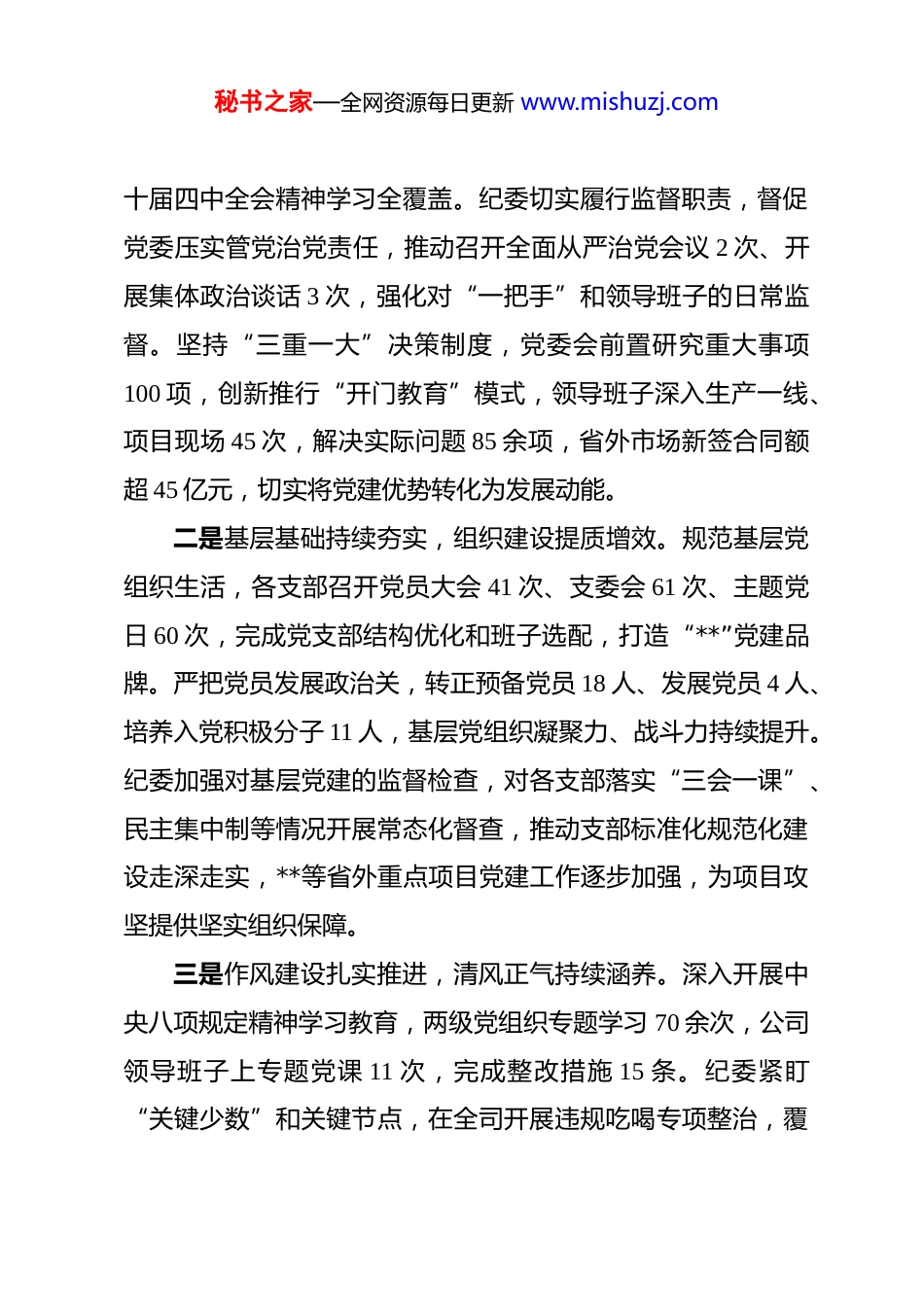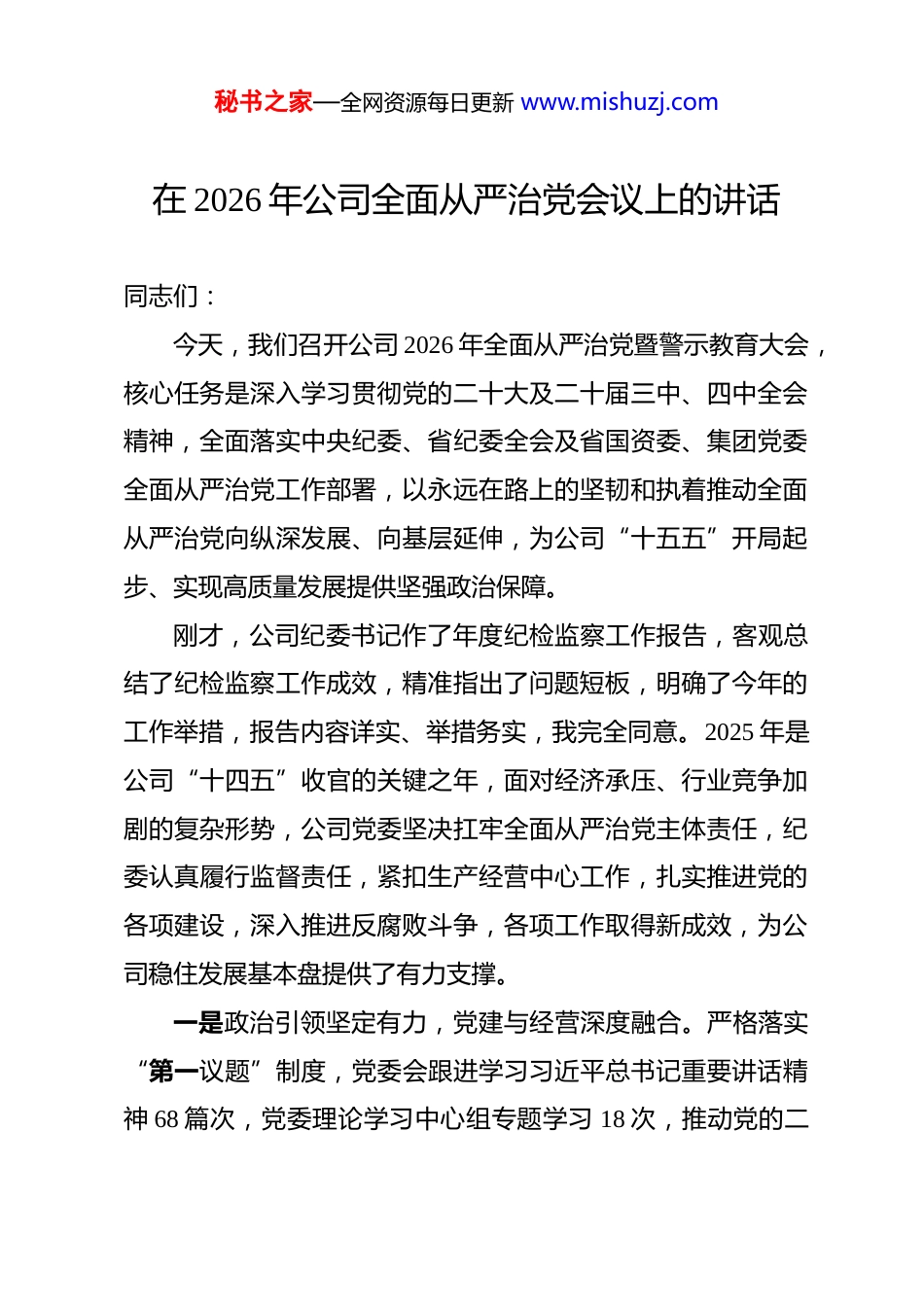 秘书之家—全网资源每日更新 www.mishuzj.com在 2026 年公司全面从严治党会议上的讲话 同志们:今天,我们召开公司 2026 年全面从严治党暨警示教育大会,核心任务是深入学习贯彻党的二十大及二十届三中、四中全会精神,全面落实中央纪委、省纪委全会及省国资委、集团党委全面从严治党工作部署,以永远在路上的坚韧和执着推动全面从严治党向纵深发展、向基层延伸,为公司“十五五”开局起步、实现高质量发展提供坚强政治保障。刚才,公司纪委书记作了年度纪检监察工作报告,客观总结了纪检监察工作成效,精准指出了问题短板,明确了今年的工作举措,报告内容详实、举措务实,我完全同意。2025 年是公司“十四五”收官的关键之年,面对经济承压、行业竞争加剧的复杂形势,公司党委坚决扛牢全面从严治党主体责任,纪委认真履行监督责任,紧扣生产经营中心工作,扎实推进党的各项建设,深入推进反腐败斗争,各项工作取得新成效,为公司稳住发展基本盘提供了有力支撑。一是政治引领坚定有力,党建与经营深度融合。严格落实“第一议题”制度,党委会跟进学习习近平总书记重要讲话精神 68 篇次,党委理论学习中心组专题学习 18 次,推动党的二秘书之家—全网资源每日更新 www.mishuzj.com十届四中全会精神学习全覆盖。纪委切实履行监督职责,督促党委压实管党治党责任,推动召开全面从严治党会议 2 次、开展集体政治谈话 3 次,强化对“一把手”和领导班子的日常监督。坚持“三重一大”决策制度,党委会前置研究重大事项100 项,创新推行“开门教育”模式,领导班子深入生产一线、项目现场 45 次,解决实际问题 85 余项,省外市场新签合同额超 45 亿元,切实将党建优势转化为发展动能。二是基层基础持续夯实,组织建设提质增效。规范基层党组织生活,各支部召开党员大会 41 次、支委会 61 次、主题党日 60 次,完成党支部结构优化和班子选配,打造“**”党建品牌。严把党员发展政治关,转正预备党员 18 人、发展党员 4 人、培养入党积极分子 11 人,基层党组织凝聚力、战斗力持续提升。纪委加强对基层党建的监督检查,对各支部落实“三会一课”、民主集中制等情况开展常态化督查,推动支部标准化规范化建设走深走实,**等省外重点项目党建工作逐步加强,为项目攻坚提供坚实组织保障。三是作风建设扎实推进,清风正气持续涵养。深入开展中央八项规定精神学习教育,两级党组织专题学习 70 余次,公司领导班子上专题党课 11 次,完成整改措施 15 条。纪委紧盯“关键少数”和关键节点,在全司开展违规吃喝专项整治,覆秘书之家—全网资源每日更新 www.mishuzj.com盖 15 个部门、发放自查表 200 份,节假日前发布廉洁提醒、开展明察暗访;完善 177 名干部职工廉政档案,开展中层干部廉洁谈话 14 人次,加强干部选拔任用廉洁审核。组织观看警示教育片 5 次、开展红色教育活动 180 余人次,召开警示教育大会 2次,一体推进各类整改工作 352 项,销销号率 99.4%,剩余 2项正按计划稳步推进,修订完善制度 16 项,大监督、大整改工作格局逐步形成。四是监督执纪精准高效,合规经营稳步推进。纪委聚焦财务管理、物资采购、项目建设等关键环节做实日常监督,健全纪检、审计、财务、法务协同监督机制,每季度联合开展“三公经费”检查,全年受理处置问题线索 6 件,运用“四种形态”处理党员干部 4 人次。针对案件暴露出的问题开展以案促改,组织 20 名项目外派人员签订廉洁从业承诺书、开展廉洁谈话 20 人次。紧盯招投标、工程结算等廉政风险点,健全风险防控体系,强化意识形态工作,分析研判形势 3 次、处置舆情 2条,公司微信公众号获评“全国优秀微信公众号”。坚持严管与厚爱结合,发放职工慰问金及福利 48 万元,开展各类文体、健康活动,凝聚干事创业强大合力。五是队伍建设锤炼过硬,履职能力不断提升。纪委始终把政治建设摆在首位,通过专题学、日常学等形式开展集中学习秘书之家—全网资源每日更新 www.mishuzj.com32 次,定期组织案例研讨、开展“纪检监察干部一定要知道自己在做什么”专题研讨,梳理问题清...