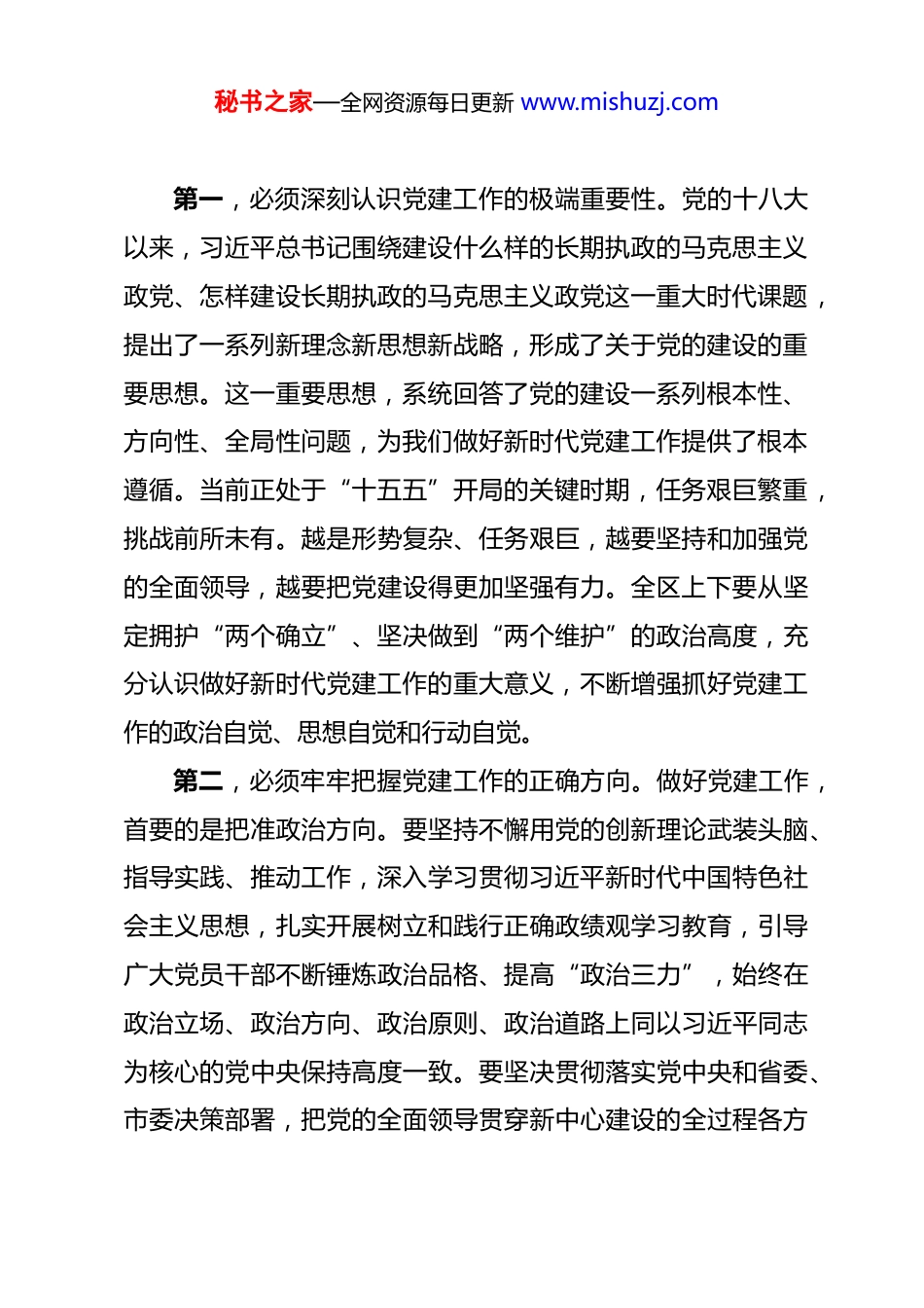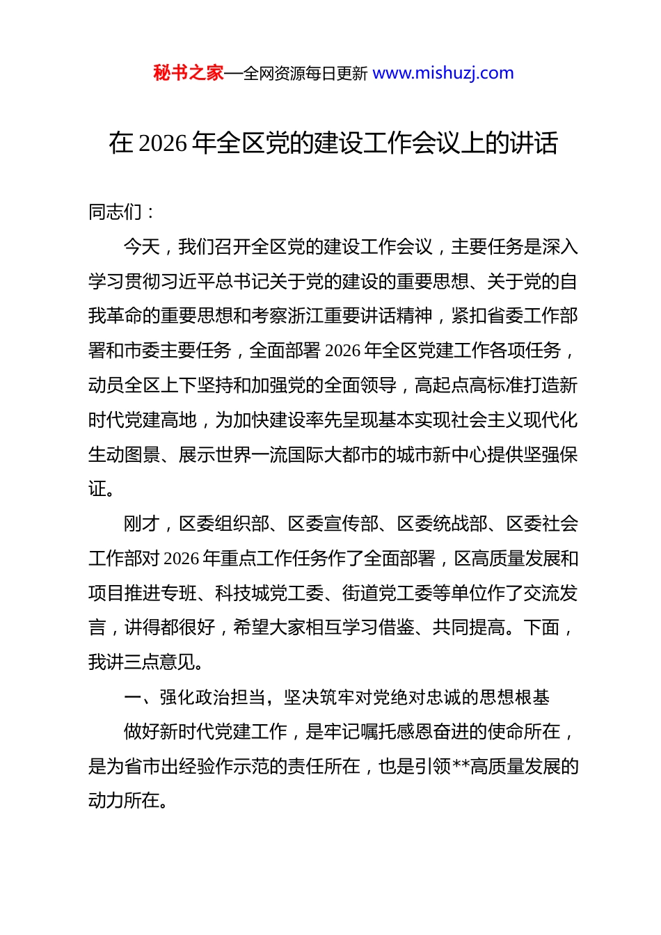 秘书之家—全网资源每日更新 www.mishuzj.com在 2026 年全区党的建设工作会议上的讲话 同志们:今天,我们召开全区党的建设工作会议,主要任务是深入学习贯彻习近平总书记关于党的建设的重要思想、关于党的自我革命的重要思想和考察浙江重要讲话精神,紧扣省委工作部署和市委主要任务,全面部署 2026 年全区党建工作各项任务,动员全区上下坚持和加强党的全面领导,高起点高标准打造新时代党建高地,为加快建设率先呈现基本实现社会主义现代化生动图景、展示世界一流国际大都市的城市新中心提供坚强保证。刚才,区委组织部、区委宣传部、区委统战部、区委社会工作部对 2026 年重点工作任务作了全面部署,区高质量发展和项目推进专班、科技城党工委、街道党工委等单位作了交流发言,讲得都很好,希望大家相互学习借鉴、共同提高。下面,我讲三点意见。一、强化政治担当,坚决筑牢对党绝对忠诚的思想根基做好新时代党建工作,是牢记嘱托感恩奋进的使命所在,是为省市出经验作示范的责任所在,也是引领**高质量发展的动力所在。秘书之家—全网资源每日更新 www.mishuzj.com第一,必须深刻认识党建工作的极端重要性。党的十八大以来,习近平总书记围绕建设什么样的长期执政的马克思主义政党、怎样建设长期执政的马克思主义政党这一重大时代课题,提出了一系列新理念新思想新战略,形成了关于党的建设的重要思想。这一重要思想,系统回答了党的建设一系列根本性、方向性、全局性问题,为我们做好新时代党建工作提供了根本遵循。当前正处于“十五五”开局的关键时期,任务艰巨繁重,挑战前所未有。越是形势复杂、任务艰巨,越要坚持和加强党的全面领导,越要把党建设得更加坚强有力。全区上下要从坚定拥护“两个确立”、坚决做到“两个维护”的政治高度,充分认识做好新时代党建工作的重大意义,不断增强抓好党建工作的政治自觉、思想自觉和行动自觉。第二,必须牢牢把握党建工作的正确方向。做好党建工作,首要的是把准政治方向。要坚持不懈用党的创新理论武装头脑、指导实践、推动工作,深入学习贯彻习近平新时代中国特色社会主义思想,扎实开展树立和践行正确政绩观学习教育,引导广大党员干部不断锤炼政治品格、提高“政治三力”,始终在政治立场、政治方向、政治原则、政治道路上同以习近平同志为核心的党中央保持高度一致。要坚决贯彻落实党中央和省委、市委决策部署,把党的全面领导贯穿新中心建设的全过程各方秘书之家—全网资源每日更新 www.mishuzj.com面,确保各项工作始终沿着正确方向前进。第三,必须切实增强党建工作的使命担当。作为全省首批“红色根脉”强基示范区,**肩负着为全省乃至全国基层党建工作探路先行、创造经验的重大责任。当前,全省正在深入实施“132”总体工作部署,高质量发展是首要任务,缩小“三大差距”是主攻方向,满足人民群众对美好生活的需要是根本目的。全市也在全力推动“七个重大突破”,包括人工智能创新发展第一城建设、构建现代化产业体系、共同富裕先行示范、绿色低碳转型、“文化+”融合发展、城市治理科学化精细化智慧化等方面实现重大突破。**作为经济大区、创新强区,必须在落实省委、市委决策部署上走在前列、作出示范,以高质量党建引领高质量发展,以优异成绩回报组织的信任和人民的重托。二、聚焦重点发力,加快打造党建赋能发展的硬核成果2026 年是“十五五”开局之年,也是“三年大变样”决战决胜之年。全区党建工作要紧扣中心大局,突出重点关键,以高质量党建为经济社会高质量发展提供坚强保障。(一)把党的政治建设摆在首位,锻造绝对忠诚的政治品格政治建设是党的根本性建设,决定党的建设方向和效果。秘书之家—全网资源每日更新 www.mishuzj.com要坚持把政治建设摆在首位,教育引导广大党员干部始终做政治上的明白人、老实人。一是筑牢思想根基。深入实施党的创新理论学习教育计划,用好“循迹溯源”理论研究和宣传阐释机制,持续推动习近平新时代中国特色社会主义思想入脑入心、见行见效。要深化文化建设“八项工程”,以法治**建设 20 年为新起点,推动党的创新理论内化于心、外化于行。二是严明政治纪律...