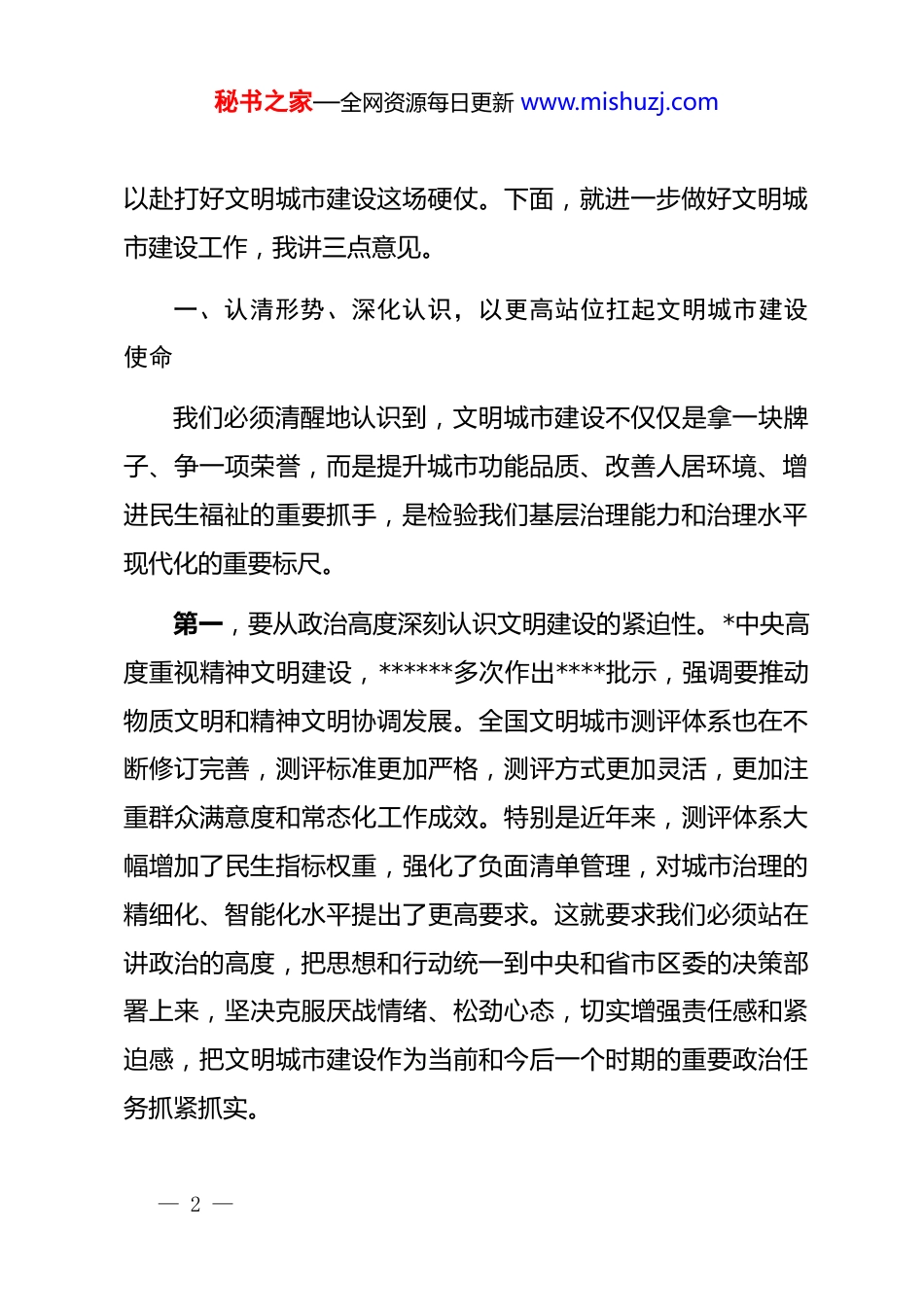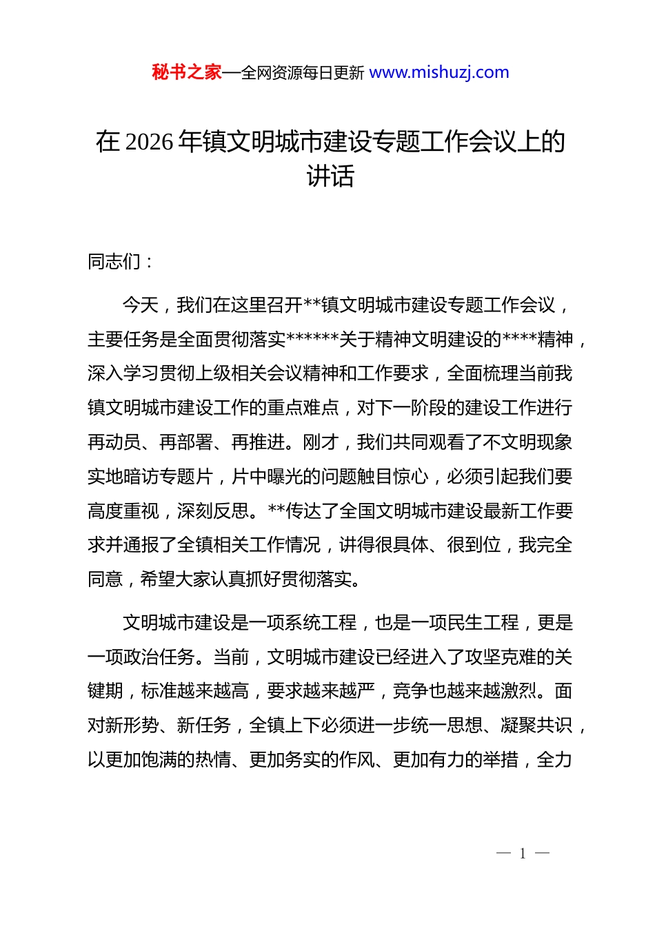 秘书之家—全网资源每日更新 www.mishuzj.com在 2026 年镇文明城市建设专题工作会议上的讲话同志们:今天,我们在这里召开**镇文明城市建设专题工作会议,主要任务是全面贯彻落实******关于精神文明建设的****精神,深入学习贯彻上级相关会议精神和工作要求,全面梳理当前我镇文明城市建设工作的重点难点,对下一阶段的建设工作进行再动员、再部署、再推进。刚才,我们共同观看了不文明现象实地暗访专题片,片中曝光的问题触目惊心,必须引起我们要高度重视,深刻反思。**传达了全国文明城市建设最新工作要求并通报了全镇相关工作情况,讲得很具体、很到位,我完全同意,希望大家认真抓好贯彻落实。文明城市建设是一项系统工程,也是一项民生工程,更是一项政治任务。当前,文明城市建设已经进入了攻坚克难的关键期,标准越来越高,要求越来越严,竞争也越来越激烈。面对新形势、新任务,全镇上下必须进一步统一思想、凝聚共识,以更加饱满的热情、更加务实的作风、更加有力的举措,全力— 1 —秘书之家—全网资源每日更新 www.mishuzj.com以赴打好文明城市建设这场硬仗。下面,就进一步做好文明城市建设工作,我讲三点意见。一、认清形势、深化认识,以更高站位扛起文明城市建设使命我们必须清醒地认识到,文明城市建设不仅仅是拿一块牌子、争一项荣誉,而是提升城市功能品质、改善人居环境、增进民生福祉的重要抓手,是检验我们基层治理能力和治理水平现代化的重要标尺。第一,要从政治高度深刻认识文明建设的紧迫性。*中央高度重视精神文明建设,******多次作出****批示,强调要推动物质文明和精神文明协调发展。全国文明城市测评体系也在不断修订完善,测评标准更加严格,测评方式更加灵活,更加注重群众满意度和常态化工作成效。特别是近年来,测评体系大幅增加了民生指标权重,强化了负面清单管理,对城市治理的精细化、智能化水平提出了更高要求。这就要求我们必须站在讲政治的高度,把思想和行动统一到中央和省市区委的决策部署上来,坚决克服厌战情绪、松劲心态,切实增强责任感和紧迫感,把文明城市建设作为当前和今后一个时期的重要政治任务抓紧抓实。— 2 —秘书之家—全网资源每日更新 www.mishuzj.com第二,要从发展维度深刻认识文明建设的重要性。城市环境就是营商环境,城市形象就是发展形象。一个城市管理有序、环境优美、风气良好,不仅能提升居民的归属感和自豪感,更能吸引更多的人才、资本和项目,为高质量发展注入强劲动力。当前,各地都在通过优化城市环境来提升综合竞争力,如果我们稍微松懈,就会在激烈的竞争中掉队。因此,我们必须把文明城市建设融入经济社会发展全局,通过完善基础设施、优化公共服务、提升治理效能,打造宜居宜业宜游的优质环境,为**镇的高质量发展提供坚实支撑。第三,要从民生角度深刻认识文明建设的必要性。文明城市建设测评体系中的每一项指标,如基础设施建设、环境卫生整治、公共服务提升等,都直接关系群众的衣食住行,关系群众的切身利益。我们在暗访片中看到的背街小巷脏乱差、车辆乱停乱放、基础设施损坏等问题,都是群众反映强烈的操心事、烦心事、揪心事。推进文明城市建设,就是要坚持问题导向,从群众最关心、最直接、最现实的利益问题入手,一件一件抓落实,一项一项求突破,切实解决群众的急难愁盼问题,不断提升群众的获得感、幸福感和安全感。二、聚焦问题、靶向发力,以更实举措推动重点难点稳步— 3 —秘书之家—全网资源每日更新 www.mishuzj.com破解刚才暗访片反映的问题,只是冰山一角。全镇上下必须坚持问题导向,对照测评体系标准,逐一排查、逐一过关,集中力量、集聚资源,查漏补缺、固强补弱,坚决打赢文明城市建设攻坚战。第一,聚焦主次干道和交通路口,在文明交通上攻坚突破。交通秩序是城市文明的窗口,也是管理的难点。要紧紧围绕主次干道、主要交通路口等重点区域,持续开展交通秩序大整治。要严查各类交通违法行为,重点整治机动车乱停乱放、非机动车闯红灯、逆行、行人不走斑马线等顽疾。要加强交通基础设施建设,对标线不清、标志缺失、信号灯故障等问题进行全面排查整改。要优化...