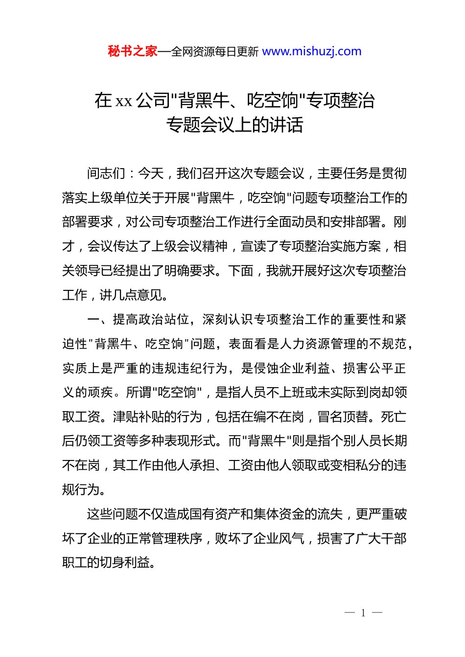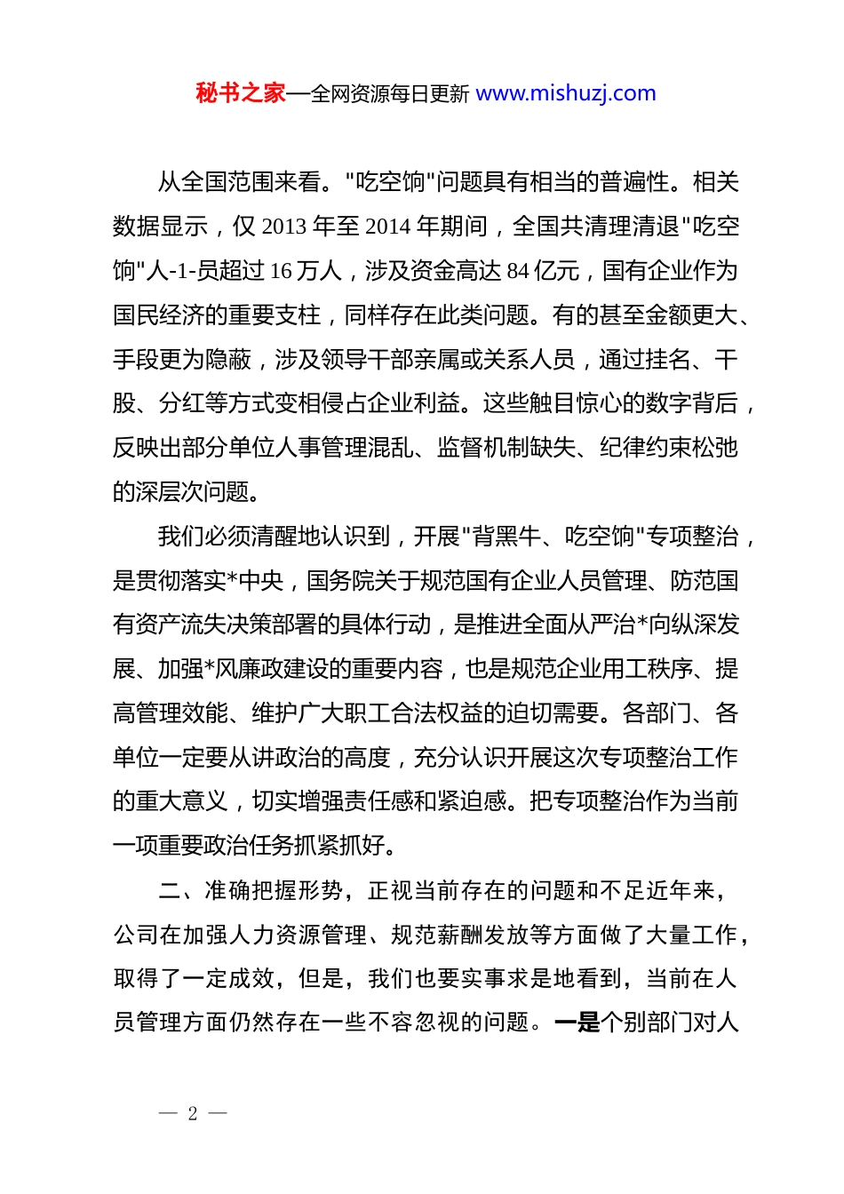 秘书之家—全网资源每日更新 www.mishuzj.com在 xx 公司"背黑牛、吃空饷"专项整治专题会议上的讲话间志们:今天,我们召开这次专题会议,主要任务是贯彻落实上级单位关于开展"背黑牛,吃空饷"问题专项整治工作的部署要求,对公司专项整治工作进行全面动员和安排部署。刚才,会议传达了上级会议精神,宣读了专项整治实施方案,相关领导已经提出了明确要求。下面,我就开展好这次专项整治工作,讲几点意见。一、提高政治站位,深刻认识专项整治工作的重要性和紧迫性"背黑牛、吃空饷"问题,表面看是人力资源管理的不规范,实质上是严重的违规违纪行为,是侵蚀企业利益、损害公平正义的顽疾。所谓"吃空饷",是指人员不上班或未实际到岗却领取工资。津贴补贴的行为,包括在编不在岗,冒名顶替。死亡后仍领工资等多种表现形式。而"背黑牛"则是指个别人员长期不在岗,其工作由他人承担、工资由他人领取或变相私分的违规行为。这些问题不仅造成国有资产和集体资金的流失,更严重破坏了企业的正常管理秩序,败坏了企业风气,损害了广大干部职工的切身利益。— 1 —秘书之家—全网资源每日更新 www.mishuzj.com从全国范围来看。"吃空饷"问题具有相当的普遍性。相关数据显示,仅 2013 年至 2014 年期间,全国共清理清退"吃空饷"人-1-员超过 16 万人,涉及资金高达 84 亿元,国有企业作为国民经济的重要支柱,同样存在此类问题。有的甚至金额更大、手段更为隐蔽,涉及领导干部亲属或关系人员,通过挂名、干股、分红等方式变相侵占企业利益。这些触目惊心的数字背后,反映出部分单位人事管理混乱、监督机制缺失、纪律约束松弛的深层次问题。我们必须清醒地认识到,开展"背黑牛、吃空饷"专项整治,是贯彻落实*中央,国务院关于规范国有企业人员管理、防范国有资产流失决策部署的具体行动,是推进全面从严治*向纵深发展、加强*风廉政建设的重要内容,也是规范企业用工秩序、提高管理效能、维护广大职工合法权益的迫切需要。各部门、各单位一定要从讲政治的高度,充分认识开展这次专项整治工作的重大意义,切实增强责任感和紧迫感。把专项整治作为当前一项重要政治任务抓紧抓好。二、准确把握形势,正视当前存在的问题和不足近年来,公司在加强人力资源管理、规范薪酬发放等方面做了大量工作,取得了一定成效,但是,我们也要实事求是地看到,当前在人员管理方面仍然存在一些不容忽视的问题。一是个别部门对人— 2 —秘书之家—全网资源每日更新 www.mishuzj.com员管理重视不够,考勤制度执行不严,存在迟到早退。脱尚漏岗等现象;二是人员信息档案管理不够规范,调入调出手续办理不及时,导致工资发放与实际在岗情况存在偏差;三是监督检查机制不够健全,日常监管存在盲区和死角;四是制度执行不够到位,有的制度停留在纸面上,没有真正落地见效。从审计监督和专项检查反馈的情况来看,"吃空饷"问题在国有企业中的常见漏洞主要包括:内部审计与监督机制不到位,导致问题长期存在;信息不透明,缺乏有效的监督机制;个别单位对专项整治工作重视不够,存在自查自纠走过场现象;人事管理和财务审计衔接不够紧密,给违规行为留下了可乘之机。这些问题的存在,既有主观认识上的原因,也有制度机制上的缺陷,必须引起我们高度重视,采取有力措施加以解决。三、明确目标任务,扎实推进专项整治各项工作根据上级统一部署和公司实施方案安排,此次专项整治工作分为动员部署、自查自纠、监督检查、整改查处、总结提升五个阶段。各部门要严格按照时间节点和工作要求,有序推进各项工作。第一,全面开展自查自纠,自查自纠是专项整治的基础环节,必须做到全面覆盖、不留死角。企管部作为牵头部门,要组织各部门对现有在岗人员情况进行全面清查,重点核查编制、— 3 —秘书之家—全网资源每日更新 www.mishuzj.com档案、岗位、人头、工资"五要素",做到查身份、查调入调出关系、查工资底册、查手续、查在岗情况"五查三对照"。自查过程要认真细致、实事求是,不走过场,不搞形式主义。要逐人逐项核对,建立详细的工作台账,确保数据真实准确,对自查中发现的问题,要如实登记、主动报告,不...