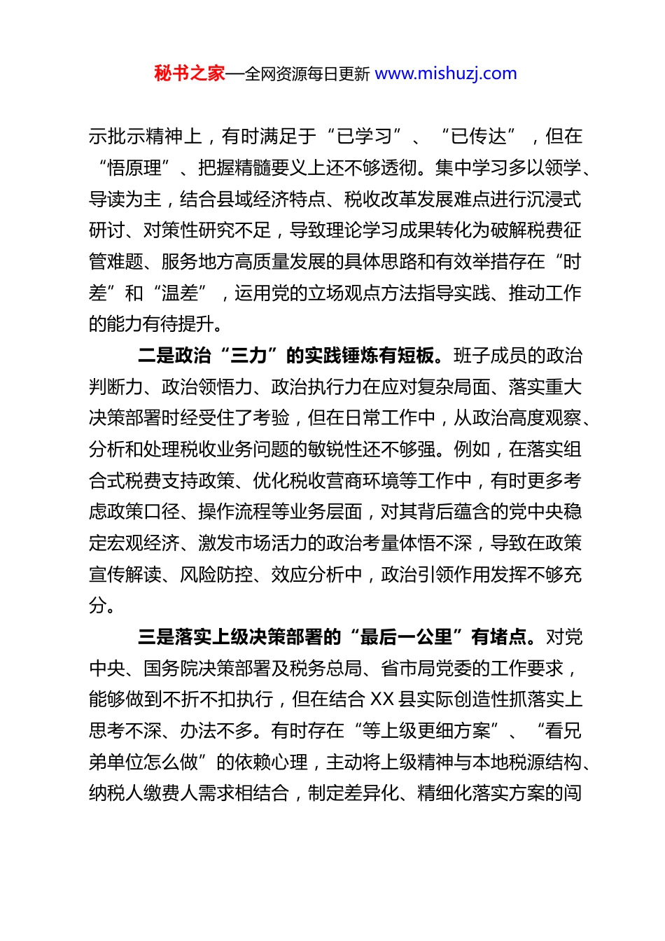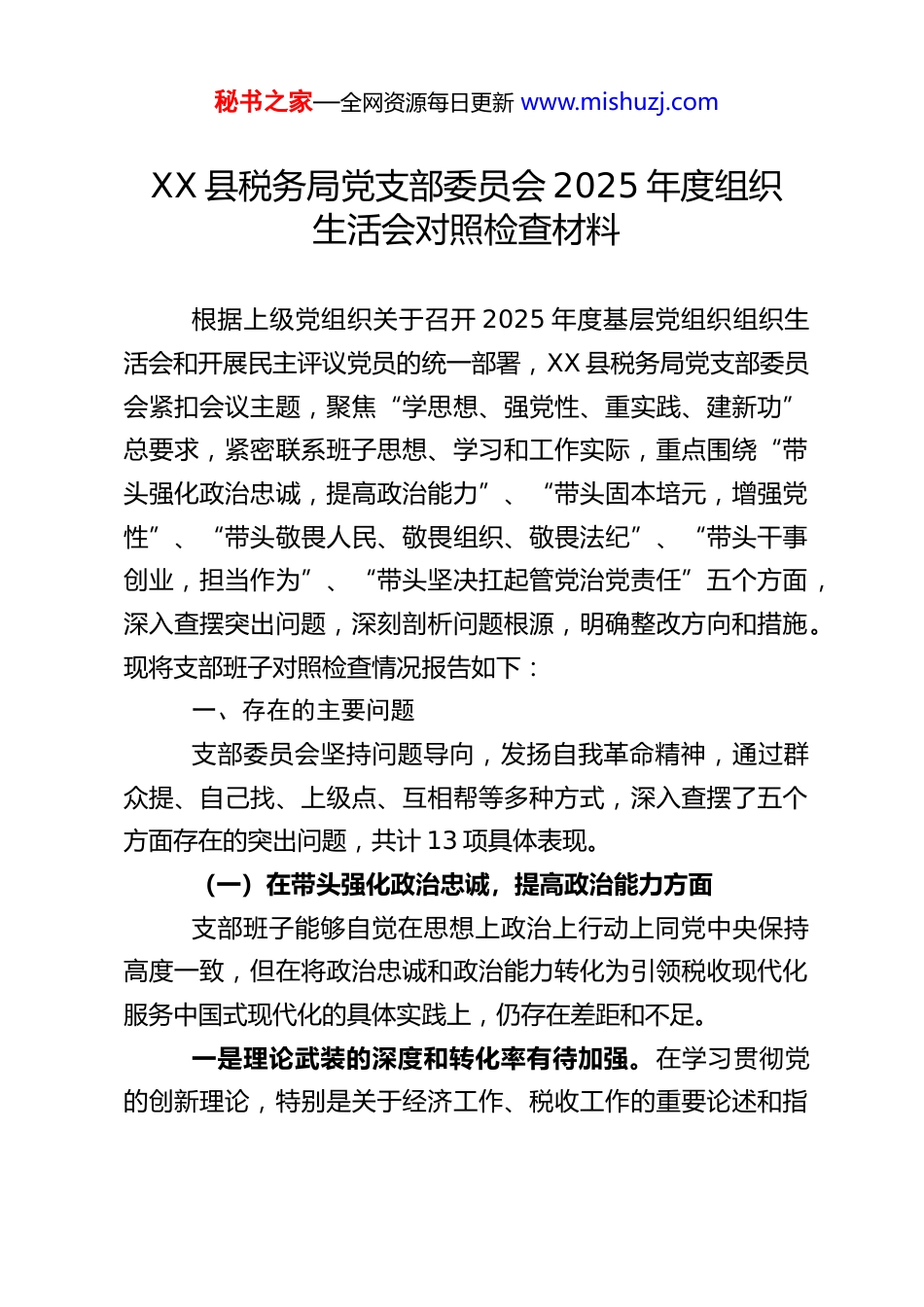 秘书之家—全网资源每日更新 www.mishuzj.comXX 县税务局党支部委员会 2025 年度组织生活会对照检查材料根据上级党组织关于召开 2025 年度基层党组织组织生活会和开展民主评议党员的统一部署,XX 县税务局党支部委员会紧扣会议主题,聚焦“学思想、强党性、重实践、建新功”总要求,紧密联系班子思想、学习和工作实际,重点围绕“带头强化政治忠诚,提高政治能力”、“带头固本培元,增强党性”、“带头敬畏人民、敬畏组织、敬畏法纪”、“带头干事创业,担当作为”、“带头坚决扛起管党治党责任”五个方面,深入查摆突出问题,深刻剖析问题根源,明确整改方向和措施。现将支部班子对照检查情况报告如下:一、存在的主要问题支部委员会坚持问题导向,发扬自我革命精神,通过群众提、自己找、上级点、互相帮等多种方式,深入查摆了五个方面存在的突出问题,共计 13 项具体表现。(一)在带头强化政治忠诚,提高政治能力方面支部班子能够自觉在思想上政治上行动上同党中央保持高度一致,但在将政治忠诚和政治能力转化为引领税收现代化服务中国式现代化的具体实践上,仍存在差距和不足。一是理论武装的深度和转化率有待加强。在学习贯彻党的创新理论,特别是关于经济工作、税收工作的重要论述和指秘书之家—全网资源每日更新 www.mishuzj.com示批示精神上,有时满足于“已学习”、“已传达”,但在“悟原理”、把握精髓要义上还不够透彻。集中学习多以领学、导读为主,结合县域经济特点、税收改革发展难点进行沉浸式研讨、对策性研究不足,导致理论学习成果转化为破解税费征管难题、服务地方高质量发展的具体思路和有效举措存在“时差”和“温差”,运用党的立场观点方法指导实践、推动工作的能力有待提升。二是政治“三力”的实践锤炼有短板。班子成员的政治判断力、政治领悟力、政治执行力在应对复杂局面、落实重大决策部署时经受住了考验,但在日常工作中,从政治高度观察、分析和处理税收业务问题的敏锐性还不够强。例如,在落实组合式税费支持政策、优化税收营商环境等工作中,有时更多考虑政策口径、操作流程等业务层面,对其背后蕴含的党中央稳定宏观经济、激发市场活力的政治考量体悟不深,导致在政策宣传解读、风险防控、效应分析中,政治引领作用发挥不够充分。三是落实上级决策部署的“最后一公里”有堵点。对党中央、国务院决策部署及税务总局、省市局党委的工作要求,能够做到不折不扣执行,但在结合 XX 县实际创造性抓落实上思考不深、办法不多。有时存在“等上级更细方案”、“看兄弟单位怎么做”的依赖心理,主动将上级精神与本地税源结构、纳税人缴费人需求相结合,制定差异化、精细化落实方案的闯秘书之家—全网资源每日更新 www.mishuzj.com劲不足,导致部分政策在基层落地时效果未能最大化,服务的精准性和治理的有效性有待提高。(二)在带头固本培元,增强党性方面支部班子能够认识到党性锻炼的终身性,注重加强党性修养,但在常态化、高标准进行党性锤炼方面,仍有提升空间,个体党员的党性修养与坚强组织战斗堡垒的要求匹配度需进一步增强。一是党性修养的常态化锤炼有所松懈。班子成员能够参加组织生活,完成规定动作,但有时将党内政治生活视为“任务”而非“熔炉”,对照党章党规党纪进行自我检视、自我净化、自我提高的主动性和频次不足。在繁忙的税收工作之余,静下心来重温入党誓词、回顾初心使命、进行思想“除尘”的时间被挤压,导致理想信念的根基在潜移默化中可能出现松动,艰苦奋斗、无私奉献的革命精神有所淡化,个别时候存在追求工作、生活舒适度的倾向。二是组织观念和纪律意识的刚性约束有待强化。能够自觉遵守党的组织原则,执行组织决定,但在处理个人与组织关系时,有时“个体”意识会不自觉地冒头。例如,在执行某些临时性、攻坚性任务时,偶尔会产生“是否影响本职工作”、“能否调整时间”等想法,未能完全做到“组织有号召、党员有行动,组织有部署、个人无条件”。在严肃党内政治生活方面,运用批评和自我批评武器还不够经常、不够有力,自我批秘书之家—全网资源每日更新 www.mishuzj.com评有时“避实就虚”,相互批评...