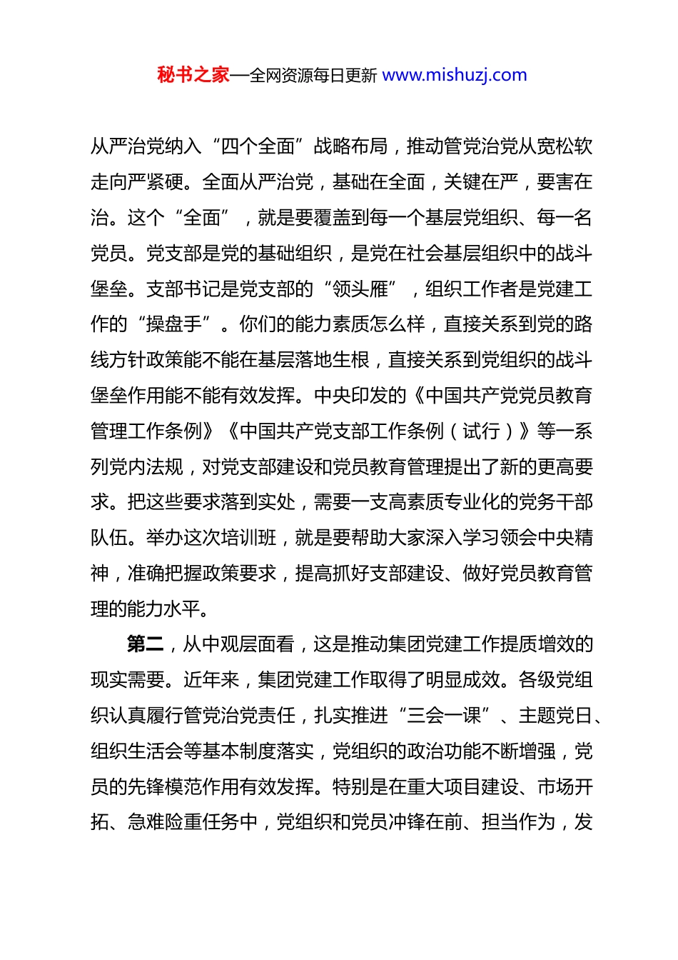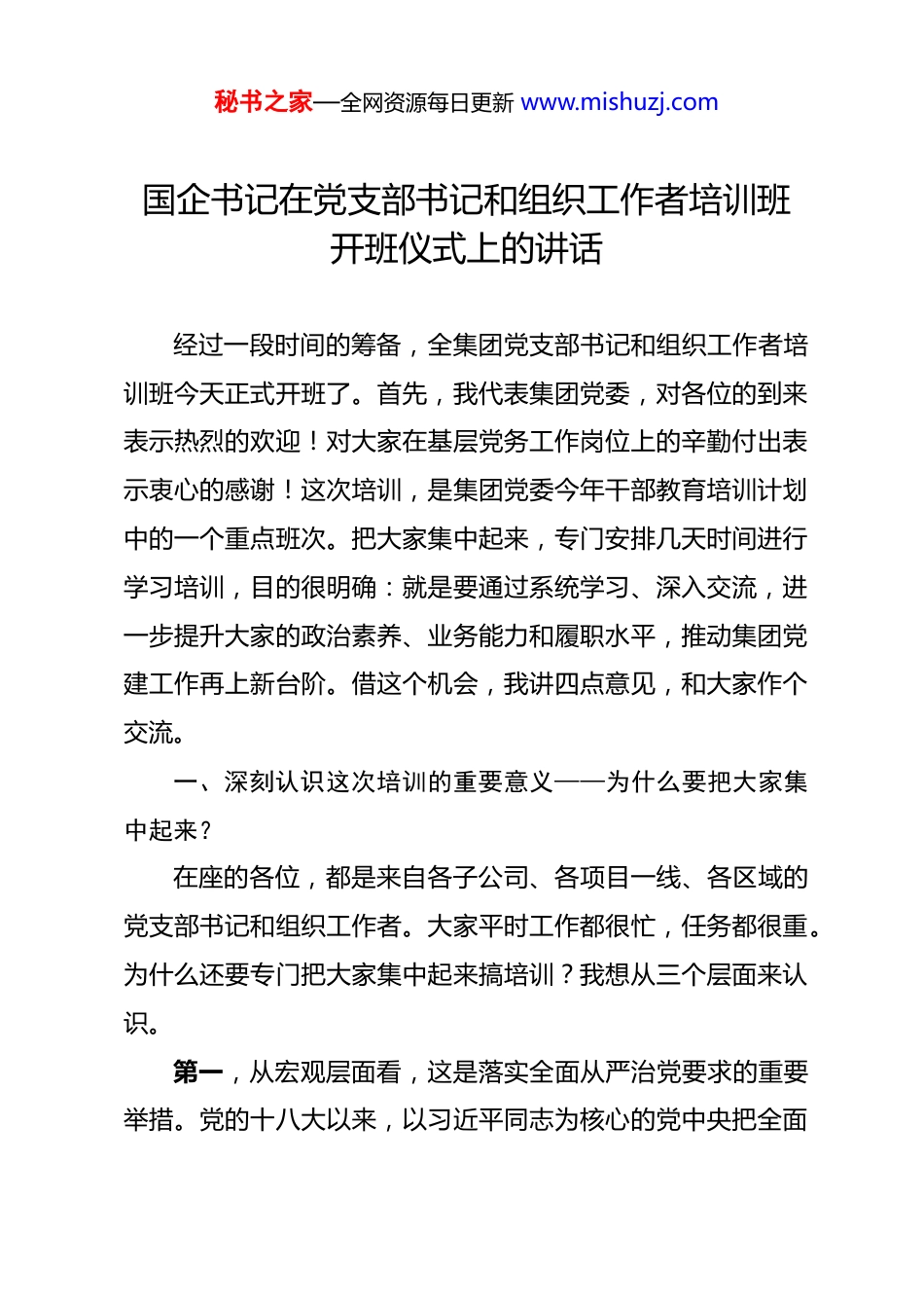 秘书之家—全网资源每日更新 www.mishuzj.com国企书记在党支部书记和组织工作者培训班开班仪式上的讲话 经过一段时间的筹备,全集团党支部书记和组织工作者培训班今天正式开班了。首先,我代表集团党委,对各位的到来表示热烈的欢迎!对大家在基层党务工作岗位上的辛勤付出表示衷心的感谢!这次培训,是集团党委今年干部教育培训计划中的一个重点班次。把大家集中起来,专门安排几天时间进行学习培训,目的很明确:就是要通过系统学习、深入交流,进一步提升大家的政治素养、业务能力和履职水平,推动集团党建工作再上新台阶。借这个机会,我讲四点意见,和大家作个交流。一、深刻认识这次培训的重要意义——为什么要把大家集中起来?在座的各位,都是来自各子公司、各项目一线、各区域的党支部书记和组织工作者。大家平时工作都很忙,任务都很重。为什么还要专门把大家集中起来搞培训?我想从三个层面来认识。第一,从宏观层面看,这是落实全面从严治党要求的重要举措。党的十八大以来,以习近平同志为核心的党中央把全面秘书之家—全网资源每日更新 www.mishuzj.com从严治党纳入“四个全面”战略布局,推动管党治党从宽松软走向严紧硬。全面从严治党,基础在全面,关键在严,要害在治。这个“全面”,就是要覆盖到每一个基层党组织、每一名党员。党支部是党的基础组织,是党在社会基层组织中的战斗堡垒。支部书记是党支部的“领头雁”,组织工作者是党建工作的“操盘手”。你们的能力素质怎么样,直接关系到党的路线方针政策能不能在基层落地生根,直接关系到党组织的战斗堡垒作用能不能有效发挥。中央印发的《中国共产党党员教育管理工作条例》《中国共产党支部工作条例(试行)》等一系列党内法规,对党支部建设和党员教育管理提出了新的更高要求。把这些要求落到实处,需要一支高素质专业化的党务干部队伍。举办这次培训班,就是要帮助大家深入学习领会中央精神,准确把握政策要求,提高抓好支部建设、做好党员教育管理的能力水平。第二,从中观层面看,这是推动集团党建工作提质增效的现实需要。近年来,集团党建工作取得了明显成效。各级党组织认真履行管党治党责任,扎实推进“三会一课”、主题党日、组织生活会等基本制度落实,党组织的政治功能不断增强,党员的先锋模范作用有效发挥。特别是在重大项目建设、市场开拓、急难险重任务中,党组织和党员冲锋在前、担当作为,发秘书之家—全网资源每日更新 www.mishuzj.com挥了重要作用。但也要清醒看到,我们的党建工作还存在一些不容忽视的问题。有的支部组织生活流于形式。有的支部党建工作和业务工作结合不紧。有的支部书记能力素质有待提升,对党务知识一知半解,开展工作没有章法。有的组织工作者责任心不强,工作粗枝大叶。有的党员教育管理抓得不严,对苗头性倾向性问题提醒不够、监督不力。这些问题,虽然表现在基层,但根子在思想认识、在能力素质。举办这次培训班,就是要帮助大家查漏补缺、充电赋能,把短板补齐、把弱项补强,推动集团党建工作整体提升、全面过硬。第三,从微观层面看,这是提升党务干部履职能力的有效途径。在座的各位,有的是老党务,经验丰富;有的是新兵,刚刚走上党务岗位。无论新老,都有一个持续学习、不断提升的问题。党务工作是一门学问,专业性很强。党内法规体系庞杂,政策要求不断更新,工作方法需要创新。如果不学习、不钻研,就跟不上形势任务的要求,就干不好本职工作。比如,发展党员工作,程序要求严、时间节点多、材料标准高,稍有不慎就可能出问题。比如,组织生活怎么开才能既有辣味又有温度?主题党日怎么搞才能既有意义又有吸引力?党员教育怎么抓才能入脑入心?这些都是需要深入研究的课题。举办这次培训班,就是给大家提供一个集中学习、交流研讨的平台。通秘书之家—全网资源每日更新 www.mishuzj.com过专家授课、经验分享、案例教学、分组讨论等多种形式,帮助大家开阔视野、增长知识、提升能力。希望大家珍惜这次机会,静下心来、沉下身子,认认真真学点东西。二、准确把握党支部书记和组织工作者的职责使命——你们肩负着什么样的责任?作为党支部书记和组织工...