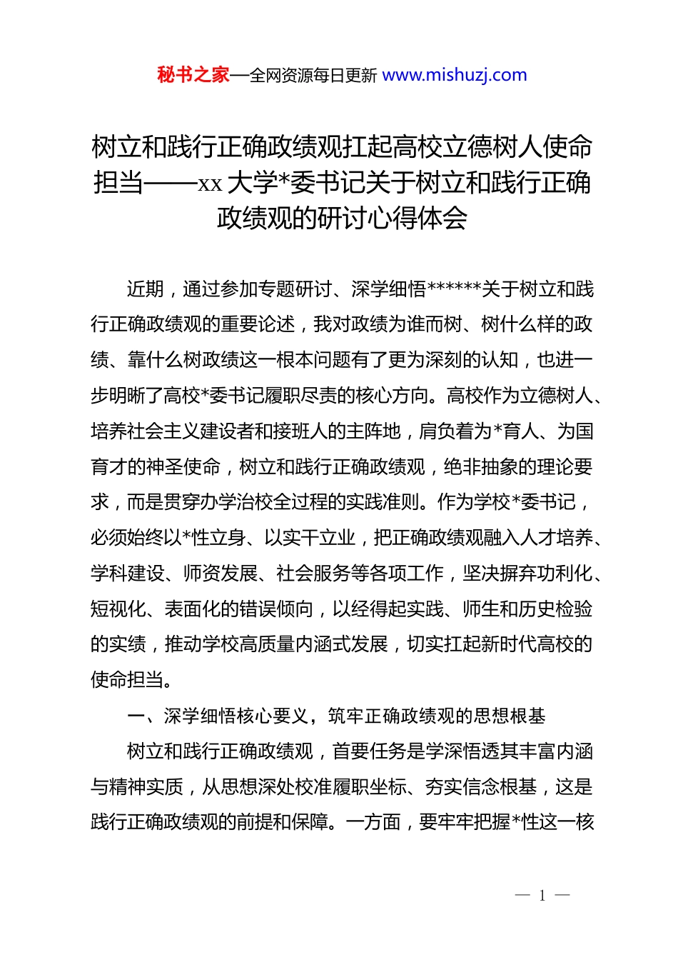 秘书之家—全网资源每日更新 www.mishuzj.com树立和践行正确政绩观扛起高校立德树人使命担当——xx 大学*委书记关于树立和践行正确政绩观的研讨心得体会近期,通过参加专题研讨、深学细悟******关于树立和践行正确政绩观的重要论述,我对政绩为谁而树、树什么样的政绩、靠什么树政绩这一根本问题有了更为深刻的认知,也进一步明晰了高校*委书记履职尽责的核心方向。高校作为立德树人、培养社会主义建设者和接班人的主阵地,肩负着为*育人、为国育才的神圣使命,树立和践行正确政绩观,绝非抽象的理论要求,而是贯穿办学治校全过程的实践准则。作为学校*委书记,必须始终以*性立身、以实干立业,把正确政绩观融入人才培养、学科建设、师资发展、社会服务等各项工作,坚决摒弃功利化、短视化、表面化的错误倾向,以经得起实践、师生和历史检验的实绩,推动学校高质量内涵式发展,切实扛起新时代高校的使命担当。一、深学细悟核心要义,筑牢正确政绩观的思想根基树立和践行正确政绩观,首要任务是学深悟透其丰富内涵与精神实质,从思想深处校准履职坐标、夯实信念根基,这是践行正确政绩观的前提和保障。一方面,要牢牢把握*性这一核— 1 —秘书之家—全网资源每日更新 www.mishuzj.com心关键,******强调,树立和践行正确政绩观,起决定性作用的是*性。*性纯正则政绩观端正,*性弱化则政绩观跑偏,作为高校*员领导干部,必须始终坚守对*忠诚的政治本色,把讲政治贯穿办学治校各环节,坚决贯彻*的教育方针,确保学校发展始终沿着正确政治方向前行,杜绝违背教育规律、背离育人初心的政绩行为。另一方面,要牢牢坚守为民造福的价值导向,共产*人的政绩,说到底就是为民造福,对高校而言,“为民”就是为师生谋福祉、为国家育人才,要始终把师生满意不满意、学生成长成才成效好不好、社会认可度高不高,作为衡量办学政绩的根本标准,坚决摒弃重“显绩”轻“潜绩”、重形式轻实效的错误认知。同时,要立足高校特殊属性找准政绩定位,高校的政绩不同于经济社会发展的显性指标,核心是育人成效、办学质量、学术贡献,必须摒弃盲目追排名、扩规模、搞形象工程的浮躁心态,坚守教育初心,专注内涵发展,把功夫下在夯实办学根基、提升育人质量上。二、立足高校办学实际,认清践行正确政绩观的现实紧迫性当前,高等教育迈入高质量发展新阶段,高校面临着内涵提升、转型发展、服务大局的多重任务,越是任务艰巨,越需要以正确政绩观领航定向,纠偏正向、攻坚克难。从办学发展— 2 —秘书之家—全网资源每日更新 www.mishuzj.com需求来看,新时代高等教育竞争日趋激烈,粗放式发展、表面化建设已无立足之地,唯有树立正确政绩观,坚持稳中求进、久久为功,才能破解学科建设短板、人才培养质量不高、师资队伍建设滞后等发展难题,推动学校从规模扩张向质量提升转型。从纠治偏差现实需要来看,当前部分高校仍存在政绩观错位的问题,有的重科研轻育人,把论文发表、项目获批当作核心政绩,忽视课堂教学、学生培养这一根本;有的重短期成效轻长远规划,热衷于搞短平快项目,对打基础、利长远的工作投入不足;有的重上级评价轻师生感受,决策部署脱离师生实际需求,这些问题严重制约高校健康发展,亟需通过践行正确政绩观加以纠治。从使命担当内在要求来看,高校是科技第一生产力、人才第一资源、创新第一动力的重要结合点,肩负着服务国家战略、支撑地方发展的重任,只有树立正确政绩观,才能摒弃本位主义、功利主义,主动对接国家和区域发展需求,把办学政绩融入强国建设、民族复兴的伟大事业中,切实履行高校的社会责任与时代使命。三、锚定立德树人根本,找准践行正确政绩观的实践路径对高校而言,践行正确政绩观,核心是紧扣立德树人根本任务,把育人成效作为第一政绩,把内涵发展作为核心政绩,把师生福祉作为根本政绩,把服务大局作为重要政绩,以实打— 3 —秘书之家—全网资源每日更新 www.mishuzj.com实的举措推动办学提质增效。一是坚守育人初心,把人才培养作为核心政绩抓实抓细。始终牢记为*育人、为国育才使命,把思政教育贯穿人才培养全过程,深化思政课改革创新,推进课程...