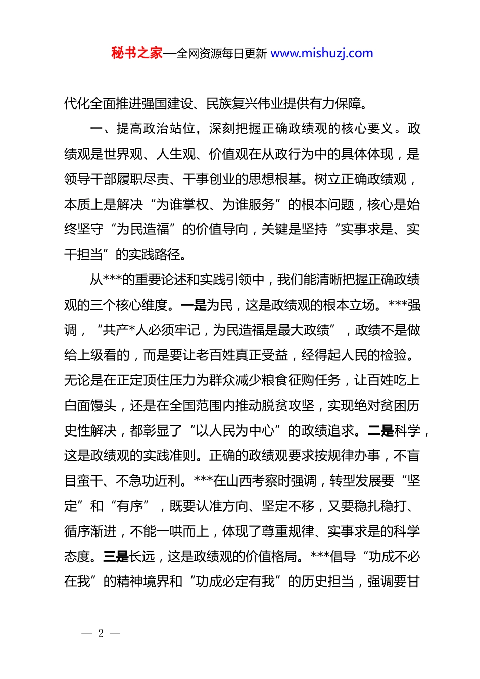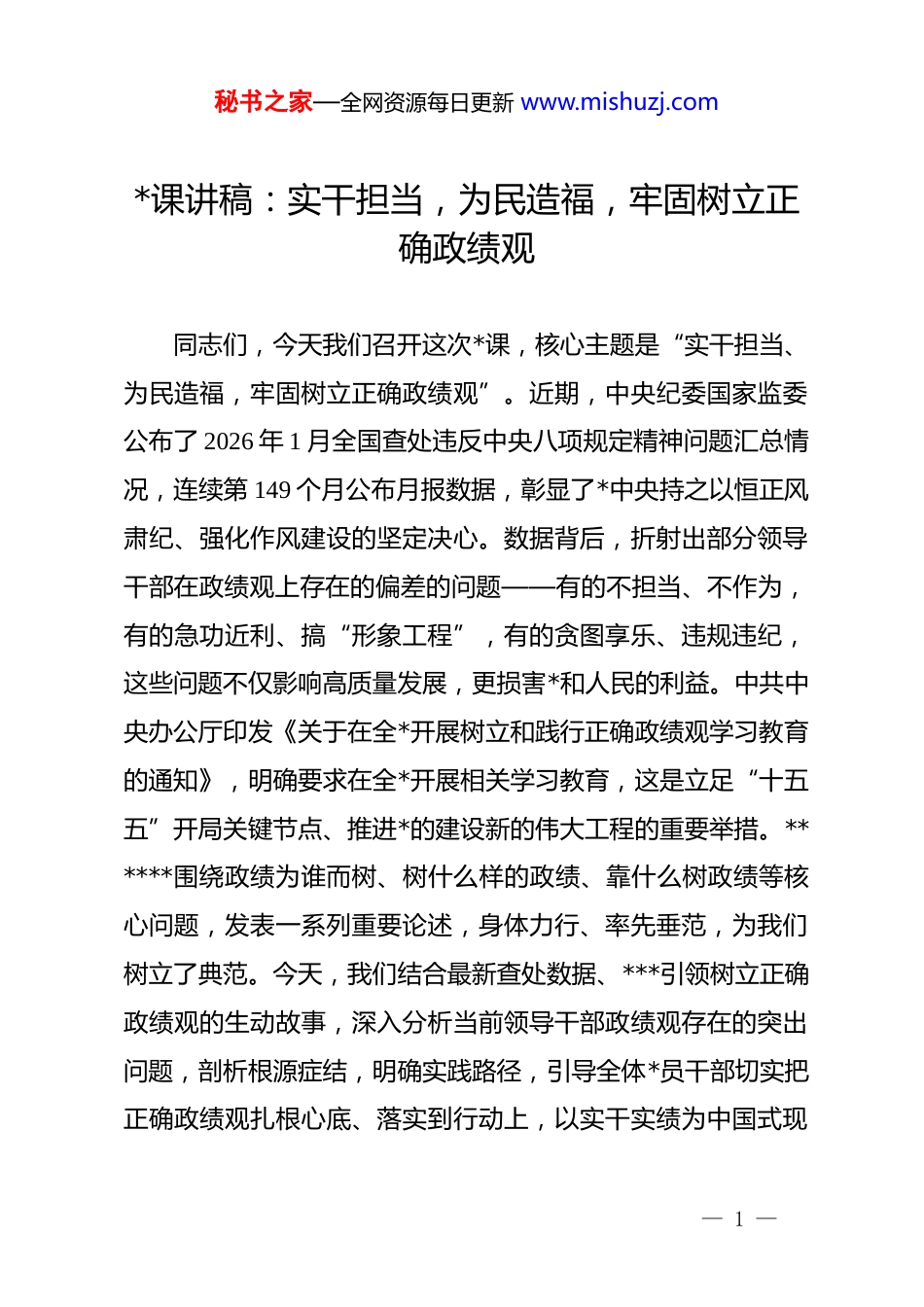 秘书之家—全网资源每日更新 www.mishuzj.com*课讲稿:实干担当,为民造福,牢固树立正确政绩观同志们,今天我们召开这次*课,核心主题是“实干担当、为民造福,牢固树立正确政绩观”。近期,中央纪委国家监委公布了 2026 年 1 月全国查处违反中央八项规定精神问题汇总情况,连续第 149 个月公布月报数据,彰显了*中央持之以恒正风肃纪、强化作风建设的坚定决心。数据背后,折射出部分领导干部在政绩观上存在的偏差的问题——有的不担当、不作为,有的急功近利、搞“形象工程”,有的贪图享乐、违规违纪,这些问题不仅影响高质量发展,更损害*和人民的利益。中共中央办公厅印发《关于在全*开展树立和践行正确政绩观学习教育的通知》,明确要求在全*开展相关学习教育,这是立足“十五五”开局关键节点、推进*的建设新的伟大工程的重要举措。******围绕政绩为谁而树、树什么样的政绩、靠什么树政绩等核心问题,发表一系列重要论述,身体力行、率先垂范,为我们树立了典范。今天,我们结合最新查处数据、***引领树立正确政绩观的生动故事,深入分析当前领导干部政绩观存在的突出问题,剖析根源症结,明确实践路径,引导全体*员干部切实把正确政绩观扎根心底、落实到行动上,以实干实绩为中国式现— 1 —秘书之家—全网资源每日更新 www.mishuzj.com代化全面推进强国建设、民族复兴伟业提供有力保障。一、提高政治站位,深刻把握正确政绩观的核心要义。政绩观是世界观、人生观、价值观在从政行为中的具体体现,是领导干部履职尽责、干事创业的思想根基。树立正确政绩观,本质上是解决“为谁掌权、为谁服务”的根本问题,核心是始终坚守“为民造福”的价值导向,关键是坚持“实事求是、实干担当”的实践路径。从***的重要论述和实践引领中,我们能清晰把握正确政绩观的三个核心维度。一是为民,这是政绩观的根本立场。***强调,“共产*人必须牢记,为民造福是最大政绩”,政绩不是做给上级看的,而是要让老百姓真正受益,经得起人民的检验。无论是在正定顶住压力为群众减少粮食征购任务,让百姓吃上白面馒头,还是在全国范围内推动脱贫攻坚,实现绝对贫困历史性解决,都彰显了“以人民为中心”的政绩追求。二是科学,这是政绩观的实践准则。正确的政绩观要求按规律办事,不盲目蛮干、不急功近利。***在山西考察时强调,转型发展要“坚定”和“有序”,既要认准方向、坚定不移,又要稳扎稳打、循序渐进,不能一哄而上,体现了尊重规律、实事求是的科学态度。三是长远,这是政绩观的价值格局。***倡导“功成不必在我”的精神境界和“功成必定有我”的历史担当,强调要甘— 2 —秘书之家—全网资源每日更新 www.mishuzj.com于做铺垫性工作,甘于抓未成之事,像山西右玉县那样,一任接着一任干,把“不毛之地”变成“塞上绿洲”,这正是长远政绩观的生动实践。结合 2026 年 1 月中央纪委通报的全国查处数据来看,当前正风肃纪的高压态势没有丝毫放松,而这些查处的问题,本质上都是政绩观扭曲导致的必然结果。从查处类型看,履职尽责方面不担当、不作为、乱作为、假作为问题占形式主义、官僚主义问题总数的 84.7%;从查处级别看,乡科级及以下干部问题占比高达 92.3%,这说明政绩观偏差问题不仅存在于各级干部中,更需要我们全员警醒、全面纠治。二十届中央纪委五次全会将强化正风肃纪、巩固拓展深入贯彻中央八项规定精神学习教育成果列为年度任务,这要求我们必须从政治高度认识政绩观问题,切实增强树立和践行正确政绩观的思想自觉、政治自觉和行动自觉。二、正视突出问题,深刻剖析当前政绩观偏差的具体表现结合中央纪委公布的数据、***指出的突出问题以及我们机关工作实际,当前部分领导干部在政绩观上存在的偏差,主要表现为以下五个方面,这些问题看似是作风问题、工作问题,实则是政治问题、*性问题。(一)形式主义、官僚主义突出,实干精神缺失。这是当前政绩观偏差最普遍的表现,也是 2026 年 1 月查处问题中占比— 3 —秘书之家—全网资源每日更新 www.mishuzj.com最高的类型。一是不担当、不作为。部分干部存在“躺平”心态,面对改革发展任务,畏难...