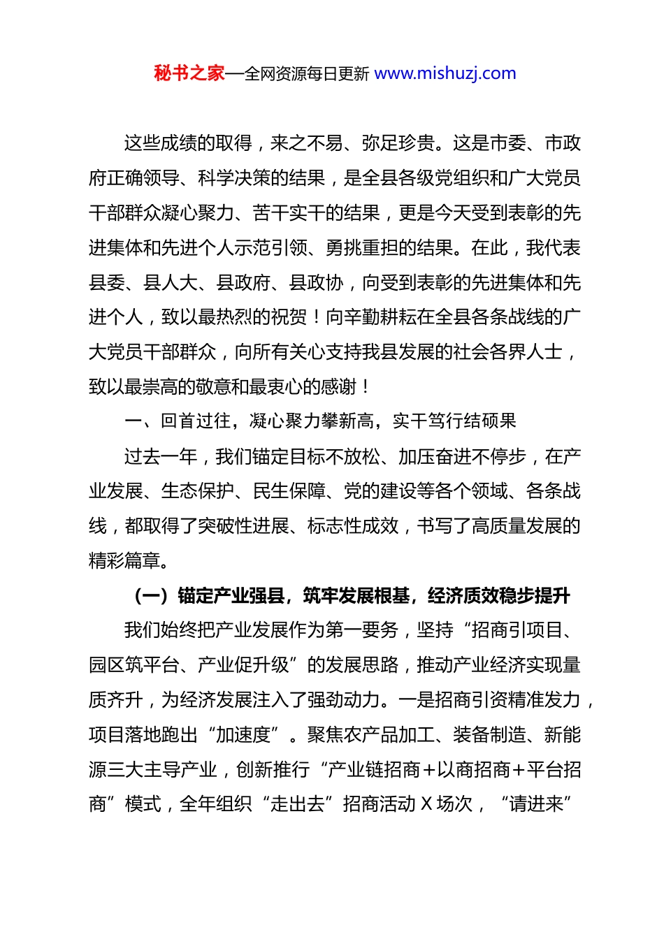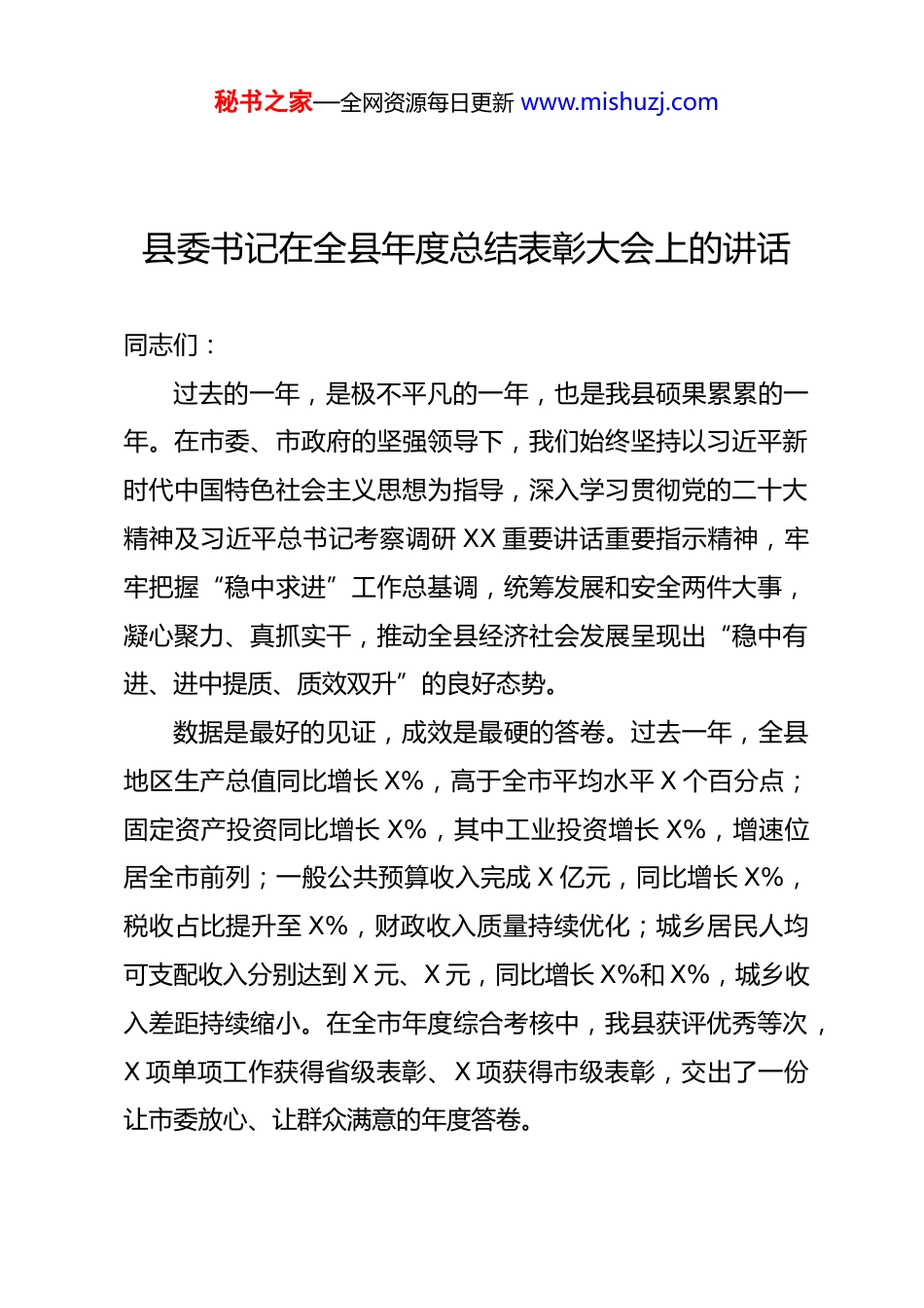 秘书之家—全网资源每日更新 www.mishuzj.com县委书记在全县年度总结表彰大会上的讲话同志们:过去的一年,是极不平凡的一年,也是我县硕果累累的一年。在市委、市政府的坚强领导下,我们始终坚持以习近平新时代中国特色社会主义思想为指导,深入学习贯彻党的二十大精神及习近平总书记考察调研 XX 重要讲话重要指示精神,牢牢把握“稳中求进”工作总基调,统筹发展和安全两件大事,凝心聚力、真抓实干,推动全县经济社会发展呈现出“稳中有进、进中提质、质效双升”的良好态势。数据是最好的见证,成效是最硬的答卷。过去一年,全县地区生产总值同比增长 X%,高于全市平均水平 X 个百分点;固定资产投资同比增长 X%,其中工业投资增长 X%,增速位居全市前列;一般公共预算收入完成 X 亿元,同比增长 X%,税收占比提升至 X%,财政收入质量持续优化;城乡居民人均可支配收入分别达到 X 元、X 元,同比增长 X%和 X%,城乡收入差距持续缩小。在全市年度综合考核中,我县获评优秀等次,X 项单项工作获得省级表彰、X 项获得市级表彰,交出了一份让市委放心、让群众满意的年度答卷。秘书之家—全网资源每日更新 www.mishuzj.com这些成绩的取得,来之不易、弥足珍贵。这是市委、市政府正确领导、科学决策的结果,是全县各级党组织和广大党员干部群众凝心聚力、苦干实干的结果,更是今天受到表彰的先进集体和先进个人示范引领、勇挑重担的结果。在此,我代表县委、县人大、县政府、县政协,向受到表彰的先进集体和先进个人,致以最热烈的祝贺!向辛勤耕耘在全县各条战线的广大党员干部群众,向所有关心支持我县发展的社会各界人士,致以最崇高的敬意和最衷心的感谢!一、回首过往,凝心聚力攀新高,实干笃行结硕果过去一年,我们锚定目标不放松、加压奋进不停步,在产业发展、生态保护、民生保障、党的建设等各个领域、各条战线,都取得了突破性进展、标志性成效,书写了高质量发展的精彩篇章。(一)锚定产业强县,筑牢发展根基,经济质效稳步提升我们始终把产业发展作为第一要务,坚持“招商引项目、园区筑平台、产业促升级”的发展思路,推动产业经济实现量质齐升,为经济发展注入了强劲动力。一是招商引资精准发力,项目落地跑出“加速度”。聚焦农产品加工、装备制造、新能源三大主导产业,创新推行“产业链招商+以商招商+平台招商”模式,全年组织“走出去”招商活动 X 场次,“请进来”秘书之家—全网资源每日更新 www.mishuzj.com考察洽谈 X 批次,成功签约亿元以上项目 X 个,总投资 X 亿元,其中 X 个项目实现当年签约、当年开工、当年投产,刷新了项目落地的“XX 速度”。特别是总投资 X 亿元的 XX 新能源产业园项目,从签约到开工仅用 X 天,目前已完成主体工程建设,预计今年 X 月投产,投产后年销售收入可达 X 亿元、税收 X 万元,将成为我县产业转型升级的“新引擎”。二是园区建设提质增效,承载能力实现“新突破”。投入 X 亿元完善园区基础设施,建成标准化厂房 X 万平方米、园区道路 X 公里,配套建设供水、供电、污水处理等基础设施 X 项,园区承载能力显著提升。深化园区体制机制改革,推行“管委会+公司”运营模式,优化营商环境,园区企业办事效率提升 X%以上。全年园区实现产值 X 亿元,同比增长 X%,占全县工业总产值的 X%,成为经济发展的“主阵地”。三是特色产业蓬勃发展,产业结构呈现“新优化”。围绕农产品加工产业,培育省级龙头企业 X 家、市级龙头企业 X 家,发展特色种植基地 X 万亩、特色养殖基地 X 个,农产品加工转化率提升至 X%,实现了“从田间到餐桌”的全链条增值。XX 镇依托本地优质小麦资源,引进 XX 面粉深加工企业,开发高端面粉、挂面等产品 X 余种,产品远销 X 个省市,带动周边 X 户农户增收,获评“全省乡村产业发展示范镇”。围绕装备制造产业,支持企业加大研发投秘书之家—全网资源每日更新 www.mishuzj.com入,全年企业研发投入增长 X%,获得发明专利 X 项、实用新型专利 X 项,XX 装备制造公司研发的高端零部件产品,成功进入国内知名车企供应...