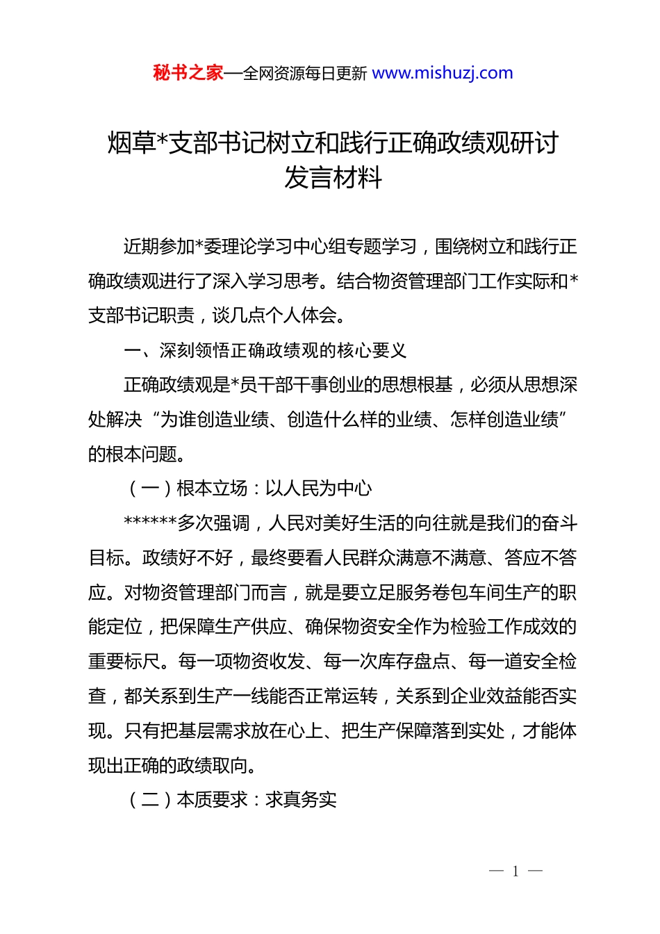 秘书之家—全网资源每日更新 www.mishuzj.com烟草*支部书记树立和践行正确政绩观研讨发言材料近期参加*委理论学习中心组专题学习,围绕树立和践行正确政绩观进行了深入学习思考。结合物资管理部门工作实际和*支部书记职责,谈几点个人体会。一、深刻领悟正确政绩观的核心要义正确政绩观是*员干部干事创业的思想根基,必须从思想深处解决“为谁创造业绩、创造什么样的业绩、怎样创造业绩”的根本问题。(一)根本立场:以人民为中心******多次强调,人民对美好生活的向往就是我们的奋斗目标。政绩好不好,最终要看人民群众满意不满意、答应不答应。对物资管理部门而言,就是要立足服务卷包车间生产的职能定位,把保障生产供应、确保物资安全作为检验工作成效的重要标尺。每一项物资收发、每一次库存盘点、每一道安全检查,都关系到生产一线能否正常运转,关系到企业效益能否实现。只有把基层需求放在心上、把生产保障落到实处,才能体现出正确的政绩取向。(二)本质要求:求真务实— 1 —秘书之家—全网资源每日更新 www.mishuzj.com求真务实是马克思主义活的灵魂,也是*的思想路线的核心内容。树立正确政绩观,必须坚持实事求是,按客观规律办事,做到不慕虚荣、不务虚功、不图虚名。物资管理工作涉及收、发、存多个环节,涵盖仓储、安全多个领域,任何一个环节出现疏漏,都可能影响生产大局。这就要求在工作中必须脚踏实地、真抓实干,把每一项工作做细做实,不能搞形式主义、做表面文章,更不能为了出“政绩”而脱离实际、盲目决策。(三)实践路径:实干担当******指出,干部干事创业要树立正确政绩观,有功成不必在我的精神境界、功成必定有我的历史担当。这一重要论述深刻揭示了正确政绩观的实践要求。作为基层*支部书记,既要胸怀“功成不必在我”的境界,不计较个人得失、不追求短期效应;又要担当“功成必定有我”的责任,在其位谋其政、任其职尽其责。物资管理工作看似平凡琐碎,实则是保障生产链条中不可或缺的重要一环,必须以强烈的责任感和使命感,把本职工作做好做实。二、以正确政绩观引领物资管理工作实践树立和践行正确政绩观,关键在于把正确政绩观的要求转化为推动工作的实际行动,体现在物资管理的具体实践中。(一)在调查研究上求深入— 2 —秘书之家—全网资源每日更新 www.mishuzj.com调查研究是做好工作的基本功,也是践行正确政绩观的重要方法。物资管理部门直接服务卷包车间生产,必须深入一线了解需求、掌握实情。要坚持“四下基层”制度,定期到卷包车间走访调研,了解生产计划安排、物资消耗规律、紧急需求情况,把基层的声音听进去、把一线的诉求带回来。2025 年下半年以来,物资管理部门通过建立定期走访机制,收集生产一线意见建议多条,针对辅料配送时效、库存预警机制等问题进行了优化调整。这些工作看似平常,却是正确政绩观在日常工作中的具体体现。只有把身子沉下去、把情况摸清楚,才能制定出符合实际的工作措施,避免“拍脑袋”决策、“想当然”办事。(二)在安全管理上求实效安全是物资管理的底线和红线,也是检验政绩观是否正确的重要标准。树立正确政绩观,必须把安全管理摆在突出位置,做到真抓真管、实抓实管。要严格落实安全生产责任制,完善安全管理机制,加强安全教育培训,强化安全隐患排查治理。2026 年是《安全生产治本攻坚三年行动方案》的收官之年,行业对安全生产标准化建设提出了更高要求。物资管理部门要以正确政绩观为引领,扎实推进安全管理工作,不为“出成绩”而搞花架子,不为“交差事”而走过场,把每一项安全措施落— 3 —秘书之家—全网资源每日更新 www.mishuzj.com到实处、见到实效。特别是在仓储安全管理中,要运用物联网、智能监控等技术手段,提升安全管控水平,实现从“被动应对”向“主动预防”转变。(三)在服务保障上求精准物资管理的核心职能是为卷包车间提供生产所需的辅料物资,服务保障的质量直接关系到生产效率和经济效益。践行正确政绩观,就要把服务保障工作做精做细,做到精准对接、精准供应、精准管理。要优化物资收发流程,提高周转效率,降低库存成本;要建立科学的库存预警...