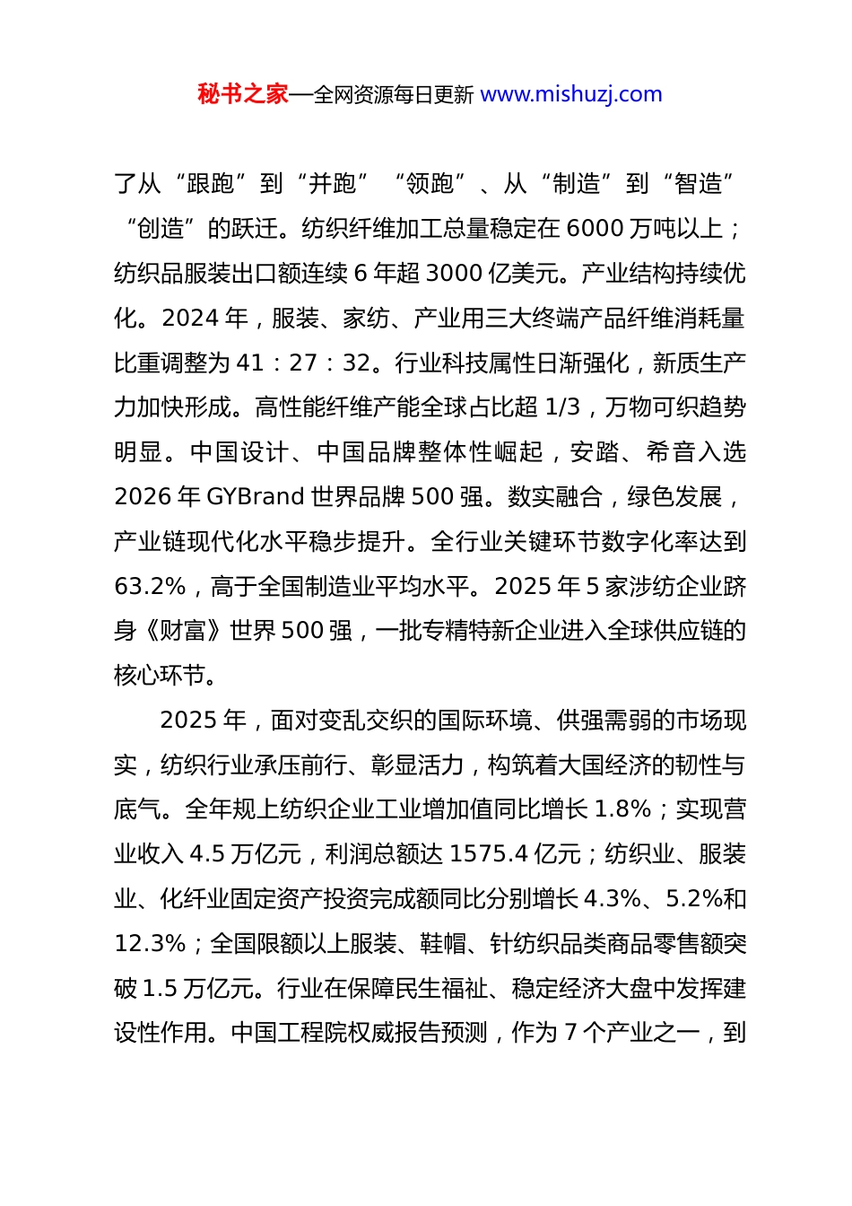 秘书之家—全网资源每日更新 www.mishuzj.com展经纬志向 启锦绣新程——在 2026 全国“两会”纺织行业代表委员座谈会(视频)暨中国纺联党委主题党日活动上发表讲话中国纺织工业联合会党委书记、会长 孙瑞哲(2026 年 2 月 28 日)尊敬的各位代表委员、各位行业同仁,同志们:阳春布德泽,万物生光辉。很高兴在“十五五”开局起步之年,与参加全国两会的纺织界代表委员及行业同仁们共同谋划一年之计、开启锦绣征程。当前,我们正处在为基本实现社会主义现代化“夯实基础、全面发力”的关键节点。立足新的时代方位,纺织行业要融入中国式现代化进程,满足人民对美好生活的向往和经济社会发展的需要,为民族复兴、国家富强注入力量。承担新的历史责任,行业工作要树立和践行正确政绩观,需要我们立足产业实际在时代潮流、国家战略的框架下审视发展,树大局之观,执格局之要,寻破局之法,推动构建科技、时尚、绿色、健康的纺织现代化产业体系。一、“十四五”收官,纺织行业进入新发展阶段“十四五”以来,纺织行业坚持守正创新、稳中求进,实现秘书之家—全网资源每日更新 www.mishuzj.com了从“跟跑”到“并跑”“领跑”、从“制造”到“智造”“创造”的跃迁。纺织纤维加工总量稳定在 6000 万吨以上;纺织品服装出口额连续 6 年超 3000 亿美元。产业结构持续优化。2024 年,服装、家纺、产业用三大终端产品纤维消耗量比重调整为 41:27:32。行业科技属性日渐强化,新质生产力加快形成。高性能纤维产能全球占比超 1/3,万物可织趋势明显。中国设计、中国品牌整体性崛起,安踏、希音入选2026 年 GYBrand 世界品牌 500 强。数实融合,绿色发展,产业链现代化水平稳步提升。全行业关键环节数字化率达到63.2%,高于全国制造业平均水平。2025 年 5 家涉纺企业跻身《财富》世界 500 强,一批专精特新企业进入全球供应链的核心环节。2025 年,面对变乱交织的国际环境、供强需弱的市场现实,纺织行业承压前行、彰显活力,构筑着大国经济的韧性与底气。全年规上纺织企业工业增加值同比增长 1.8%;实现营业收入 4.5 万亿元,利润总额达 1575.4 亿元;纺织业、服装业、化纤业固定资产投资完成额同比分别增长 4.3%、5.2%和12.3%;全国限额以上服装、鞋帽、针纺织品类商品零售额突破 1.5 万亿元。行业在保障民生福祉、稳定经济大盘中发挥建设性作用。中国工程院权威报告预测,作为 7 个产业之一,到秘书之家—全网资源每日更新 www.mishuzj.com2030 年纺织行业将继续保持世界领先水平。中国纺织已经整体迈进世界第一方阵。党的二十届四中全会明确将纺织行业列为“优化提升”的重点产业,赋予了巩固提升全球产业分工地位和竞争力的重大使命。规模领先、体系完备、创新活跃,纺织行业具备全链条、全领域构筑全球优势的现实条件。国民经济的支柱产业、共同富裕的民生产业、内外融通的优势产业、传承创新的未来产业,是新时期行业发展的时代方位,也是行业工作的目标方向与逻辑起点。但要看到,在创新策源、标准制定、价值分配、理念引领等方面我们依然存在短板弱项。要更好破题,需要全面、深刻、准确领会和把握“十五五”时期的战略部署,不断增强产业发展的确定性和可持续性。二、全面统筹,找到产业发展的平衡点国际环境深刻变化,科技革命加速演进,人民期待持续升级,产业发展面临的变量之多、挑战之大前所未有。单兵突进难以奏效,局部优化无法破局,我们要以全局视野、系统思维统筹发展。(一)更好统筹本土发展与全球发展中国纺织进入全球发展新阶段,由产品、产能向资本、品牌延伸,行业对外直接投资覆盖全球 100 多个国家和地区。新秘书之家—全网资源每日更新 www.mishuzj.com模式、新业态涌现。2024 年,我国服装跨境电商出口额 5910亿元,占全国跨境电商总额的 27%。在融入全球市场的过程中,避免文化冲突、完善合规管理、强化股权控制等成为行业亟待破解的课题。地缘政治持续深化,关键资源、核心技术、标准规则成为竞合焦点。外部环境的复杂性带来新挑战。以棉花为例,保障企业出口订单的特定用棉需求更加紧迫。行业要立足国内战...