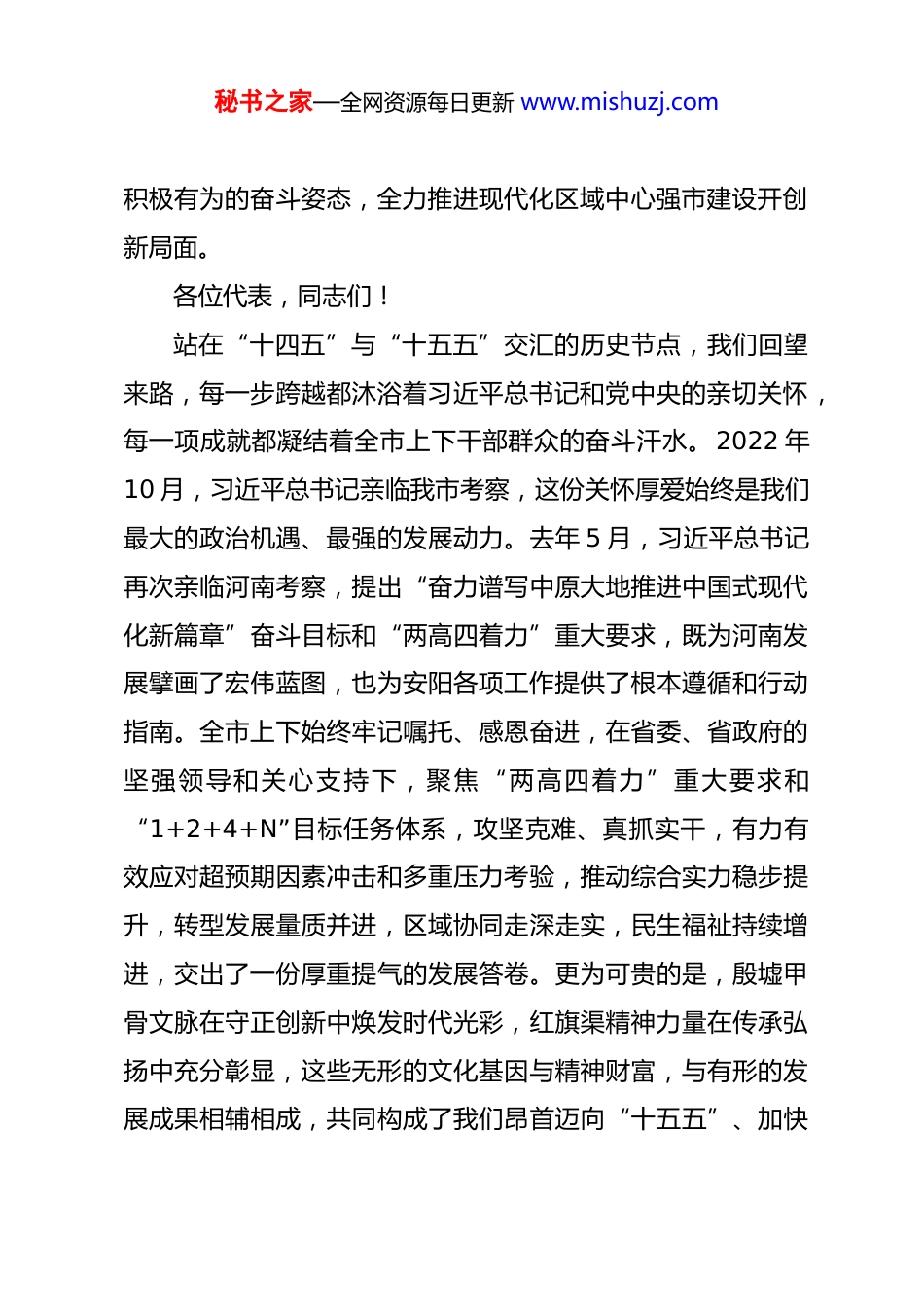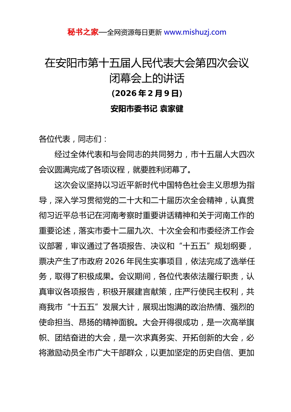 秘书之家—全网资源每日更新 www.mishuzj.com在安阳市第十五届人民代表大会第四次会议闭幕会上的讲话(2026 年 2 月 9 日)安阳市委书记 袁家健各位代表,同志们:经过全体代表和与会同志的共同努力,市十五届人大四次会议圆满完成了各项议程,就要胜利闭幕了。这次会议坚持以习近平新时代中国特色社会主义思想为指导,深入学习贯彻党的二十大和二十届历次全会精神,认真贯彻习近平总书记在河南考察时重要讲话精神和关于河南工作的重要论述,落实市委十二届九次、十次全会和市委经济工作会议部署,审议通过了各项报告、决议和“十五五”规划纲要,票决产生了市政府 2026 年民生实事项目,依法完成了选举任务,取得了积极成果。会议期间,各位代表依法履行职责,认真审议各项报告,积极开展建言献策,庄严行使民主权利,共商我市“十五五”发展大计,展现出饱满的政治热情、强烈的使命担当、昂扬的精神面貌。大会开得很成功,是一次高举旗帜、团结奋进的大会,是一次求真务实、开拓创新的大会,必将激励动员全市广大干部群众,以更加坚定的历史自信、更加秘书之家—全网资源每日更新 www.mishuzj.com积极有为的奋斗姿态,全力推进现代化区域中心强市建设开创新局面。各位代表,同志们!站在“十四五”与“十五五”交汇的历史节点,我们回望来路,每一步跨越都沐浴着习近平总书记和党中央的亲切关怀,每一项成就都凝结着全市上下干部群众的奋斗汗水。2022 年10 月,习近平总书记亲临我市考察,这份关怀厚爱始终是我们最大的政治机遇、最强的发展动力。去年 5 月,习近平总书记再次亲临河南考察,提出“奋力谱写中原大地推进中国式现代化新篇章”奋斗目标和“两高四着力”重大要求,既为河南发展擘画了宏伟蓝图,也为安阳各项工作提供了根本遵循和行动指南。全市上下始终牢记嘱托、感恩奋进,在省委、省政府的坚强领导和关心支持下,聚焦“两高四着力”重大要求和“1+2+4+N”目标任务体系,攻坚克难、真抓实干,有力有效应对超预期因素冲击和多重压力考验,推动综合实力稳步提升,转型发展量质并进,区域协同走深走实,民生福祉持续增进,交出了一份厚重提气的发展答卷。更为可贵的是,殷墟甲骨文脉在守正创新中焕发时代光彩,红旗渠精神力量在传承弘扬中充分彰显,这些无形的文化基因与精神财富,与有形的发展成果相辅相成,共同构成了我们昂首迈向“十五五”、加快秘书之家—全网资源每日更新 www.mishuzj.com推进强市建设的充足底气和强大支撑!各位代表,同志们!今年是“十五五”开局之年,也是安阳加快转型、融合重塑、全面提升的关键之年,跑好关键时期第一程至关重要。省委、省政府赋予我们打造“一高地一区三中心”的战略定位,这是安阳在奋力谱写中原大地推进中国式现代化新篇章中的重大使命,是必须扛起的政治责任。全市上下要把思想和行动统一到党中央决策部署和省委工作要求上来,统一到市委决策和本次大会确定的目标任务上来,坚定发展信心、把握发展机遇,全力推进现代化区域中心强市建设在“十五五”新征程上不断开创新局面。奋进“十五五”、聚力建强市,必须牢牢把握根本遵循,在对标对表中校准前行航向。习近平总书记在河南考察时重要讲话精神和关于河南工作的重要论述,是我们统领各项工作的“纲”与“魂”,是破解发展难题、推动强市建设的“金钥匙”。我们要在学思践悟中深刻领悟“两个确立”的决定性意义,坚决做到“两个维护”,始终坚持正确政治方向和科学发展导向,把习近平总书记的殷殷嘱托转化为干事创业的实际行动,转化为强市建设的具体成效。要坚定践行“两高四着力”重大要求,锚定“以红旗渠精神为引领建设现代化区域中心强秘书之家—全网资源每日更新 www.mishuzj.com市”目标,紧扣“一高地一区三中心”战略定位,深入研判国家所需、精准对接河南所能、充分发挥安阳所长,确保各项工作既为一域增光、又为全局添彩。奋进“十五五”、聚力建强市,必须坚定不移推动高质量发展,充分释放活力、激发潜能。高质量发展是新时代的硬道理,也是安阳破解发展难题、实现赶超跨越的必由之路。要坚持把发展经济的着力点放在实体经济上,以智能...