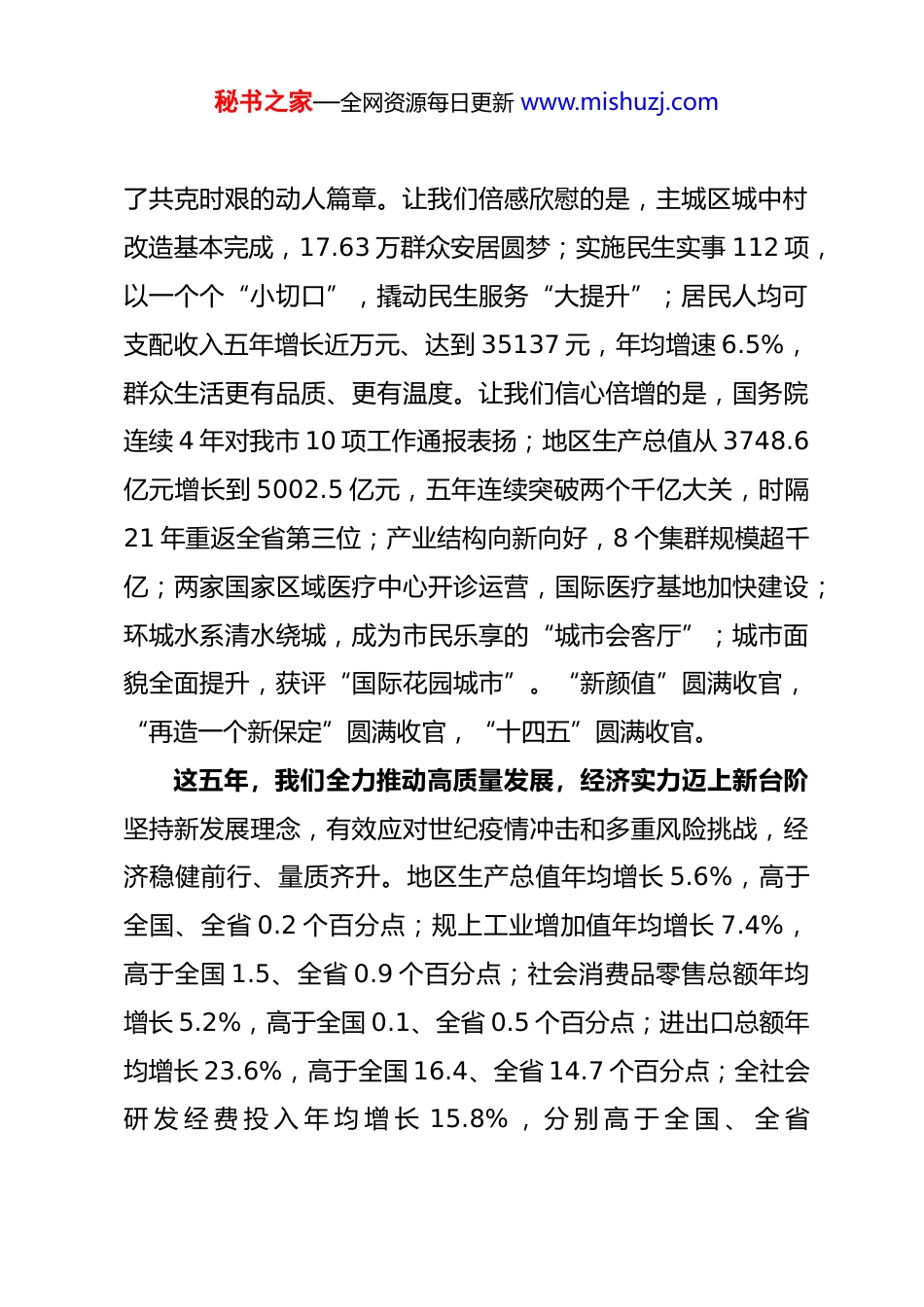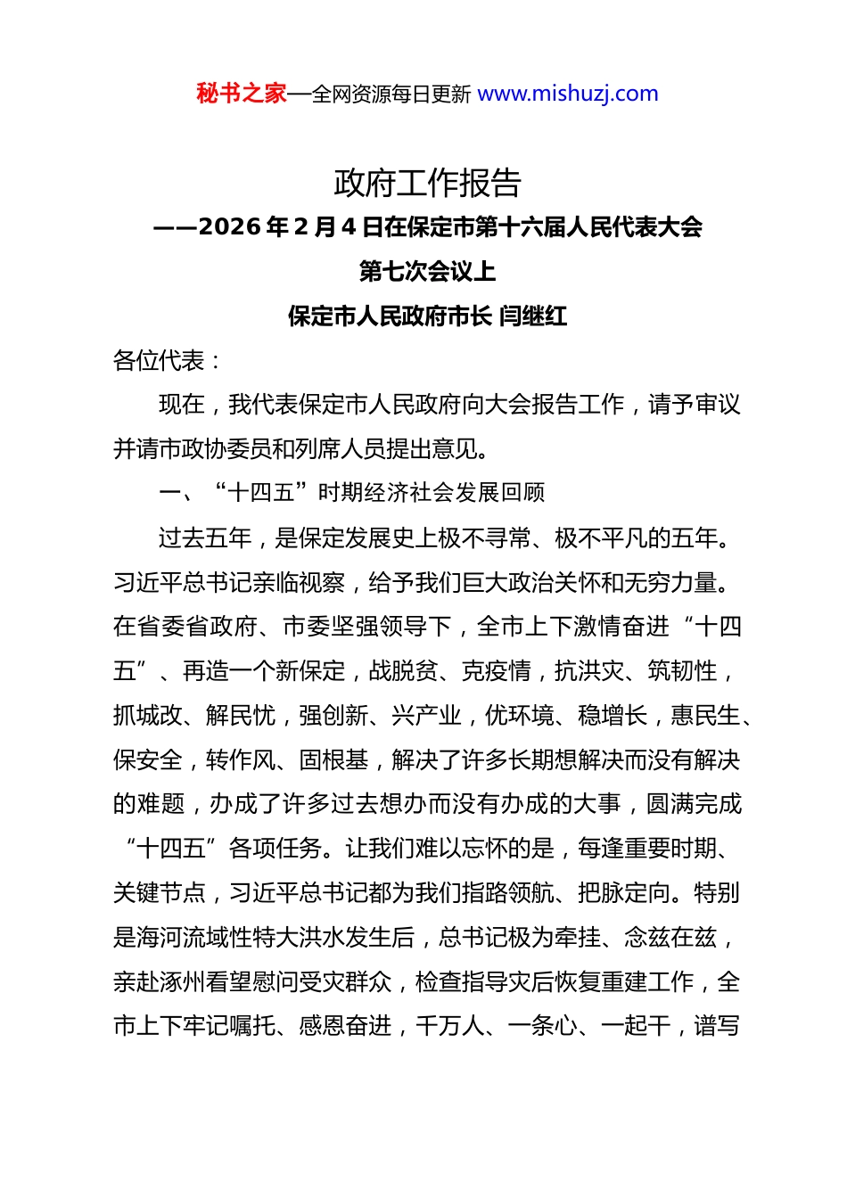 秘书之家—全网资源每日更新 www.mishuzj.com政府工作报告——2026 年 2 月 4 日在保定市第十六届人民代表大会第七次会议上保定市人民政府市长 闫继红各位代表:现在,我代表保定市人民政府向大会报告工作,请予审议并请市政协委员和列席人员提出意见。一、“十四五”时期经济社会发展回顾过去五年,是保定发展史上极不寻常、极不平凡的五年。习近平总书记亲临视察,给予我们巨大政治关怀和无穷力量。在省委省政府、市委坚强领导下,全市上下激情奋进“十四五”、再造一个新保定,战脱贫、克疫情,抗洪灾、筑韧性,抓城改、解民忧,强创新、兴产业,优环境、稳增长,惠民生、保安全,转作风、固根基,解决了许多长期想解决而没有解决的难题,办成了许多过去想办而没有办成的大事,圆满完成“十四五”各项任务。让我们难以忘怀的是,每逢重要时期、关键节点,习近平总书记都为我们指路领航、把脉定向。特别是海河流域性特大洪水发生后,总书记极为牵挂、念兹在兹,亲赴涿州看望慰问受灾群众,检查指导灾后恢复重建工作,全市上下牢记嘱托、感恩奋进,千万人、一条心、一起干,谱写秘书之家—全网资源每日更新 www.mishuzj.com了共克时艰的动人篇章。让我们倍感欣慰的是,主城区城中村改造基本完成,17.63 万群众安居圆梦;实施民生实事 112 项,以一个个“小切口”,撬动民生服务“大提升”;居民人均可支配收入五年增长近万元、达到 35137 元,年均增速 6.5%,群众生活更有品质、更有温度。让我们信心倍增的是,国务院连续 4 年对我市 10 项工作通报表扬;地区生产总值从 3748.6亿元增长到 5002.5 亿元,五年连续突破两个千亿大关,时隔21 年重返全省第三位;产业结构向新向好,8 个集群规模超千亿;两家国家区域医疗中心开诊运营,国际医疗基地加快建设;环城水系清水绕城,成为市民乐享的“城市会客厅”;城市面貌全面提升,获评“国际花园城市”。“新颜值”圆满收官,“再造一个新保定”圆满收官,“十四五”圆满收官。这五年,我们全力推动高质量发展,经济实力迈上新台阶坚持新发展理念,有效应对世纪疫情冲击和多重风险挑战,经济稳健前行、量质齐升。地区生产总值年均增长 5.6%,高于全国、全省 0.2 个百分点;规上工业增加值年均增长 7.4%,高于全国 1.5、全省 0.9 个百分点;社会消费品零售总额年均增长 5.2%,高于全国 0.1、全省 0.5 个百分点;进出口总额年均增长 23.6%,高于全国 16.4、全省 14.7 个百分点;全社会研 发 经 费 投 入 年 均 增 长 15.8% , 分 别 高 于 全 国 、 全 省秘书之家—全网资源每日更新 www.mishuzj.com5.3、4.7 个百分点;居民人均可支配收入年均增长 6.5%,高于全国、全省 0.4 个百分点,高质量发展质效成色更足。这五年,我们主动融入国家战略,协同发展取得新突破。承接京津疏解项目 484 个,总投资 3078 亿元。新增二三级子公司 73 家,央企子公司总数达 289 家。技术合同成交额从14.8 亿元跃升至 422.7 亿元、增长 27 倍,全省第一。北京儿童医院保定医院、广安门医院保定医院建成投运,84 家医院与京津 128 家医院深度合作,京津来保就医人次从疫情前 0.2 万增至 173.1 万、增长 865 倍。保定·中关村创新中心培育科创企业 700 多家、增长 2.5 倍,成为国家级高新技术成果转化试点。深圳园从一片待兴之地崛起为一座创新之城。雄忻高铁、石雄城际加快建设,京津冀环线高铁开行,“一小时交通圈”“半小时通勤圈”加速形成。这五年,我们坚持创新驱动,产业升级迈出新步伐。创新实力持续领跑,研究与试验发展经费投入强度达 3.2%,连续12 年全省前列,跻身全国创新能力百强,是全省唯一“科创中国”试点城市。创新主体扩容提质,国家科技型中小企业达到2912 家 、 增 长 456% , 高 新 技 术 企 业 1865 家 、 增 长62.3%,专精特新企业 767 家、“小巨人”企业 35 家,分别增长 6.9 倍、3.4 倍。高新技术产业增加值占规上工业比重达秘书之家—全网资源每日更新 www.mishuzj.com到 50.4%,高于全省 24.9 个...