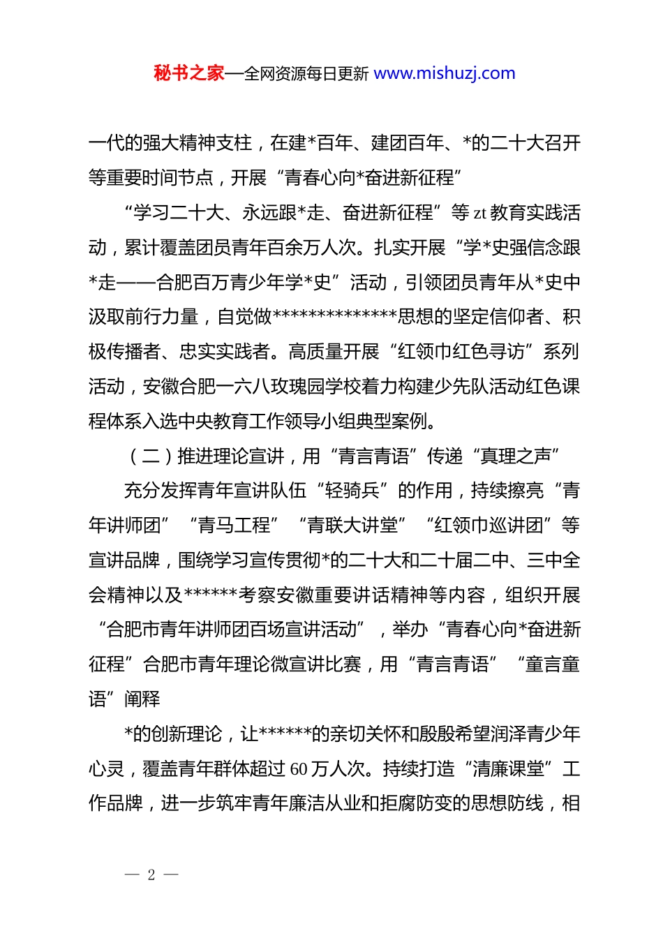 秘书之家—全网资源每日更新 www.mishuzj.com牢记嘱托跟*走挺膺担当建新功——共青团合肥市第十五次代表大会以来工作综述(2025 年 7 月 9 日)青年强,则国家强。共青团合肥市第十五次代表大会召开以来,在市委的坚强领导和团省委的正确指导下,团市委坚持以**************思想为指导,深入贯彻落实******关于青年工作的重要思想,紧扣为*育人根本任务,振奋精神、担当尽责、攻坚克难、深化改革,全市共青团事业蓬勃发展,“三力一度”显著提升,累计荣获国家级、省级荣誉近 300 个,在合肥高质量发展的新征程上展现青春“新风采”,贡献青年“新能量”。立心铸魂以思想火炬照亮青春航向合肥共青团立足“为*培养社会主义建设者和接班人”的根本任务,打造“理论铸魂、实践锤炼、网络助力”的思想引领架构,让*的创新理论成为青年最坚定的精神灯塔。(一)开展集中教育,巩固青年团结奋斗的共同思想基础准确把握时代脉搏,坚持用**************思想构筑青年— 1 —秘书之家—全网资源每日更新 www.mishuzj.com一代的强大精神支柱,在建*百年、建团百年、*的二十大召开等重要时间节点,开展“青春心向*奋进新征程”“学习二十大、永远跟*走、奋进新征程”等 zt 教育实践活动,累计覆盖团员青年百余万人次。扎实开展“学*史强信念跟*走——合肥百万青少年学*史”活动,引领团员青年从*史中汲取前行力量,自觉做**************思想的坚定信仰者、积极传播者、忠实实践者。高质量开展“红领巾红色寻访”系列活动,安徽合肥一六八玫瑰园学校着力构建少先队活动红色课程体系入选中央教育工作领导小组典型案例。(二)推进理论宣讲,用“青言青语”传递“真理之声”充分发挥青年宣讲队伍“轻骑兵”的作用,持续擦亮“青年讲师团”“青马工程”“青联大讲堂”“红领巾巡讲团”等宣讲品牌,围绕学习宣传贯彻*的二十大和二十届二中、三中全会精神以及******考察安徽重要讲话精神等内容,组织开展“合肥市青年讲师团百场宣讲活动”,举办“青春心向*奋进新征程”合肥市青年理论微宣讲比赛,用“青言青语”“童言童语”阐释*的创新理论,让******的亲切关怀和殷殷希望润泽青少年心灵,覆盖青年群体超过 60 万人次。持续打造“清廉课堂”工作品牌,进一步筑牢青年廉洁从业和拒腐防变的思想防线,相— 2 —秘书之家—全网资源每日更新 www.mishuzj.com关经验做法入选中央纪委监委典型案例。(三)打造网络阵地,让“数字空间”成为“红色主场”合肥共青团始终以社会主义核心价值观为引领,通过团属新媒体矩阵,发布各行各业青年为祖国建设和美好生活拼搏奋斗的主题文化产品,引发青年网友情感共鸣。截至目前,“合肥共青团”全网粉丝超过 472 万,发布的各类主题视频播放量超 2 亿次。开展“我的青春在合肥”系列网络直播活动,走进乡村振兴青年群体,累计观看量 100 余万人次。推出“合肥请您来”“何以青春”“遇见合肥”等一批主题网络专栏,覆盖青少年百万人次。落实“实施宣传思想产品化战略”的要求,每年推出原创视频、海报、h5 等,《青春合肥》《少年有志》等短视频在全市地铁、公交电子屏循环播放,《追光而行》被新华社等主流媒体转发,浏览量超过 100 万人次。从严治团以自我革命锻造硬核力量合肥共青团始终紧跟*,不断加强自身建设,始终将从严管团治团作为一项基本任务贯穿于团的建设之中,让团的组织更加坚强有力,团的事业更加充满活力。(一)加强组织建设,扩大工作覆盖面“青年在哪里,团组织就建在哪里”。合肥共青团在非公企— 3 —秘书之家—全网资源每日更新 www.mishuzj.com业和新社会组织领域积极推行“行业建团、园区建团、楼宇建团”等模式,新经济组织领域团支部数量提升至 2729 个,新社会组织领域团支部数量增至 771 个,团的组织触角得到有效延伸。深入开展县域共青团基层组织改革,庐阳区、长丰县、肥西县被列为全国县域共青团基层组织改革试点地区,肥西县试点工作被评估为全国优秀。推进“一专一站两联”机制建设(即专业委员会、团代表联络站,以及团干部联系青年、团代表联系团员),工作做法被团中央选为典型案例,在全...