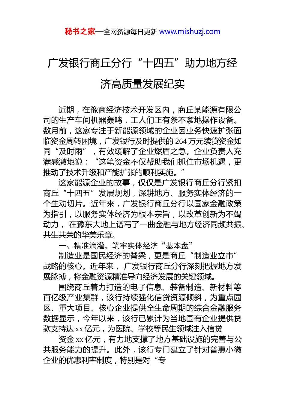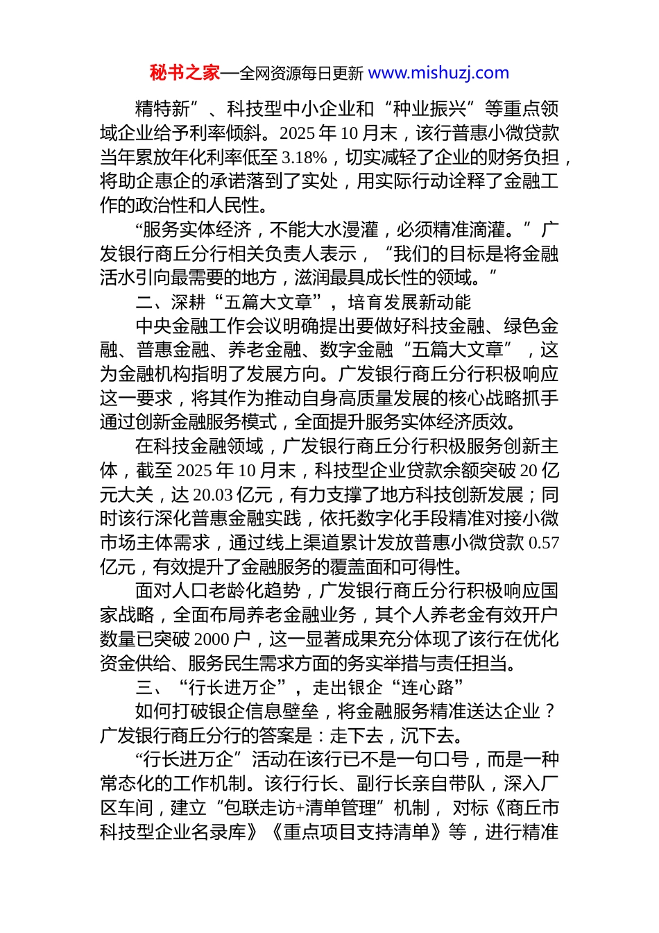 秘书之家—全网资源每日更新 www.mishuzj.com广发银行商丘分行“十四五”助力地方经济高质量发展纪实近期,在豫商经济技术开发区内,商丘某能源有限公司的生产车间机器轰鸣,工人们正有条不紊地操作设备。数月前,这家专注于新能源领域的企业因业务快速扩张面临资金周转困境,广发银行及时提供的 264 万元续贷资金如同“及时雨”,有效缓解了企业燃眉之急。企业负责人充满感激地说:“这笔资金不仅帮助我们抓住市场机遇,更推动了技术升级和产能扩张的顺利实施。”这家能源企业的故事,仅仅是广发银行商丘分行紧扣商丘“十四五”发展规划,深耕地方、服务实体经济的一个生动切片。近年来,广发银行商丘分行以国家金融政策为指引,以服务实体经济为根本宗旨,以改革创新为不竭动力, 在豫东大地上谱写了一曲金融与地方经济同频共振、共生共荣的华美乐章。一、精准滴灌,筑牢实体经济“基本盘”制造业是国民经济的脊梁,更是商丘“制造业立市”战略的核心。近年来, 广发银行商丘分行深刻把握地方发展脉搏,将金融资源精准导向经济发展的关键领域。围绕商丘着力打造的电子信息、装备制造、新材料等百亿级产业集群,该行持续强化信贷资源倾斜,为重点园区、重大项目、核心企业提供全生命周期的综合金融服务数据显示,今年以来,该行已累计为当地国有企业提供贷款支持达 xx 亿元,为医院、学校等民生领域注入信贷资金 xx 亿元,有力地支撑了地方基础设施的完善与公共服务能力的提升。此外,该行专门建立了针对普惠小微企业的优惠利率制度,特别是对“专秘书之家—全网资源每日更新 www.mishuzj.com精特新”、科技型中小企业和“种业振兴”等重点领域企业给予利率倾斜。2025 年 10 月末,该行普惠小微贷款当年累放年化利率低至 3.18%,切实减轻了企业的财务负担,将助企惠企的承诺落到了实处,用实际行动诠释了金融工作的政治性和人民性。“服务实体经济,不能大水漫灌,必须精准滴灌。”广发银行商丘分行相关负责人表示,“我们的目标是将金融活水引向最需要的地方,滋润最具成长性的领域。”二、深耕“五篇大文章”,培育发展新动能中央金融工作会议明确提出要做好科技金融、绿色金融、普惠金融、养老金融、数字金融“五篇大文章”,这为金融机构指明了发展方向。广发银行商丘分行积极响应这一要求,将其作为推动自身高质量发展的核心战略抓手通过创新金融服务模式,全面提升服务实体经济质效。在科技金融领域,广发银行商丘分行积极服务创新主体,截至 2025 年 10 月末,科技型企业贷款余额突破 20 亿元大关,达 20.03 亿元,有力支撑了地方科技创新发展;同时该行深化普惠金融实践,依托数字化手段精准对接小微市场主体需求,通过线上渠道累计发放普惠小微贷款 0.57亿元,有效提升了金融服务的覆盖面和可得性。面对人口老龄化趋势,广发银行商丘分行积极响应国家战略,全面布局养老金融业务,其个人养老金有效开户数量已突破 2000 户,这一显著成果充分体现了该行在优化资金供给、服务民生需求方面的务实举措与责任担当。三、“行长进万企”,走出银企“连心路”如何打破银企信息壁垒,将金融服务精准送达企业?广发银行商丘分行的答案是:走下去,沉下去。“行长进万企”活动在该行已不是一句口号,而是一种常态化的工作机制。该行行长、副行长亲自带队,深入厂区车间,建立“包联走访+清单管理”机制, 对标《商丘市科技型企业名录库》《重点项目支持清单》等,进行精准秘书之家—全网资源每日更新 www.mishuzj.com对接和优质客户筛选。今年以来,该行通过“行长进万企活动”开展调研走访企业 60 户,提出新增或续贷融资需求的企业数量 23 户,融资需求金额 7.4 亿元,达成融资金额 6.1 亿元。更为重要的是,该行并非“一走了之”,而是持续跟进,将需求转化为实实在在的信贷投放,目前实际投放 3.57 亿元,真正做到了“访实情、解真困”。在“行长进万企”专项活动中,广发银行商丘分行行长通过实地走访,精准把握某能源公司的流动资金困境后迅速组建专项服务团队,依托“惠信通” 产品为其设计定制化融资方案,最终高效完成 264 万元续...