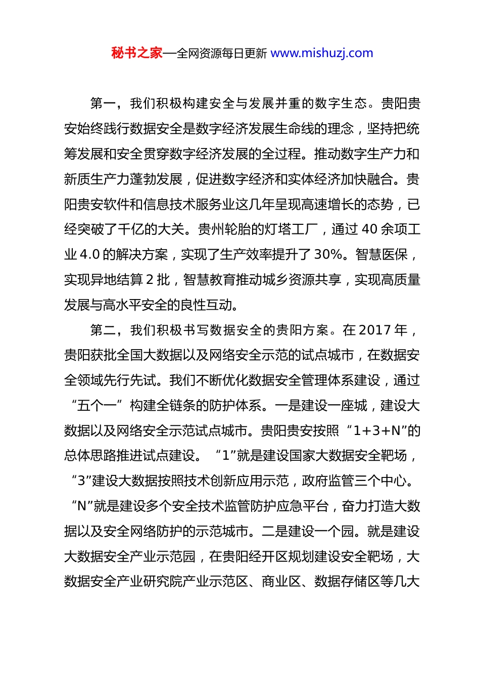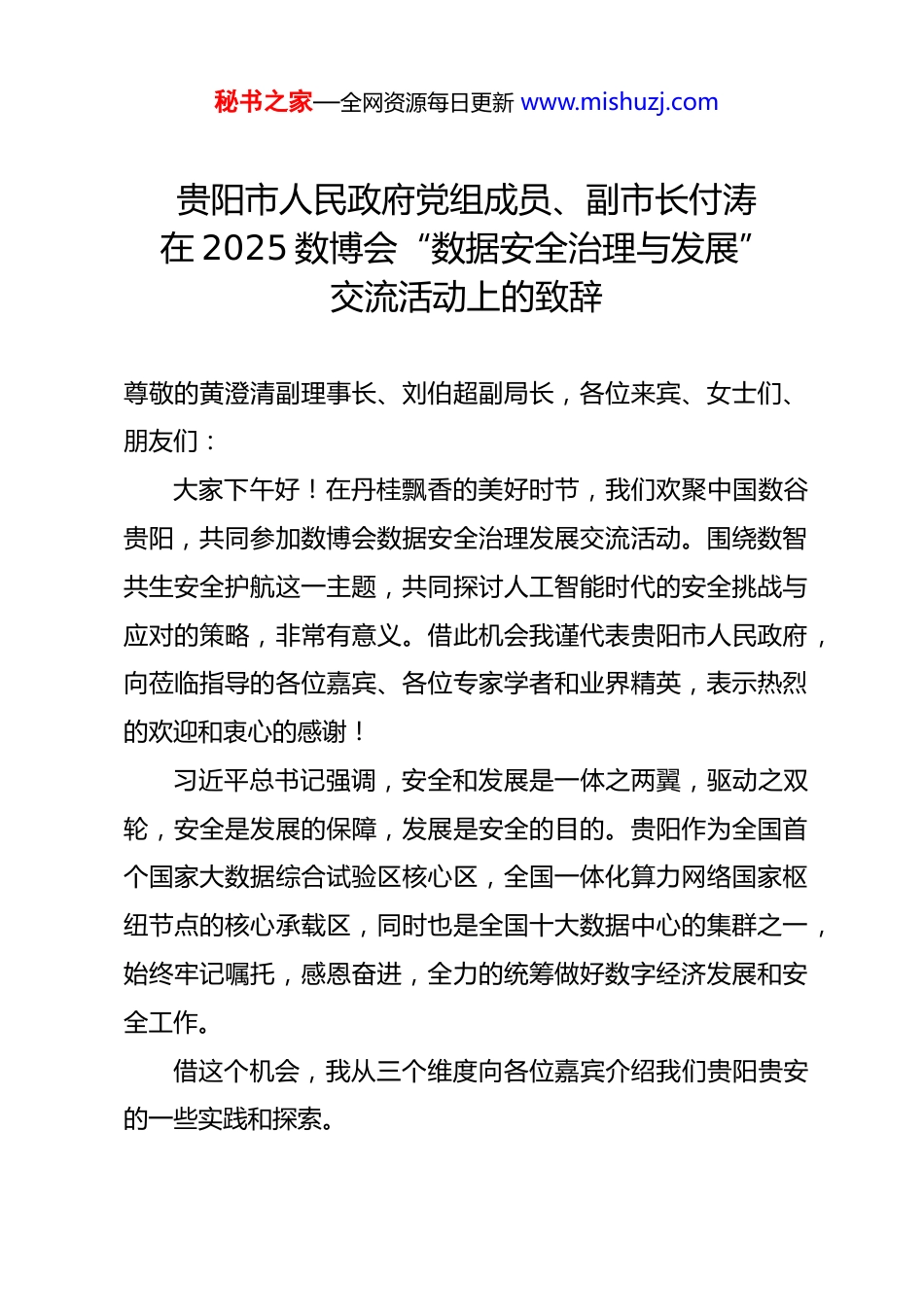 秘书之家—全网资源每日更新 www.mishuzj.com贵阳市人民政府党组成员、副市长付涛在 2025 数博会“数据安全治理与发展”交流活动上的致辞尊敬的黄澄清副理事长、刘伯超副局长,各位来宾、女士们、朋友们:大家下午好!在丹桂飘香的美好时节,我们欢聚中国数谷贵阳,共同参加数博会数据安全治理发展交流活动。围绕数智共生安全护航这一主题,共同探讨人工智能时代的安全挑战与应对的策略,非常有意义。借此机会我谨代表贵阳市人民政府,向莅临指导的各位嘉宾、各位专家学者和业界精英,表示热烈的欢迎和衷心的感谢!习近平总书记强调,安全和发展是一体之两翼,驱动之双轮,安全是发展的保障,发展是安全的目的。贵阳作为全国首个国家大数据综合试验区核心区,全国一体化算力网络国家枢纽节点的核心承载区,同时也是全国十大数据中心的集群之一,始终牢记嘱托,感恩奋进,全力的统筹做好数字经济发展和安全工作。借这个机会,我从三个维度向各位嘉宾介绍我们贵阳贵安的一些实践和探索。秘书之家—全网资源每日更新 www.mishuzj.com第一,我们积极构建安全与发展并重的数字生态。贵阳贵安始终践行数据安全是数字经济发展生命线的理念,坚持把统筹发展和安全贯穿数字经济发展的全过程。推动数字生产力和新质生产力蓬勃发展,促进数字经济和实体经济加快融合。贵阳贵安软件和信息技术服务业这几年呈现高速增长的态势,已经突破了千亿的大关。贵州轮胎的灯塔工厂,通过 40 余项工业 4.0 的解决方案,实现了生产效率提升了 30%。智慧医保,实现异地结算 2 批,智慧教育推动城乡资源共享,实现高质量发展与高水平安全的良性互动。第二,我们积极书写数据安全的贵阳方案。在 2017 年,贵阳获批全国大数据以及网络安全示范的试点城市,在数据安全领域先行先试。我们不断优化数据安全管理体系建设,通过“五个一”构建全链条的防护体系。一是建设一座城,建设大数据以及网络安全示范试点城市。贵阳贵安按照“1+3+N”的总体思路推进试点建设。“1”就是建设国家大数据安全靶场,“3”建设大数据按照技术创新应用示范,政府监管三个中心。“N”就是建设多个安全技术监管防护应急平台,奋力打造大数据以及安全网络防护的示范城市。二是建设一个园。就是建设大数据安全产业示范园,在贵阳经开区规划建设安全靶场,大数据安全产业研究院产业示范区、商业区、数据存储区等几大秘书之家—全网资源每日更新 www.mishuzj.com板块,主攻大数据安全软件、硬件服务、应用四大产业,构建覆盖安全产品提供、安全测评、安全认证、安全运维、态势感知、危险分析等产业链条。三是建设一个靶场。就是建设国家大数据安全靶场,聚焦攻防演练、技术检验和产品测试,建设综合性攻防演练平台。我们连续举办八届大数据及网络安全基因对抗演练。四是建设一个中心,就是建设贵州大数据安全工程研究中心,强化与大数据协同国家安全工程实验室等全国的重点实验室加强合作,深入开展数据安全风险治理,数据共享开放,数据流转风险等等技术的攻关。五是建设一个制度体系。就是建设数据制度体系,依托贵阳大数据交易所探索制定公共、非公共的数据开发利用产权治理,健全数据分级分类的保护机制,颁布实施了政府数据共享开放条例,大数据安全管理条例,健康医疗大数据应用管理条例等全国首创性的地方性的法规。进一步的健全了法规体系。第三,我们积极的构筑绿色安全的数字底座。贵阳贵安牢牢抓住安全自主可控的算力基础设施这个基石,在东数西算国家战略地指引下,依托全国一体化算力网络国家枢纽节点,已经建成了 26 个大型的数据中心,算力资源充沛。我们创新构建了水电加新能源的体系,依托省内 3498 万千瓦新能源装机提供清洁动力,全力保障数据中心绿色稳定的运行。秘书之家—全网资源每日更新 www.mishuzj.com各位嘉宾,朋友们,数据安全治理犹如构筑数字时代的新长城,需要政产学研是各界共同努力,让我们以本次活动为契机,深入交流和探讨,我们也期待各位嘉宾能够畅所欲言,各抒己见,共同分享数据安全领域的最新研究成果和实践经验,为构建安全可信的数字经济环境贡献智慧和力量。最后预祝本次活动取得圆满成功,谢谢大家!