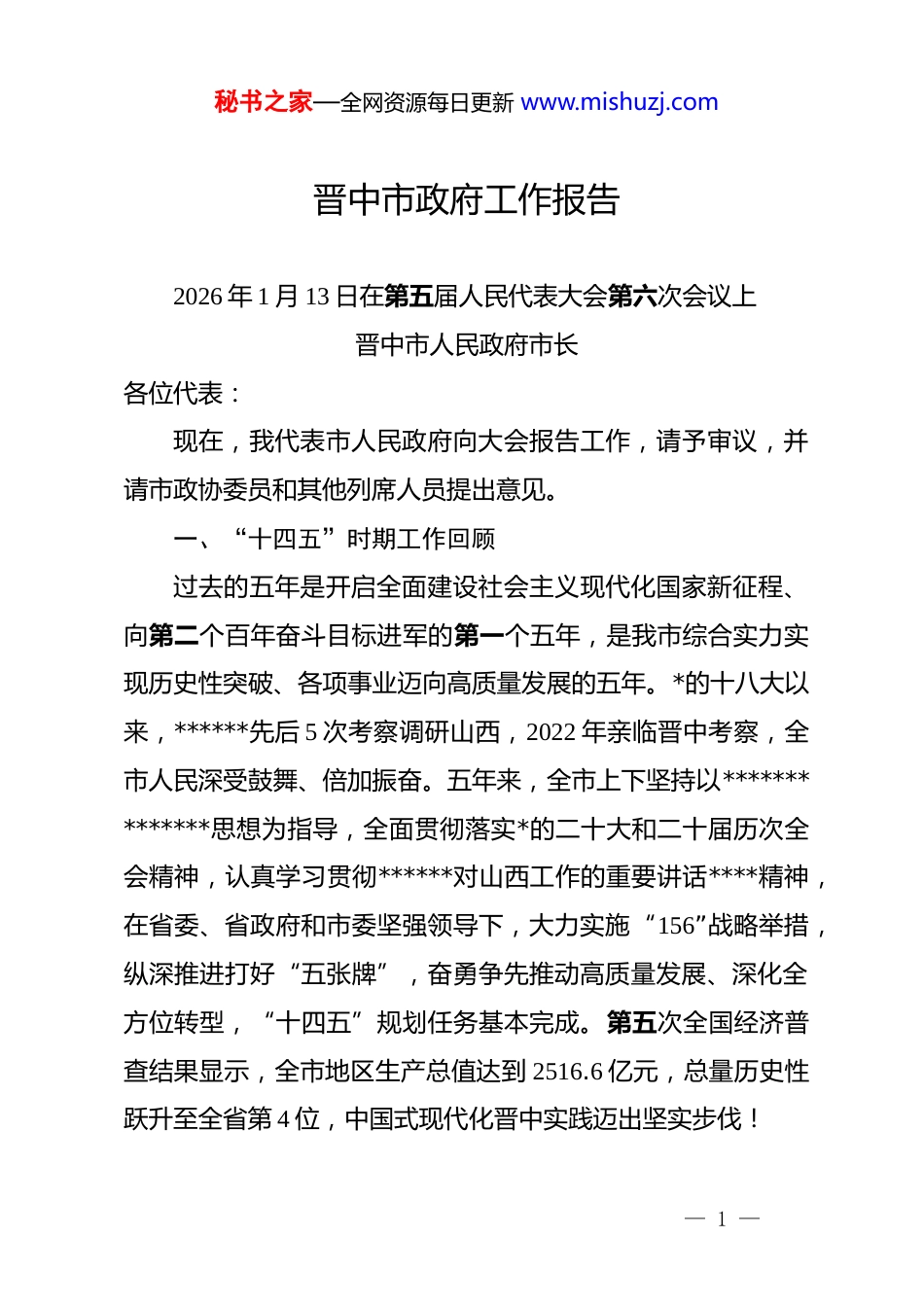 秘书之家—全网资源每日更新 www.mishuzj.com晋中市政府工作报告2026 年 1 月 13 日在第五届人民代表大会第六次会议上晋中市人民政府市长各位代表:现在,我代表市人民政府向大会报告工作,请予审议,并请市政协委员和其他列席人员提出意见。一、“十四五”时期工作回顾过去的五年是开启全面建设社会主义现代化国家新征程、向第二个百年奋斗目标进军的第一个五年,是我市综合实力实现历史性突破、各项事业迈向高质量发展的五年。*的十八大以来,******先后 5 次考察调研山西,2022 年亲临晋中考察,全市人民深受鼓舞、倍加振奋。五年来,全市上下坚持以**************思想为指导,全面贯彻落实*的二十大和二十届历次全会精神,认真学习贯彻******对山西工作的重要讲话****精神,在省委、省政府和市委坚强领导下,大力实施“156”战略举措,纵深推进打好“五张牌”,奋勇争先推动高质量发展、深化全方位转型,“十四五”规划任务基本完成。第五次全国经济普查结果显示,全市地区生产总值达到 2516.6 亿元,总量历史性跃升至全省第 4 位,中国式现代化晋中实践迈出坚实步伐!— 1 —秘书之家—全网资源每日更新 www.mishuzj.com五年来,我们坚定不移走转型发展之路,构建起现代化产业体系的“四梁八柱”。三次产业结构由 2020 年的 7.6:45.4:47 调整为 2025 年的 6.1:39.7:54.2,经济发展的基础更加扎实、结构更加优化。能源供给绿色多元,扛牢保障国家能源安全政治责任,煤炭先进产能占比达到 98%,新能源和清洁能源装机容量占比从 30%提升至 60.8%,非常规天然气产量增长77.5%。传统产业焕新升级,焦化行业全部实现先进产能,培育 4 个省级、12 个市级特色专业镇,推动传统产业向高端化、智能化、绿色化发展。新兴产业集群成势,吉利乘用车及重卡、尚太锂电、龙湖精密电子、格盟国际全钒液流电池、太重榆液油缸等一批重大转型项目建成投产,建成全国最大的锂电负极材料生产基地,铝用阴极产品占到全国市场份额 70%以上,新能源汽车产量占到全省 78%。数字经济核心产业总量排全省第2 位,无人机、光存储、机器人、高端医疗器械等新兴产业从无到有,不断释放新动能。战略性新兴产业年均增长 12.8%,大幅高于工业增速。充分用好资源优势,因地制宜推动适度多元发展。特优农业提质增效,粮食生产连年丰收,59%的“农田”变“良田”。晋中国家农高区示范引领,推广新品种新技术 1000 余项,认证名优农产品品牌 227 个,农产品精深加工集群发展,“小特产”成为“大产业”。文旅产业蓬勃发展,深— 2 —秘书之家—全网资源每日更新 www.mishuzj.com入实施“双百”工程,成功创建晋中国家文化生态保护区,叫响“怡然见晋中”城市文旅 ip,推出“三大主题”,布局“九大业态群落”,以新供给创造新需求,培育形成了丰富多元的文旅场景,平遥古城等龙头景区人气旺盛,榆次老城、百草坡等优质文旅资源全面盘活,未来无限城、定阳路万达和漫乐城、怡然青年广场、昔阳民俗街等新商圈、新业态不断涌现、持续引流。2024 年以来,每年超六千万人次来晋中休闲旅游,带动消费市场繁荣活跃。全市经济在转型升级中积蓄能量,新旧动能加速转换,体现晋中特点、具有比较优势的现代化产业体系正在形成!五年来,我们持续推动深化改革、扩大开放、协同创新共同发力,激发出高质量发展的强劲动能。进一步全面深化改革,119 项重点改革事项全面完成,教育、养老、医改、农业农村、基层治理、营商环境等一批改革走在全国全省前列。坚持和落实“两个毫不动摇”,持续深化国资国企改革,支持民营企业发展,百亿企业达到 8 户,18 户企业跻身山西“百强民企”,规上工业企业数量稳居全省首位,省级以上“专精特新”企业、高新技术企业数量均排全省第 2 位。扩大高水平对外开放,与146 个国家和地区建立贸易往来,县县都有外贸企业,外贸进出口总额年均增长 25.5%,中欧中亚班列常态化运营,亮宇炭— 3 —秘书之家—全网资源每日更新 www.mishuzj.com素制品出口连续五年居全国行业榜首,更多优质产品漂洋过海、销往全球。大力推进“双融双创”,打好市...