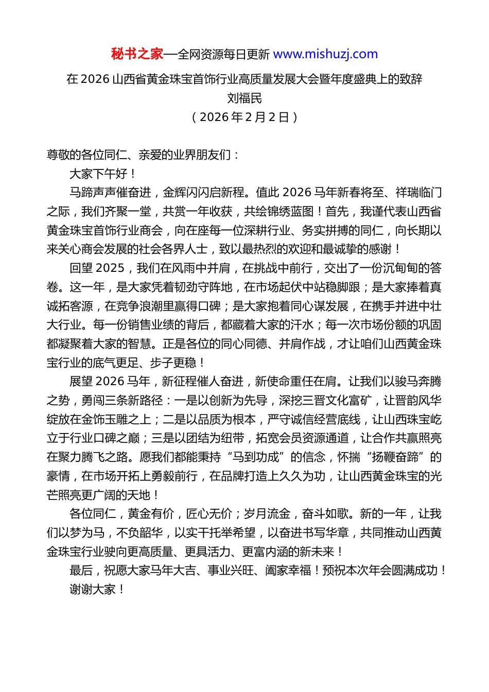 秘书之家—全网资源每日更新 www.mishuzj.com在 2026 山西省黄金珠宝首饰行业高质量发展大会暨年度盛典上的致辞刘福民(2026 年 2 月 2 日)尊敬的各位同仁、亲爱的业界朋友们:大家下午好!马蹄声声催奋进,金辉闪闪启新程。值此 2026 马年新春将至、祥瑞临门之际,我们齐聚一堂,共赏一年收获,共绘锦绣蓝图!首先,我谨代表山西省黄金珠宝首饰行业商会,向在座每一位深耕行业、务实拼搏的同仁,向长期以来关心商会发展的社会各界人士,致以最热烈的欢迎和最诚挚的感谢!回望 2025,我们在风雨中并肩,在挑战中前行,交出了一份沉甸甸的答卷。这一年,是大家凭着韧劲守阵地,在市场起伏中站稳脚跟;是大家捧着真诚拓客源,在竞争浪潮里赢得口碑;是大家抱着同心谋发展,在携手并进中壮大行业。每一份销售业绩的背后,都藏着大家的汗水;每一次市场份额的巩固都凝聚着大家的智慧。正是各位的同心同德、并肩作战,才让咱们山西黄金珠宝行业的底气更足、步子更稳!展望 2026 马年,新征程催人奋进,新使命重任在肩。让我们以骏马奔腾之势,勇闯三条新路径:一是以创新为先导,深挖三晋文化富矿,让晋韵风华绽放在金饰玉雕之上;二是以品质为根本,严守诚信经营底线,让山西珠宝屹立于行业口碑之巅;三是以团结为纽带,拓宽会员资源通道,让合作共赢照亮在聚力腾飞之路。愿我们都能秉持“马到功成”的信念,怀揣“扬鞭奋蹄”的豪情,在市场开拓上勇毅前行,在品牌打造上久久为功,让山西黄金珠宝的光芒照亮更广阔的天地!各位同仁,黄金有价,匠心无价;岁月流金,奋斗如歌。新的一年,让我们以梦为马,不负韶华,以实干托举希望,以奋进书写华章,共同推动山西黄金珠宝行业驶向更高质量、更具活力、更富内涵的新未来!最后,祝愿大家马年大吉、事业兴旺、阖家幸福!预祝本次年会圆满成功!谢谢大家!
