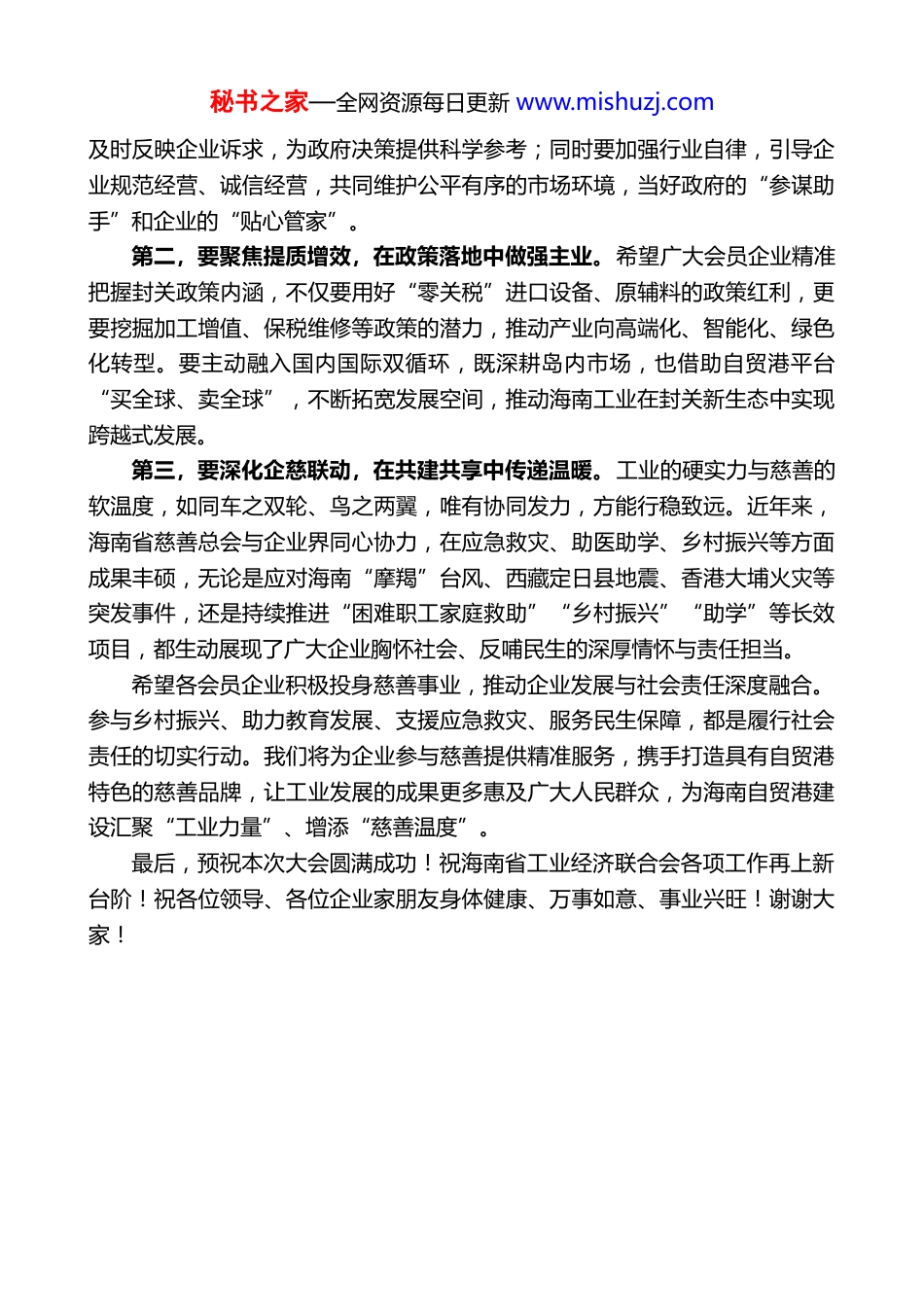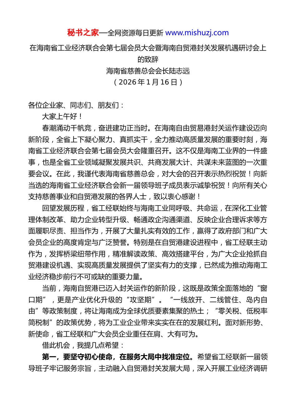 秘书之家—全网资源每日更新 www.mishuzj.com在海南省工业经济联合会第七届会员大会暨海南自贸港封关发展机遇研讨会上的致辞海南省慈善总会会长陆志远(2026 年 1 月 16 日)各位企业家、同志们、朋友们:大家上午好!春潮涌动千帆竞,奋进建功正当时。在海南自由贸易港封关运作建设迈向新阶段,全省上下凝心聚力、真抓实干,全力推动高质量发展的重要时刻,海南省工业经济联合会第七届会员大会隆重召开。这不仅是海南工业界的一件盛事,也是全省工业领域凝聚发展共识、共商发展大计、共谋未来蓝图的一次重要会议。在此,我谨代表海南省慈善总会,对大会的召开表示热烈祝贺!向新当选的海南省工业经济联合会新一届领导班子成员表示诚挚祝贺!向所有关心支持慈善事业和自贸港发展的各界人士,致以衷心感谢!回望发展历程,省工经联始终与海南工业同呼吸、共命运,在深化工业管理体制改革、助力企业转型升级、畅通政企沟通渠道、反映企业合理诉求等方面履职尽责、担当作为,开展了大量扎实有效的工作,赢得了政府部门和广大会员企业的高度肯定与广泛赞誉。特别是在自贸港建设进程中,省工经联主动作为,发挥桥梁纽带作用,精准解读政策、高效搭建平台,为广大企业抢抓自贸港建设机遇、实现高质量发展提供了坚实有力的支撑,已然成为推动海南工业经济稳步前行不可或缺的重要力量。当前,海南自贸港已迈入封关运作的新阶段,这既是政策全面落地的“窗口期”,更是产业优化升级的“攻坚期”。“一线放开、二线管住、岛内自由”等政策制度,将让海南成为全球优质要素集聚的热土;“零关税、低税率简税制”的政策优势,将为工业企业带来实实在在的发展红利。面对新形势、新使命,省工经联和广大会员企业重任在肩、大有可为。借此机会,我提几点希望:第一,要坚守初心使命,在服务大局中找准定位。希望省工经联新一届领导班子牢记服务宗旨,主动融入自贸港封关发展大局,深入开展工业经济调研秘书之家—全网资源每日更新 www.mishuzj.com及时反映企业诉求,为政府决策提供科学参考;同时要加强行业自律,引导企业规范经营、诚信经营,共同维护公平有序的市场环境,当好政府的“参谋助手”和企业的“贴心管家”。第二,要聚焦提质增效,在政策落地中做强主业。希望广大会员企业精准把握封关政策内涵,不仅要用好“零关税”进口设备、原辅料的政策红利,更要挖掘加工增值、保税维修等政策的潜力,推动产业向高端化、智能化、绿色化转型。要主动融入国内国际双循环,既深耕岛内市场,也借助自贸港平台“买全球、卖全球”,不断拓宽发展空间,推动海南工业在封关新生态中实现跨越式发展。第三,要深化企慈联动,在共建共享中传递温暖。工业的硬实力与慈善的软温度,如同车之双轮、鸟之两翼,唯有协同发力,方能行稳致远。近年来,海南省慈善总会与企业界同心协力,在应急救灾、助医助学、乡村振兴等方面成果丰硕,无论是应对海南“摩羯”台风、西藏定日县地震、香港大埔火灾等突发事件,还是持续推进“困难职工家庭救助”“乡村振兴”“助学”等长效项目,都生动展现了广大企业胸怀社会、反哺民生的深厚情怀与责任担当。希望各会员企业积极投身慈善事业,推动企业发展与社会责任深度融合。参与乡村振兴、助力教育发展、支援应急救灾、服务民生保障,都是履行社会责任的切实行动。我们将为企业参与慈善提供精准服务,携手打造具有自贸港特色的慈善品牌,让工业发展的成果更多惠及广大人民群众,为海南自贸港建设汇聚“工业力量”、增添“慈善温度”。最后,预祝本次大会圆满成功!祝海南省工业经济联合会各项工作再上新台阶!祝各位领导、各位企业家朋友身体健康、万事如意、事业兴旺!谢谢大家!