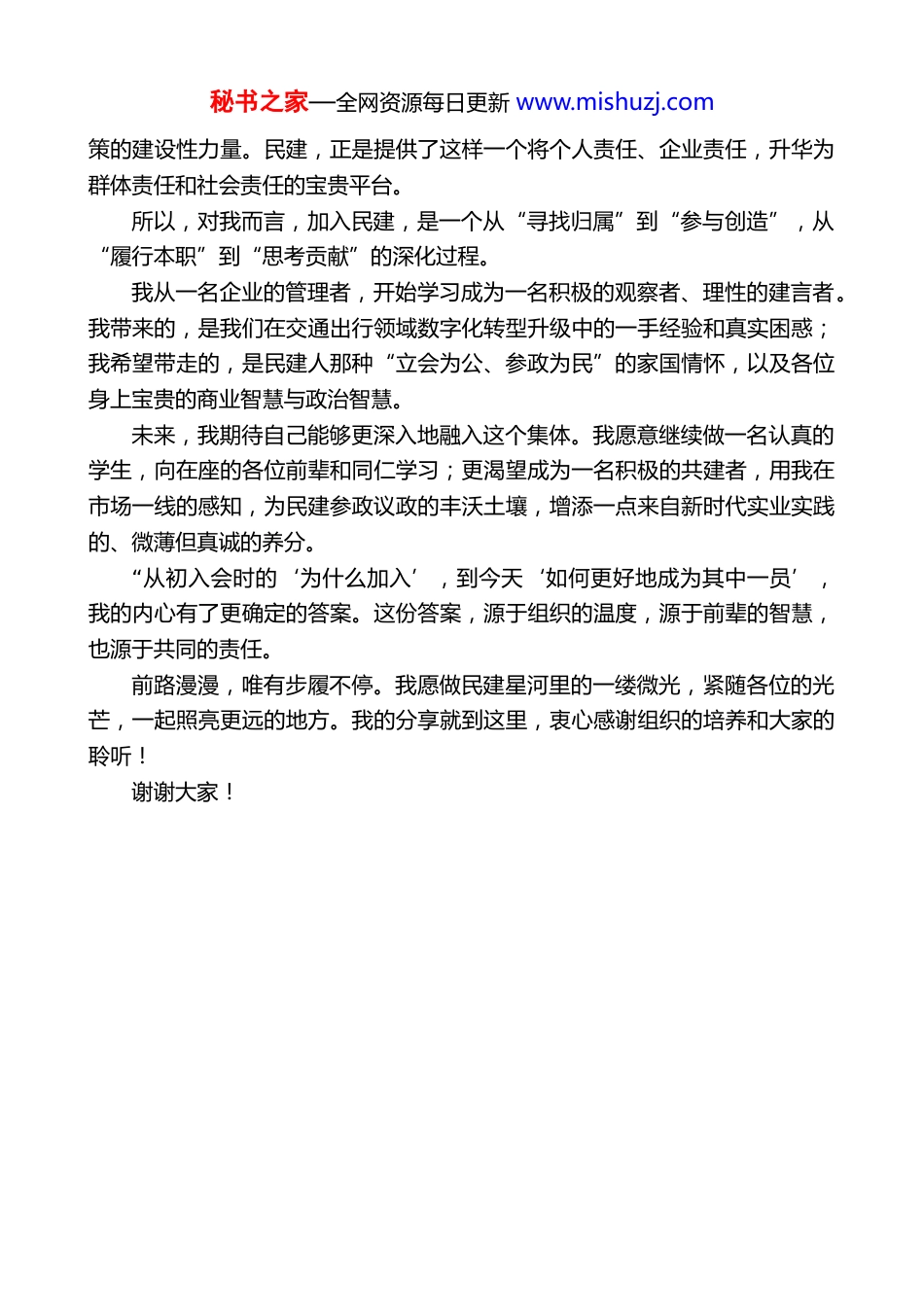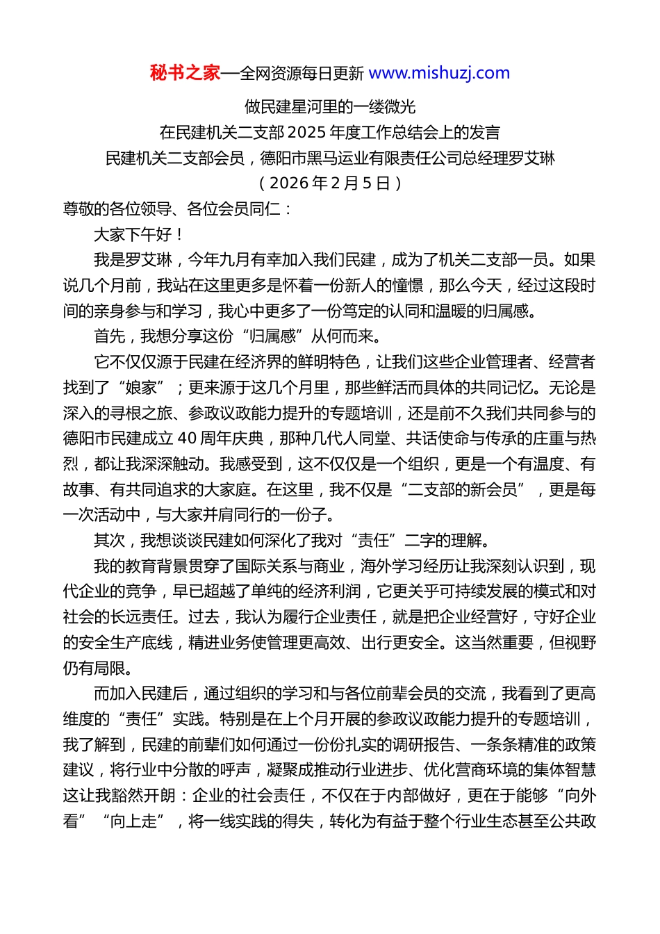 秘书之家—全网资源每日更新 www.mishuzj.com做民建星河里的一缕微光在民建机关二支部 2025 年度工作总结会上的发言民建机关二支部会员,德阳市黑马运业有限责任公司总经理罗艾琳(2026 年 2 月 5 日)尊敬的各位领导、各位会员同仁:大家下午好!我是罗艾琳,今年九月有幸加入我们民建,成为了机关二支部一员。如果说几个月前,我站在这里更多是怀着一份新人的憧憬,那么今天,经过这段时间的亲身参与和学习,我心中更多了一份笃定的认同和温暖的归属感。首先,我想分享这份“归属感”从何而来。它不仅仅源于民建在经济界的鲜明特色,让我们这些企业管理者、经营者找到了“娘家”;更来源于这几个月里,那些鲜活而具体的共同记忆。无论是深入的寻根之旅、参政议政能力提升的专题培训,还是前不久我们共同参与的德阳市民建成立 40 周年庆典,那种几代人同堂、共话使命与传承的庄重与热烈,都让我深深触动。我感受到,这不仅仅是一个组织,更是一个有温度、有故事、有共同追求的大家庭。在这里,我不仅是“二支部的新会员”,更是每一次活动中,与大家并肩同行的一份子。其次,我想谈谈民建如何深化了我对“责任”二字的理解。我的教育背景贯穿了国际关系与商业,海外学习经历让我深刻认识到,现代企业的竞争,早已超越了单纯的经济利润,它更关乎可持续发展的模式和对社会的长远责任。过去,我认为履行企业责任,就是把企业经营好,守好企业的安全生产底线,精进业务使管理更高效、出行更安全。这当然重要,但视野仍有局限。而加入民建后,通过组织的学习和与各位前辈会员的交流,我看到了更高维度的“责任”实践。特别是在上个月开展的参政议政能力提升的专题培训,我了解到,民建的前辈们如何通过一份份扎实的调研报告、一条条精准的政策建议,将行业中分散的呼声,凝聚成推动行业进步、优化营商环境的集体智慧这让我豁然开朗:企业的社会责任,不仅在于内部做好,更在于能够“向外看”“向上走”,将一线实践的得失,转化为有益于整个行业生态甚至公共政秘书之家—全网资源每日更新 www.mishuzj.com策的建设性力量。民建,正是提供了这样一个将个人责任、企业责任,升华为群体责任和社会责任的宝贵平台。所以,对我而言,加入民建,是一个从“寻找归属”到“参与创造”,从“履行本职”到“思考贡献”的深化过程。我从一名企业的管理者,开始学习成为一名积极的观察者、理性的建言者。我带来的,是我们在交通出行领域数字化转型升级中的一手经验和真实困惑;我希望带走的,是民建人那种“立会为公、参政为民”的家国情怀,以及各位身上宝贵的商业智慧与政治智慧。未来,我期待自己能够更深入地融入这个集体。我愿意继续做一名认真的学生,向在座的各位前辈和同仁学习;更渴望成为一名积极的共建者,用我在市场一线的感知,为民建参政议政的丰沃土壤,增添一点来自新时代实业实践的、微薄但真诚的养分。“从初入会时的‘为什么加入’,到今天‘如何更好地成为其中一员’,我的内心有了更确定的答案。这份答案,源于组织的温度,源于前辈的智慧,也源于共同的责任。前路漫漫,唯有步履不停。我愿做民建星河里的一缕微光,紧随各位的光芒,一起照亮更远的地方。我的分享就到这里,衷心感谢组织的培养和大家的聆听!谢谢大家!