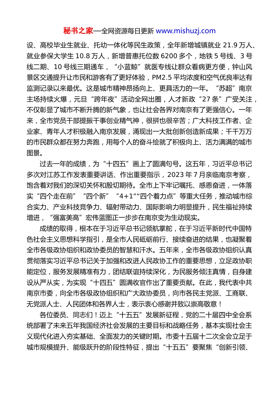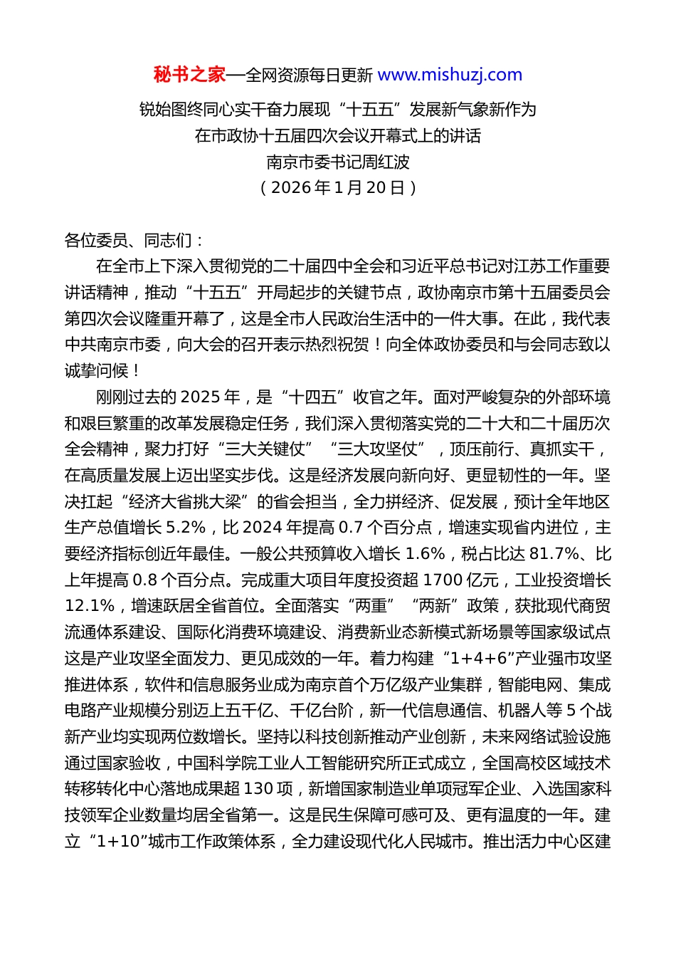 秘书之家—全网资源每日更新 www.mishuzj.com锐始图终同心实干奋力展现“十五五”发展新气象新作为在市政协十五届四次会议开幕式上的讲话南京市委书记周红波(2026 年 1 月 20 日)各位委员、同志们:在全市上下深入贯彻党的二十届四中全会和习近平总书记对江苏工作重要讲话精神,推动“十五五”开局起步的关键节点,政协南京市第十五届委员会第四次会议隆重开幕了,这是全市人民政治生活中的一件大事。在此,我代表中共南京市委,向大会的召开表示热烈祝贺!向全体政协委员和与会同志致以诚挚问候!刚刚过去的 2025 年,是“十四五”收官之年。面对严峻复杂的外部环境和艰巨繁重的改革发展稳定任务,我们深入贯彻落实党的二十大和二十届历次全会精神,聚力打好“三大关键仗”“三大攻坚仗”,顶压前行、真抓实干,在高质量发展上迈出坚实步伐。这是经济发展向新向好、更显韧性的一年。坚决扛起“经济大省挑大梁”的省会担当,全力拼经济、促发展,预计全年地区生产总值增长 5.2%,比 2024 年提高 0.7 个百分点,增速实现省内进位,主要经济指标创近年最佳。一般公共预算收入增长 1.6%,税占比达 81.7%、比上年提高 0.8 个百分点。完成重大项目年度投资超 1700 亿元,工业投资增长12.1%,增速跃居全省首位。全面落实“两重”“两新”政策,获批现代商贸流通体系建设、国际化消费环境建设、消费新业态新模式新场景等国家级试点这是产业攻坚全面发力、更见成效的一年。着力构建“1+4+6”产业强市攻坚推进体系,软件和信息服务业成为南京首个万亿级产业集群,智能电网、集成电路产业规模分别迈上五千亿、千亿台阶,新一代信息通信、机器人等 5 个战新产业均实现两位数增长。坚持以科技创新推动产业创新,未来网络试验设施通过国家验收,中国科学院工业人工智能研究所正式成立,全国高校区域技术转移转化中心落地成果超 130 项,新增国家制造业单项冠军企业、入选国家科技领军企业数量均居全省第一。这是民生保障可感可及、更有温度的一年。建立“1+10”城市工作政策体系,全力建设现代化人民城市。推出活力中心区建秘书之家—全网资源每日更新 www.mishuzj.com设、高校毕业生就业、托幼一体化等民生政策,全年新增城镇就业 21.9 万人、就业参保大学生 10.8 万人,新增普惠托位数 6200 多个,地铁 5 号线、3 号线二期、10 号线三期通车,“小蓝鲸”就医专线让群众看病更方便,钟山风景区交通提升让市民和游客有了更好体验,PM2.5 平均浓度和空气优良率达有监测记录以来最优。这是城市精神昂扬向上、更具活力的一年。“苏超”南京主场持续火爆,元旦“跨年夜”活动全网出圈,人才新政“27 条”广受关注,不仅彰显了城市不断升腾的新气象,也让社会各界对南京有了更强信心。一年来,全市党员干部提振干事创业精气神,很拼也很辛苦;广大科技工作者、企业家、青年人才积极融入南京发展,涌现出一大批创新创造新成果;千千万万的市民群众都在努力奔跑,用每个人的奋斗绘就了积极向上、活力满满的城市图景。过去一年的成绩,为“十四五”画上了圆满句号。这五年,习近平总书记多次对江苏工作发表重要讲话、作出重要指示,2023 年 7 月亲临南京考察,饱含着对我们的深切关怀和殷切期待。全市上下牢记嘱托、感恩奋进,一体落实“四个走在前”“四个新”“4+1”“四个着力点”等重大任务,推动城市综合实力、产业科技竞争力、辐射带动力、国际影响力明显提升,民生福祉持续增进,“强富美高”宏伟蓝图正一步步在南京变为生动现实。成绩的取得,根本在于习近平总书记领航掌舵,在于习近平新时代中国特色社会主义思想科学指引,是全市人民砥砺前行、接续奋进的结果,也凝聚着全市各级政协组织和政协委员的智慧和汗水。五年来,全市各级政协组织认真贯彻落实习近平总书记关于加强和改进人民政协工作的重要思想,立足政协职能定位,服务发展精准有力,团结联谊持续深化,为民服务倾注真情,自身建设从严从实,为实现“十四五”圆满收官作出了重要贡献。在此,我代表中共南京市委,向全市各级政协组织和广大政协委员,向市各民主党派、工商联、无党派人士、...