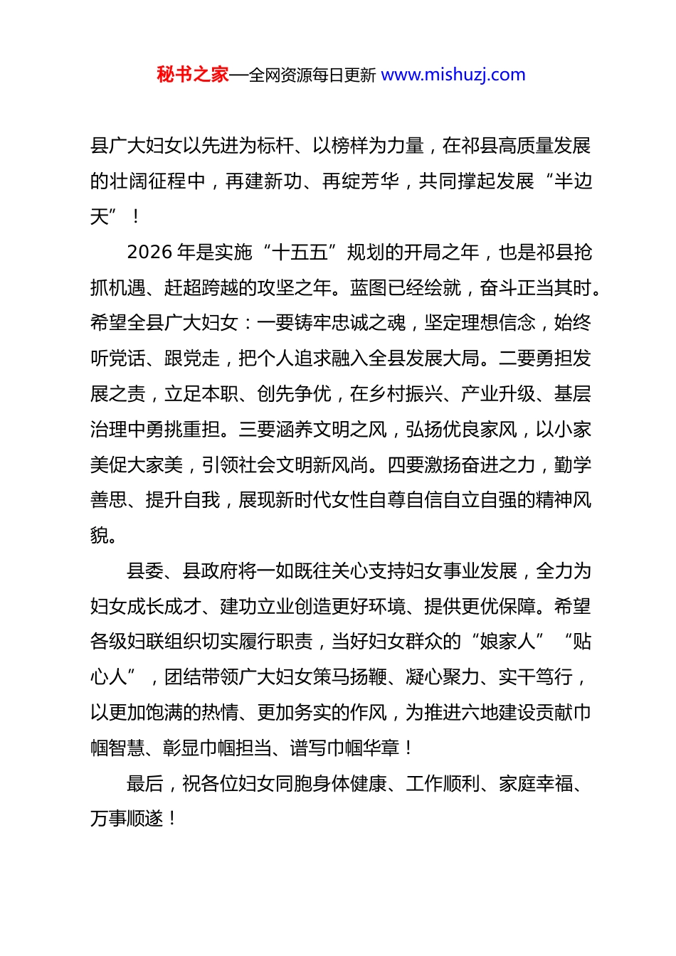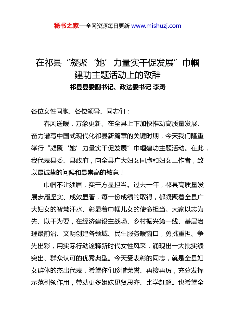 秘书之家—全网资源每日更新 www.mishuzj.com在祁县“凝聚‘她’力量实干促发展”巾帼建功主题活动上的致辞祁县县委副书记、政法委书记 李涛各位女性同胞、各位领导、同志们:春风送暖,万象更新。在全县上下加快推动高质量发展、奋力谱写中国式现代化祁县新篇章的关键时期,今天我们隆重举行“凝聚‘她’力量实干促发展”巾帼建功主题活动。在此,我代表县委、县政府,向全县广大妇女同胞和妇女工作者,致以最诚挚的问候和最崇高的敬意! 巾帼不让须眉,实干方显担当。过去一年,祁县高质量发展步履坚实、成效显著,每一份成绩的取得,都凝聚着全县广大妇女的智慧汗水、彰显着巾帼儿女的使命担当。大家以志为先、以干为要,在经济建设主战场、乡村振兴第一线、基层治理最前沿、文明创建各领域、民生服务暖窗口,勇挑重担、争先出彩,用实际行动诠释新时代女性风采,涌现出一大批实绩突出、群众认可的优秀典型。今天受表彰的同志,就是全县妇女群体的杰出代表,希望你们珍惜荣誉、再接再厉,充分发挥示范引领作用,带动更多姐妹见贤思齐、比学赶超。也希望全秘书之家—全网资源每日更新 www.mishuzj.com县广大妇女以先进为标杆、以榜样为力量,在祁县高质量发展的壮阔征程中,再建新功、再绽芳华,共同撑起发展“半边天”!2026 年是实施“十五五”规划的开局之年,也是祁县抢抓机遇、赶超跨越的攻坚之年。蓝图已经绘就,奋斗正当其时。希望全县广大妇女:一要铸牢忠诚之魂,坚定理想信念,始终听党话、跟党走,把个人追求融入全县发展大局。二要勇担发展之责,立足本职、创先争优,在乡村振兴、产业升级、基层治理中勇挑重担。三要涵养文明之风,弘扬优良家风,以小家美促大家美,引领社会文明新风尚。四要激扬奋进之力,勤学善思、提升自我,展现新时代女性自尊自信自立自强的精神风貌。县委、县政府将一如既往关心支持妇女事业发展,全力为妇女成长成才、建功立业创造更好环境、提供更优保障。希望各级妇联组织切实履行职责,当好妇女群众的“娘家人”“贴心人”,团结带领广大妇女策马扬鞭、凝心聚力、实干笃行,以更加饱满的热情、更加务实的作风,为推进六地建设贡献巾帼智慧、彰显巾帼担当、谱写巾帼华章!最后,祝各位妇女同胞身体健康、工作顺利、家庭幸福、万事顺遂!秘书之家—全网资源每日更新 www.mishuzj.com