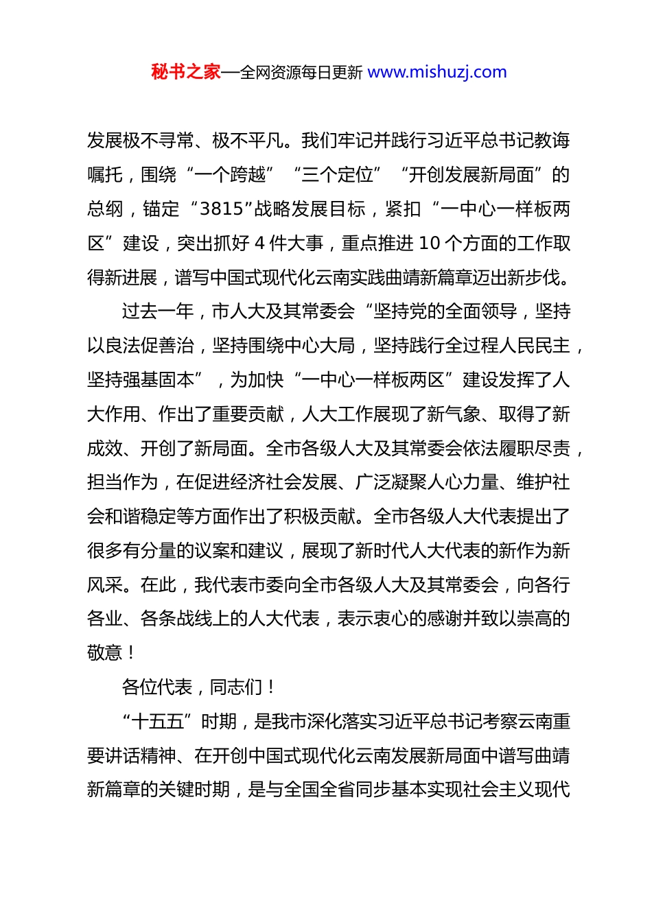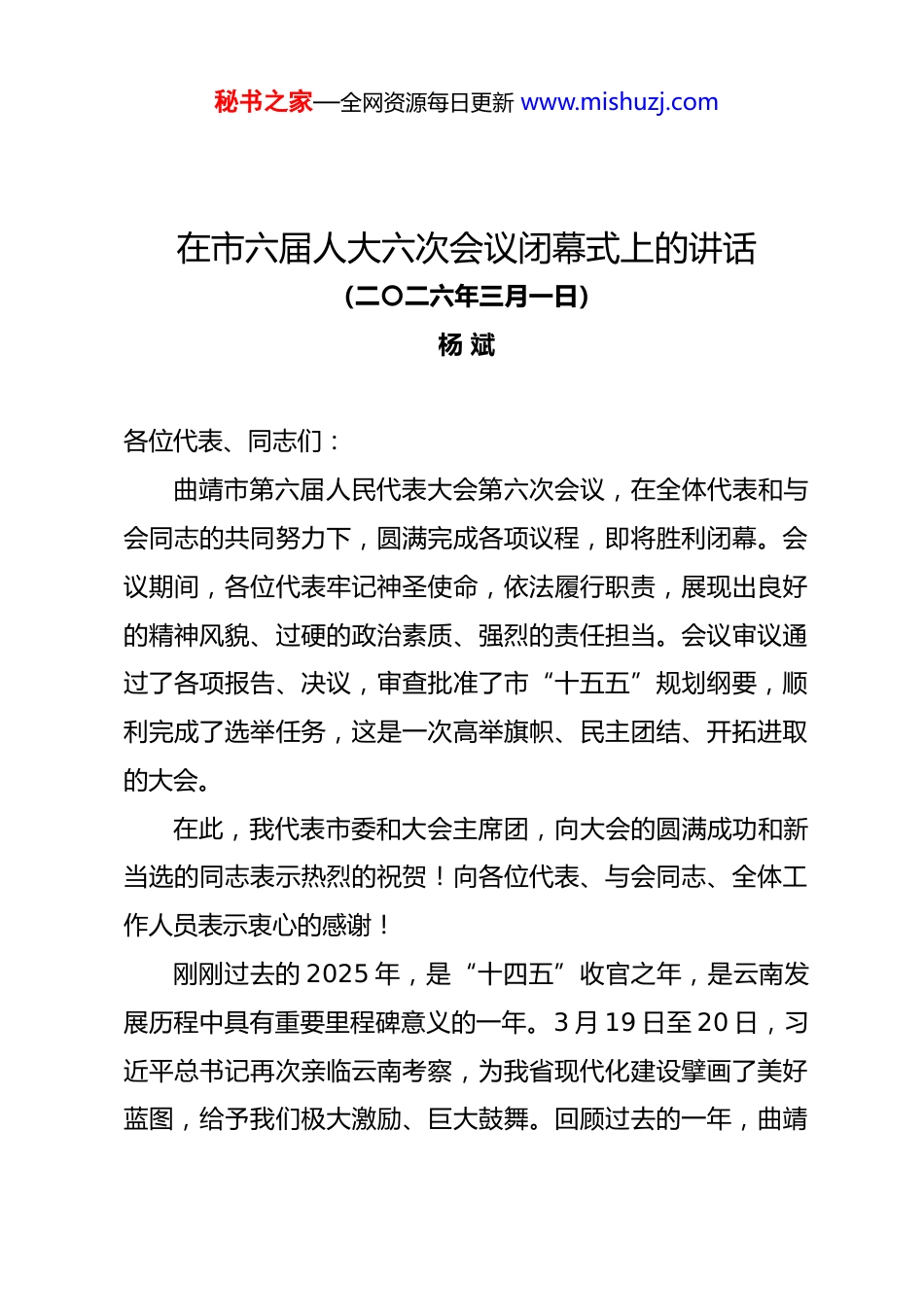 秘书之家—全网资源每日更新 www.mishuzj.com在市六届人大六次会议闭幕式上的讲话(二〇二六年三月一日)杨 斌各位代表、同志们:曲靖市第六届人民代表大会第六次会议,在全体代表和与会同志的共同努力下,圆满完成各项议程,即将胜利闭幕。会议期间,各位代表牢记神圣使命,依法履行职责,展现出良好的精神风貌、过硬的政治素质、强烈的责任担当。会议审议通过了各项报告、决议,审查批准了市“十五五”规划纲要,顺利完成了选举任务,这是一次高举旗帜、民主团结、开拓进取的大会。在此,我代表市委和大会主席团,向大会的圆满成功和新当选的同志表示热烈的祝贺!向各位代表、与会同志、全体工作人员表示衷心的感谢!刚刚过去的 2025 年,是“十四五”收官之年,是云南发展历程中具有重要里程碑意义的一年。3 月 19 日至 20 日,习近平总书记再次亲临云南考察,为我省现代化建设擘画了美好蓝图,给予我们极大激励、巨大鼓舞。回顾过去的一年,曲靖秘书之家—全网资源每日更新 www.mishuzj.com发展极不寻常、极不平凡。我们牢记并践行习近平总书记教诲嘱托,围绕“一个跨越”“三个定位”“开创发展新局面”的总纲,锚定“3815”战略发展目标,紧扣“一中心一样板两区”建设,突出抓好 4 件大事,重点推进 10 个方面的工作取得新进展,谱写中国式现代化云南实践曲靖新篇章迈出新步伐。过去一年,市人大及其常委会“坚持党的全面领导,坚持以良法促善治,坚持围绕中心大局,坚持践行全过程人民民主,坚持强基固本”,为加快“一中心一样板两区”建设发挥了人大作用、作出了重要贡献,人大工作展现了新气象、取得了新成效、开创了新局面。全市各级人大及其常委会依法履职尽责,担当作为,在促进经济社会发展、广泛凝聚人心力量、维护社会和谐稳定等方面作出了积极贡献。全市各级人大代表提出了很多有分量的议案和建议,展现了新时代人大代表的新作为新风采。在此,我代表市委向全市各级人大及其常委会,向各行各业、各条战线上的人大代表,表示衷心的感谢并致以崇高的敬意!各位代表,同志们!“十五五”时期,是我市深化落实习近平总书记考察云南重要讲话精神、在开创中国式现代化云南发展新局面中谱写曲靖新篇章的关键时期,是与全国全省同步基本实现社会主义现代秘书之家—全网资源每日更新 www.mishuzj.com化夯实基础、全面发力的关键时期。今年是中国共产党成立105 周年,是“十五五”开局之年。五年看头年,开局最关键。全市上下要坚持以习近平新时代中国特色社会主义思想为指导,全面贯彻党的二十大和二十届历次全会精神,深化落实习近平总书记考察云南重要讲话精神,认真贯彻省委对曲靖“六个方面继续下功夫、取得新突破”的工作安排,落细落实市委经济工作会议部署的“七个方面迈出坚实步伐、实现良好开局”的具体要求,以干在实处、走在前列、勇立潮头的精气神推动“十五五”开好局、起好步,以实干实绩坚定拥护“两个确立”、坚决做到“两个维护”。——实现“十五五”开好局起好步,要坚定不移坚持高质量发展这个新时代的硬道理,在加快建设高质量跨越式发展云南副中心城市上迈出坚实步伐、实现良好开局。推动高质量发展,是“十五五”时期经济社会发展的主题。我们要完整准确全面贯彻新发展理念,主动服务和融入新发展格局,着力推动高质量发展,推动经济实现质的有效提升和量的合理增长。要加快构建现代化产业体系,实施传统支柱产业巩固提升、新兴产业发展壮大、未来产业培育发展“三大工程”,加快建设云南先进制造业中心、绿色制造强省高地、绿色能源强市。要实施有效需求提振工程,深入实施提振消费专项行动、有效投资秘书之家—全网资源每日更新 www.mishuzj.com增量提质行动、项目攻坚年行动。要因地制宜发展新质生产力,抢抓新一轮科技革命和产业变革机遇,扎扎实实做好“五个创新”大文章,持续打造一流的创新生态、人才生态、产业生态,持续打造一流的市场化、法治化、国际化营商环境,持续打造一流的体制内外贯通融合、能为经营主体提供优质服务的团队,务实推进“AI+、科创+、绿色+、特色+、文创+”五项行动,推动场景培育开放和新场景大...