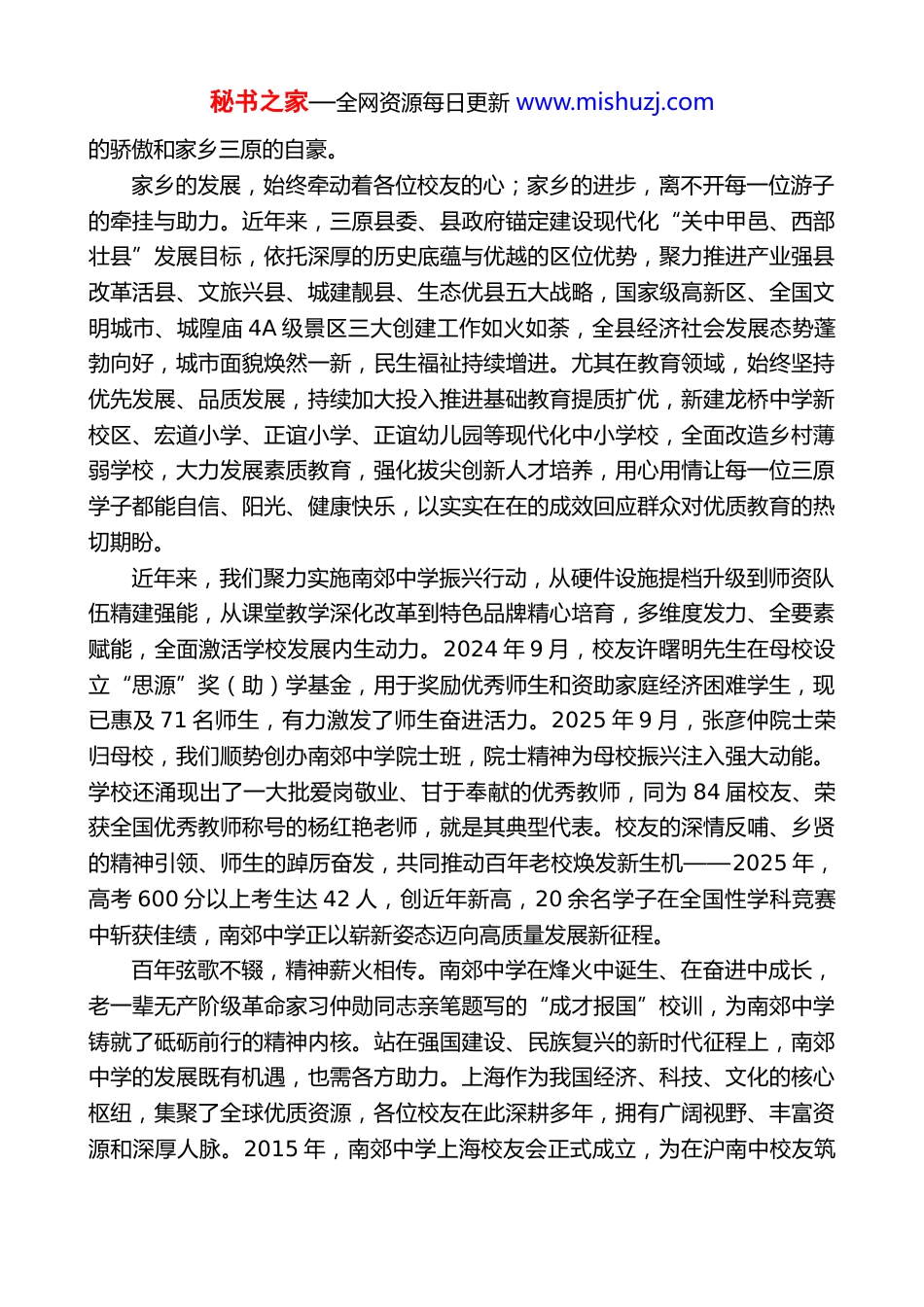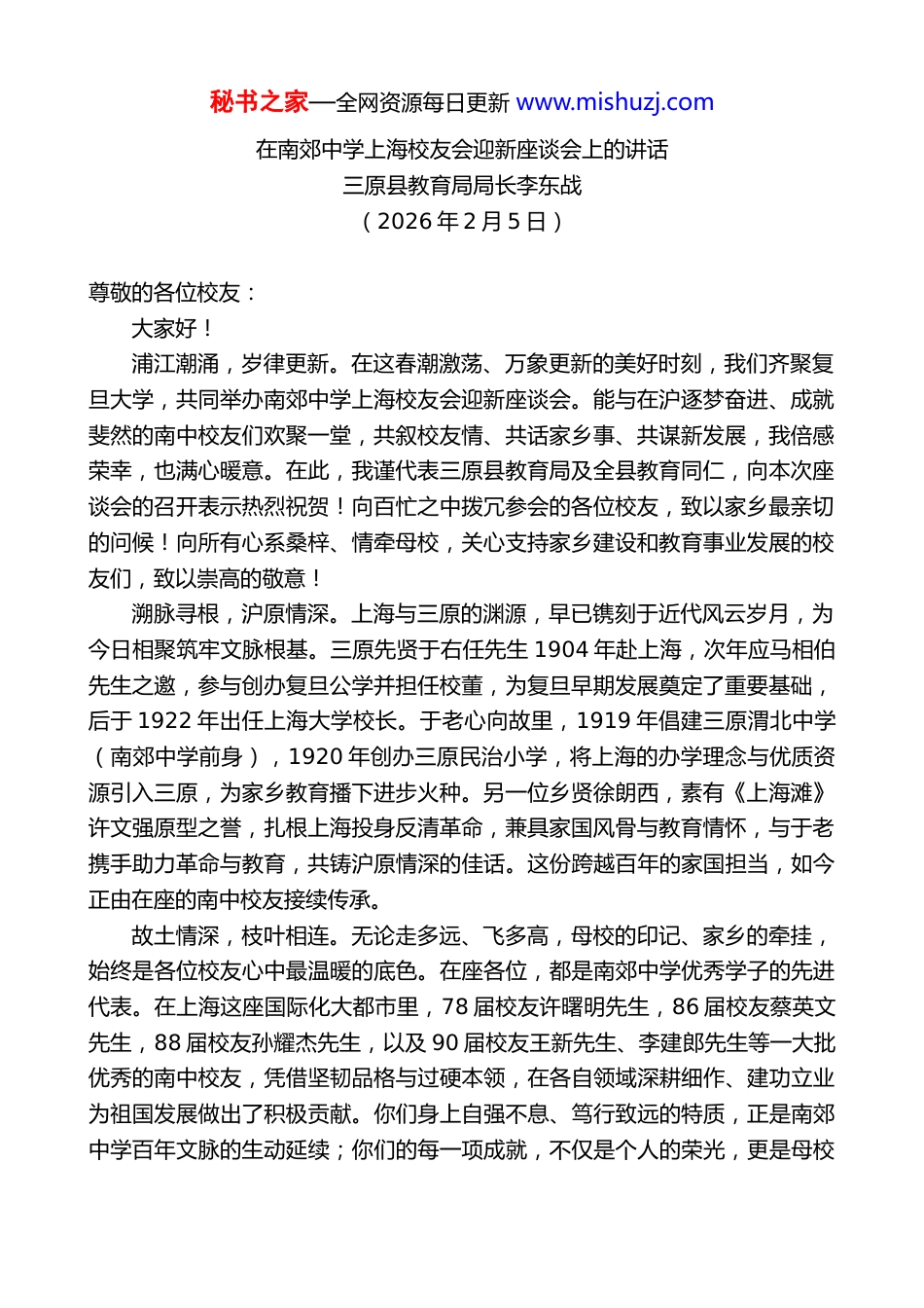 秘书之家—全网资源每日更新 www.mishuzj.com在南郊中学上海校友会迎新座谈会上的讲话三原县教育局局长李东战(2026 年 2 月 5 日)尊敬的各位校友:大家好!浦江潮涌,岁律更新。在这春潮激荡、万象更新的美好时刻,我们齐聚复旦大学,共同举办南郊中学上海校友会迎新座谈会。能与在沪逐梦奋进、成就斐然的南中校友们欢聚一堂,共叙校友情、共话家乡事、共谋新发展,我倍感荣幸,也满心暖意。在此,我谨代表三原县教育局及全县教育同仁,向本次座谈会的召开表示热烈祝贺!向百忙之中拨冗参会的各位校友,致以家乡最亲切的问候!向所有心系桑梓、情牵母校,关心支持家乡建设和教育事业发展的校友们,致以崇高的敬意!溯脉寻根,沪原情深。上海与三原的渊源,早已镌刻于近代风云岁月,为今日相聚筑牢文脉根基。三原先贤于右任先生 1904 年赴上海,次年应马相伯先生之邀,参与创办复旦公学并担任校董,为复旦早期发展奠定了重要基础,后于 1922 年出任上海大学校长。于老心向故里,1919 年倡建三原渭北中学(南郊中学前身),1920 年创办三原民治小学,将上海的办学理念与优质资源引入三原,为家乡教育播下进步火种。另一位乡贤徐朗西,素有《上海滩》许文强原型之誉,扎根上海投身反清革命,兼具家国风骨与教育情怀,与于老携手助力革命与教育,共铸沪原情深的佳话。这份跨越百年的家国担当,如今正由在座的南中校友接续传承。故土情深,枝叶相连。无论走多远、飞多高,母校的印记、家乡的牵挂,始终是各位校友心中最温暖的底色。在座各位,都是南郊中学优秀学子的先进代表。在上海这座国际化大都市里,78 届校友许曙明先生,86 届校友蔡英文先生,88 届校友孙耀杰先生,以及 90 届校友王新先生、李建郎先生等一大批优秀的南中校友,凭借坚韧品格与过硬本领,在各自领域深耕细作、建功立业为祖国发展做出了积极贡献。你们身上自强不息、笃行致远的特质,正是南郊中学百年文脉的生动延续;你们的每一项成就,不仅是个人的荣光,更是母校秘书之家—全网资源每日更新 www.mishuzj.com的骄傲和家乡三原的自豪。家乡的发展,始终牵动着各位校友的心;家乡的进步,离不开每一位游子的牵挂与助力。近年来,三原县委、县政府锚定建设现代化“关中甲邑、西部壮县”发展目标,依托深厚的历史底蕴与优越的区位优势,聚力推进产业强县改革活县、文旅兴县、城建靓县、生态优县五大战略,国家级高新区、全国文明城市、城隍庙 4A 级景区三大创建工作如火如荼,全县经济社会发展态势蓬勃向好,城市面貌焕然一新,民生福祉持续增进。尤其在教育领域,始终坚持优先发展、品质发展,持续加大投入推进基础教育提质扩优,新建龙桥中学新校区、宏道小学、正谊小学、正谊幼儿园等现代化中小学校,全面改造乡村薄弱学校,大力发展素质教育,强化拔尖创新人才培养,用心用情让每一位三原学子都能自信、阳光、健康快乐,以实实在在的成效回应群众对优质教育的热切期盼。近年来,我们聚力实施南郊中学振兴行动,从硬件设施提档升级到师资队伍精建强能,从课堂教学深化改革到特色品牌精心培育,多维度发力、全要素赋能,全面激活学校发展内生动力。2024 年 9 月,校友许曙明先生在母校设立“思源”奖(助)学基金,用于奖励优秀师生和资助家庭经济困难学生,现已惠及 71 名师生,有力激发了师生奋进活力。2025 年 9 月,张彦仲院士荣归母校,我们顺势创办南郊中学院士班,院士精神为母校振兴注入强大动能。学校还涌现出了一大批爱岗敬业、甘于奉献的优秀教师,同为 84 届校友、荣获全国优秀教师称号的杨红艳老师,就是其典型代表。校友的深情反哺、乡贤的精神引领、师生的踔厉奋发,共同推动百年老校焕发新生机——2025 年,高考 600 分以上考生达 42 人,创近年新高,20 余名学子在全国性学科竞赛中斩获佳绩,南郊中学正以崭新姿态迈向高质量发展新征程。百年弦歌不辍,精神薪火相传。南郊中学在烽火中诞生、在奋进中成长,老一辈无产阶级革命家习仲勋同志亲笔题写的“成才报国”校训,为南郊中学铸就了砥砺前行的精神内核。站在强国建设、民族复兴的新时代征程上,南郊中...