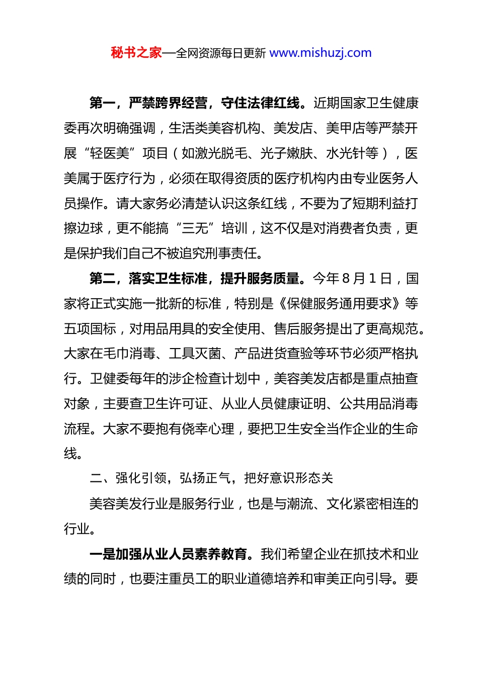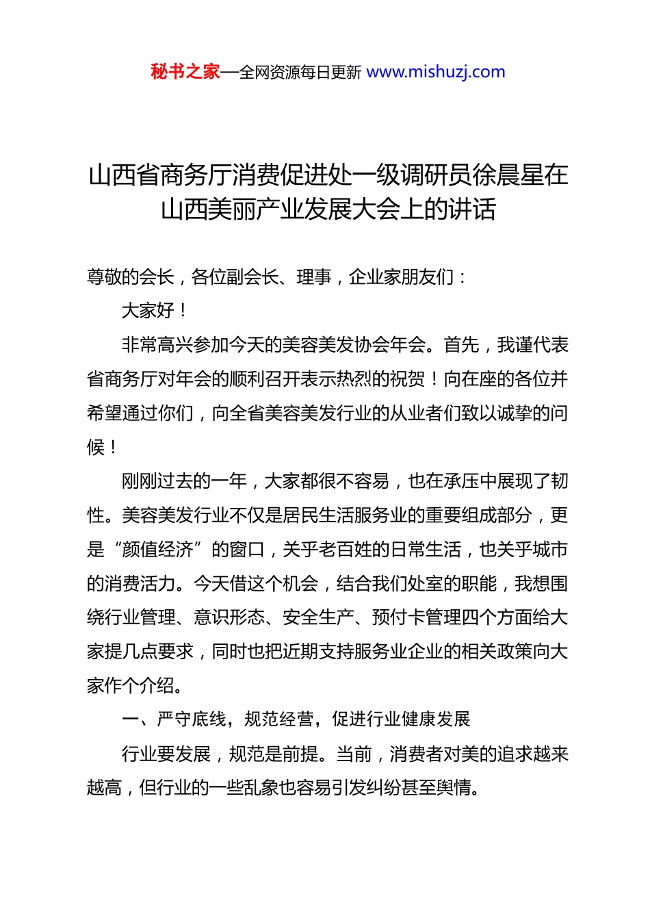 秘书之家—全网资源每日更新 www.mishuzj.com山西省商务厅消费促进处一级调研员徐晨星在山西美丽产业发展大会上的讲话尊敬的会长,各位副会长、理事,企业家朋友们:大家好!非常高兴参加今天的美容美发协会年会。首先,我谨代表省商务厅对年会的顺利召开表示热烈的祝贺!向在座的各位并希望通过你们,向全省美容美发行业的从业者们致以诚挚的问候!刚刚过去的一年,大家都很不容易,也在承压中展现了韧性。美容美发行业不仅是居民生活服务业的重要组成部分,更是“颜值经济”的窗口,关乎老百姓的日常生活,也关乎城市的消费活力。今天借这个机会,结合我们处室的职能,我想围绕行业管理、意识形态、安全生产、预付卡管理四个方面给大家提几点要求,同时也把近期支持服务业企业的相关政策向大家作个介绍。一、严守底线,规范经营,促进行业健康发展行业要发展,规范是前提。当前,消费者对美的追求越来越高,但行业的一些乱象也容易引发纠纷甚至舆情。秘书之家—全网资源每日更新 www.mishuzj.com第一,严禁跨界经营,守住法律红线。近期国家卫生健康委再次明确强调,生活类美容机构、美发店、美甲店等严禁开展“轻医美”项目(如激光脱毛、光子嫩肤、水光针等),医美属于医疗行为,必须在取得资质的医疗机构内由专业医务人员操作。请大家务必清楚认识这条红线,不要为了短期利益打擦边球,更不能搞“三无”培训,这不仅是对消费者负责,更是保护我们自己不被追究刑事责任。第二,落实卫生标准,提升服务质量。今年 8 月 1 日,国家将正式实施一批新的标准,特别是《保健服务通用要求》等五项国标,对用品用具的安全使用、售后服务提出了更高规范。大家在毛巾消毒、工具灭菌、产品进货查验等环节必须严格执行。卫健委每年的涉企检查计划中,美容美发店都是重点抽查对象,主要查卫生许可证、从业人员健康证明、公共用品消毒流程。大家不要抱有侥幸心理,要把卫生安全当作企业的生命线。二、强化引领,弘扬正气,把好意识形态关美容美发行业是服务行业,也是与潮流、文化紧密相连的行业。一是加强从业人员素养教育。我们希望企业在抓技术和业绩的同时,也要注重员工的职业道德培养和审美正向引导。要秘书之家—全网资源每日更新 www.mishuzj.com自觉抵制低俗营销,不搞违背公序良俗的宣传活动,营造阳光、健康、向上的行业形象。二是维护行业清风正气。各位老板要关心关爱员工,特别是要保障好女性职工的合法权益。我们的门店是城市文明的窗口,员工的仪容仪表、言谈举止,反映的是整个行业的精神风貌。三、警钟长鸣,压实责任,筑牢安全生产防线安全生产一失万无。春节刚过,复工复产一定要把安全放在首位。第一,排查消防安全隐患。美发美容店里用电设备多(吹风机、烫发机)、化学品多(染发剂、定型喷雾),火灾风险较高。大家要立即开展自查,检查线路是否老化,疏散通道是否畅通,灭火器是否在有效期内。要建立全员安全责任制,让每个员工都会用消防器材,知道如何逃生。第二,注意用药剂安全管理。对于储存的摩丝、发胶等易燃易爆物品,要远离热源,分类存放。如果涉及购买和使用相关产品,一定要索要票据,确保产品来源合法、质量合格。四、诚信经营,管好钱袋子,规范预付卡管理预付卡问题是目前居民服务行业投诉的重灾区,也是我们商务部门的监管重点。秘书之家—全网资源每日更新 www.mishuzj.com第一,合规备案,接受监管。根据《单用途商业预付卡管理办法(试行)》,凡从事零售业、住宿和餐饮业、居民服务业的企业法人,发行预付卡必须按规定备案。虽然很多美容美发门店是个体工商户(目前不强制纳入商务部备案系统),但只要发卡,就必须遵守“三项制度”:即购卡实名登记(记名卡或一次性购 1 万元以上不记名卡)、非现金购卡(单位5000 元/个人 5 万元以上需银行转账)、限额发行(单张不记名卡不超过 1000 元,记名卡不超过 5000 元)。第二,诚信经营,化解纠纷。我们近期接到的消费者投诉中,发现部分门店存在合同霸王条款、退卡难等问题。请大家一定要和消费者签订书面协议,明确双方权利义务。一旦出现关店歇业,必须提前公示并提供免费退...