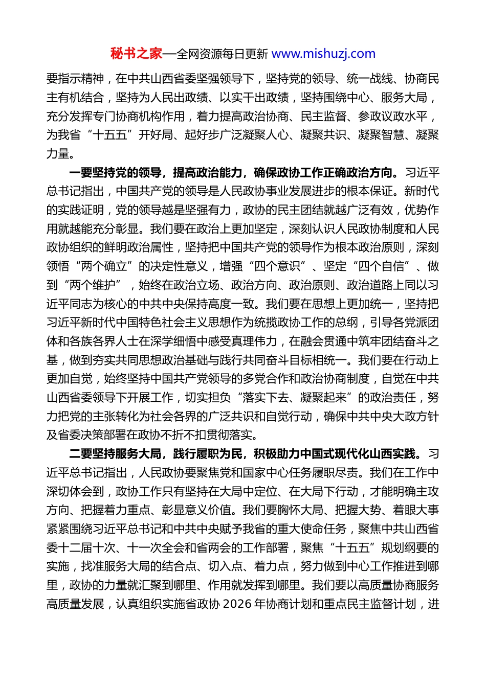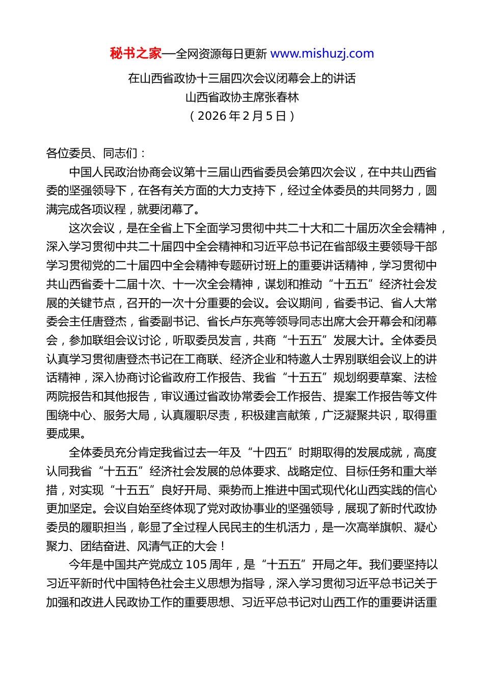 秘书之家—全网资源每日更新 www.mishuzj.com在山西省政协十三届四次会议闭幕会上的讲话山西省政协主席张春林(2026 年 2 月 5 日)各位委员、同志们:中国人民政治协商会议第十三届山西省委员会第四次会议,在中共山西省委的坚强领导下,在各有关方面的大力支持下,经过全体委员的共同努力,圆满完成各项议程,就要闭幕了。这次会议,是在全省上下全面学习贯彻中共二十大和二十届历次全会精神,深入学习贯彻中共二十届四中全会精神和习近平总书记在省部级主要领导干部学习贯彻党的二十届四中全会精神专题研讨班上的重要讲话精神,学习贯彻中共山西省委十二届十次、十一次全会精神,谋划和推动“十五五”经济社会发展的关键节点,召开的一次十分重要的会议。会议期间,省委书记、省人大常委会主任唐登杰,省委副书记、省长卢东亮等领导同志出席大会开幕会和闭幕会,参加联组会议讨论,听取委员发言,共商“十五五”发展大计。全体委员认真学习贯彻唐登杰书记在工商联、经济企业和特邀人士界别联组会议上的讲话精神,深入协商讨论省政府工作报告、我省“十五五”规划纲要草案、法检两院报告和其他报告,审议通过省政协常委会工作报告、提案工作报告等文件围绕中心、服务大局,认真履职尽责,积极建言献策,广泛凝聚共识,取得重要成果。全体委员充分肯定我省过去一年及“十四五”时期取得的发展成就,高度认同我省“十五五”经济社会发展的总体要求、战略定位、目标任务和重大举措,对实现“十五五”良好开局、乘势而上推进中国式现代化山西实践的信心更加坚定。会议自始至终体现了党对政协事业的坚强领导,展现了新时代政协委员的履职担当,彰显了全过程人民民主的生机活力,是一次高举旗帜、凝心聚力、团结奋进、风清气正的大会!今年是中国共产党成立 105 周年,是“十五五”开局之年。我们要坚持以习近平新时代中国特色社会主义思想为指导,深入学习贯彻习近平总书记关于加强和改进人民政协工作的重要思想、习近平总书记对山西工作的重要讲话重秘书之家—全网资源每日更新 www.mishuzj.com要指示精神,在中共山西省委坚强领导下,坚持党的领导、统一战线、协商民主有机结合,坚持为人民出政绩、以实干出政绩,坚持围绕中心、服务大局,充分发挥专门协商机构作用,着力提高政治协商、民主监督、参政议政水平,为我省“十五五”开好局、起好步广泛凝聚人心、凝聚共识、凝聚智慧、凝聚力量。一要坚持党的领导,提高政治能力,确保政协工作正确政治方向。习近平总书记指出,中国共产党的领导是人民政协事业发展进步的根本保证。新时代的实践证明,党的领导越是坚强有力,政协的民主团结就越广泛有效,优势作用就越能充分彰显。我们要在政治上更加坚定,深刻认识人民政协制度和人民政协组织的鲜明政治属性,坚持把中国共产党的领导作为根本政治原则,深刻领悟“两个确立”的决定性意义,增强“四个意识”、坚定“四个自信”、做到“两个维护”,始终在政治立场、政治方向、政治原则、政治道路上同以习近平同志为核心的中共中央保持高度一致。我们要在思想上更加统一,坚持把习近平新时代中国特色社会主义思想作为统揽政协工作的总纲,引导各党派团体和各族各界人士在深学细悟中感受真理伟力,在融会贯通中筑牢团结奋斗之基,做到夯实共同思想政治基础与践行共同奋斗目标相统一。我们要在行动上更加自觉,始终坚持中国共产党领导的多党合作和政治协商制度,自觉在中共山西省委领导下开展工作,切实担负“落实下去、凝聚起来”的政治责任,努力把党的主张转化为社会各界的广泛共识和自觉行动,确保中共中央大政方针及省委决策部署在政协不折不扣贯彻落实。二要坚持服务大局,践行履职为民,积极助力中国式现代化山西实践。习近平总书记指出,人民政协要聚焦党和国家中心任务履职尽责。我们在工作中深切体会到,政协工作只有坚持在大局中定位、在大局下行动,才能明确主攻方向、把握着力重点、彰显意义价值。我们要胸怀大局、把握大势、着眼大事紧紧围绕习近平总书记和中共中央赋予我省的重大使命任务,聚焦中共山西省委十二届十次、十一次全会和省两会的工作部署,聚焦“十五...