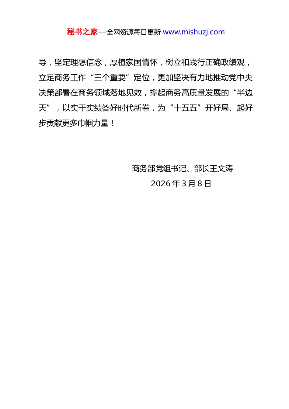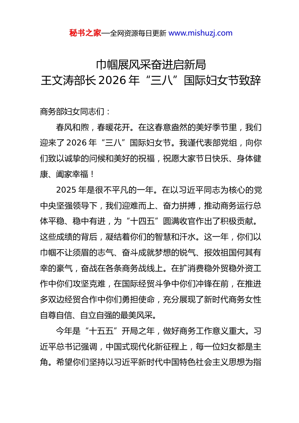 秘书之家—全网资源每日更新 www.mishuzj.com巾帼展风采奋进启新局王文涛部长 2026 年“三八”国际妇女节致辞商务部妇女同志们:春风和煦,春暖花开。在这春意盎然的美好季节里,我们迎来了 2026 年“三八”国际妇女节。我谨代表部党组,向你们致以诚挚的问候和美好的祝福,祝愿大家节日快乐、身体健康、阖家幸福!2025 年是很不平凡的一年。在以习近平同志为核心的党中央坚强领导下,我们迎难而上、奋力拼搏,推动商务运行总体平稳、稳中有进,为“十四五”圆满收官作出了积极贡献。这些成绩的背后,凝结着你们的智慧和汗水。这一年,你们以巾帼不让须眉的志气、奋斗成就梦想的锐气、报效祖国何其有幸的豪气,奋战在各条商务战线上。在扩消费稳外贸稳外资工作中你们攻坚克难,在国际经贸斗争中你们冲锋在前,在推进多双边经贸合作中你们勇担使命,充分展现了新时代商务女性自尊自信、自立自强的最美风采。今年是“十五五”开局之年,做好商务工作意义重大。习近平总书记强调,中国式现代化新征程上,每一位妇女都是主角。希望你们坚持以习近平新时代中国特色社会主义思想为指秘书之家—全网资源每日更新 www.mishuzj.com导,坚定理想信念,厚植家国情怀,树立和践行正确政绩观,立足商务工作“三个重要”定位,更加坚决有力地推动党中央决策部署在商务领域落地见效,撑起商务高质量发展的“半边天”,以实干实绩答好时代新卷,为“十五五”开好局、起好步贡献更多巾帼力量!商务部党组书记、部长王文涛2026 年 3 月 8 日