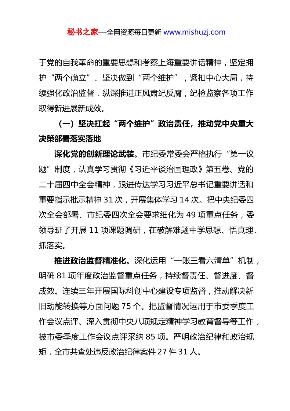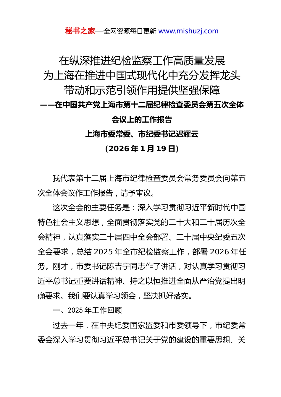 秘书之家—全网资源每日更新 www.mishuzj.com在纵深推进纪检监察工作高质量发展为上海在推进中国式现代化中充分发挥龙头带动和示范引领作用提供坚强保障——在中国共产党上海市第十二届纪律检查委员会第五次全体会议上的工作报告上海市委常委、市纪委书记迟耀云(2026 年 1 月 19 日)我代表第十二届上海市纪律检查委员会常务委员会向第五次全体会议作工作报告,请予审议。这次全会的主要任务是:深入学习贯彻习近平新时代中国特色社会主义思想,全面贯彻落实党的二十大和二十届历次全会精神,认真落实二十届四中全会部署、二十届中央纪委五次全会要求,总结 2025 年全市纪检监察工作,部署 2026 年任务。刚才,市委书记陈吉宁同志作了讲话,对认真学习贯彻习近平总书记重要讲话精神、持之以恒推进全面从严治党提出明确要求。我们要认真学习领会,坚决抓好落实。一、2025 年工作回顾过去一年,在中央纪委国家监委和市委领导下,市纪委常委会深入学习贯彻习近平总书记关于党的建设的重要思想、关秘书之家—全网资源每日更新 www.mishuzj.com于党的自我革命的重要思想和考察上海重要讲话精神,坚定拥护“两个确立”、坚决做到“两个维护”,紧扣中心大局,持续强化政治监督,纵深推进正风肃纪反腐,纪检监察各项工作取得新进展新成效。(一)坚决扛起“两个维护”政治责任,推动党中央重大决策部署落实落地深化党的创新理论武装。市纪委常委会严格执行“第一议题”制度,认真学习贯彻《习近平谈治国理政》第五卷、党的二十届四中全会精神,跟进传达学习习近平总书记重要讲话和重要指示批示精神 31 次,开展集体学习 14 次。把中央纪委四次全会部署、市纪委四次全会要求细化为 49 项重点任务,委领导班子开展 11 项课题调研,在破解难题中学思想、悟真理、抓落实。推进政治监督精准化。深化运用“一账三看六清单”机制,明确 81 项年度政治监督重点任务,持续督责任、督进度、督成效。连续三年开展国际科创中心建设专项监督,推动解决新旧动能转换等方面问题 75 个。把监督情况运用于市委季度工作会议点评、深入贯彻中央八项规定精神学习教育督导等工作,被市委季度工作会议点评采纳 85 项。严明政治纪律和政治规矩,全市共查处违反政治纪律案件 27 件 31 人。秘书之家—全网资源每日更新 www.mishuzj.com全力配合中央巡视工作。成立市纪委配合中央巡视专项工作组,建立协调办理机制及工作台账,确保交办任务逐项落实。在中央巡视组指导下,对我市 18 家国家级开发区开展全覆盖专项巡视,发现问题 498 个,提出建议 116 条。中央第六巡视组反馈意见后,成立整改工作领导小组,围绕市纪委监委机关牵头的整改任务,形成整改工作方案、整改任务和整改台账。(二)抓紧抓实学习教育,持续加固中央八项规定堤坝一体推进学查改。市纪委常委会先后 11 次围绕习近平总书记关于加强党的作风建设的重要论述开展集中学习、交流研讨,对照中央明确的 2 张问题清单深入查摆问题,动真碰硬抓好整改整治。召开市纪委机关警示教育会、年轻干部专题警示教育会,教育引导干部常敲思想警钟、常紧纪律之弦、常存敬畏之心。立足职责强保障。协助市委召开全市警示教育会,改版升级市全面从严治党警示教育基地,全市 982 家单位 1.4 万余人次现场接受教育。全市通报违反中央八项规定精神典型问题562 起 657 人,编发我市违反中央八项规定精神问题典型案例,建立党的二十大以来全市违反中央八项规定精神案件数据库,配合做好宣讲辅导、指导督导,助力全市学习教育扎实推进。一严到底纠“四风”。持续开展“净风行动”,市区联动秘书之家—全网资源每日更新 www.mishuzj.com开展明察暗访,对顶风违纪的抓现行、抓典型、抓通报,以狠刹违规吃喝、又吃又拿歪风为重点,共查处享乐主义、奢靡之风问题 1078 起、处理 1676 人。紧盯不担当不作为、加重基层负担等问题,共查处形式主义、官僚主义问题 1182 起、处理 1987 人,会同市委专项工作机制办公室通报 5 批 14 起整治形式主义为基层减负典型案例。正风反腐相贯通。对党的二十大以来我市查处的风...