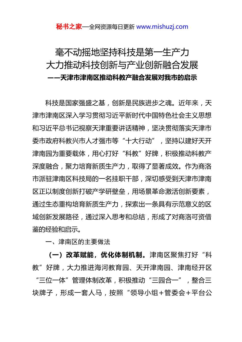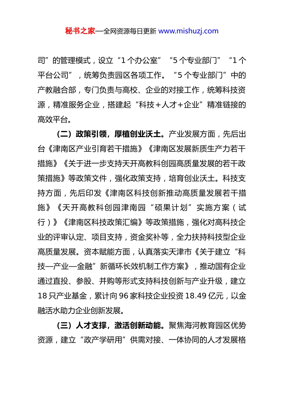 秘书之家—全网资源每日更新 www.mishuzj.com毫不动摇地坚持科技是第一生产力大力推动科技创新与产业创新融合发展——天津市津南区推动科教产融合发展对我市的启示科技是国家强盛之基,创新是民族进步之魂。近年来,天津市津南区深入学习贯彻习近平新时代中国特色社会主义思想和习近平总书记视察天津重要讲话精神,坚决贯彻落实天津市委市政府科教兴市人才强市等“十大行动”,坚持以建好天开津南园为重要载体,用心打好“科教”好牌,积极推动科教产深度融合,聚力培育新质生产力,取得了显著成效。作为商洛市派驻津南区科技局的一名挂职干部,深切感受到天津市津南区正以制度创新打破产学研壁垒,用场景革命激活创新要素,通过生态重构培育新质生产力,探索出一条具有示范意义的区域创新发展路径,通过深入思考和总结,形成了对商洛可资借鉴的经验和启示。一、津南区的主要做法(一)改革赋能,优化体制机制。津南区聚焦打好“科教”好牌,大力推进海河教育园、天开津南园、津南经开区“三位一体”管理体制改革,积极推动“三园合一”,整合三块牌子,形成一套人马,按照“领导小组+管委会+平台公秘书之家—全网资源每日更新 www.mishuzj.com司”的管理模式,设立“1 个办公室”“5 个专业部门”“1 个平台公司”,统筹负责园区各项工作。“5 个专业部门”中的产教融合部,专门负责与高校、企业的对接工作,统筹科技资源,精准服务企业,搭建起“科技+人才+企业”精准链接的高效平台。(二)政策引领,厚植创业沃土。产业发展方面,先后出台《津南区产业引育若干措施》《津南区发展新质生产力若干措施》《关于进一步支持天开高教科创园高质量发展的若干政策措施》等政策文件,强化政策支持,培育创业沃土。科技支持方面,先后印发《津南区科技创新推动高质量发展若干措施》《天开高教科创园津南园“硕果计划”实施方案(试行)》《津南区科技政策汇编》等政策措施,强化对高科技企业的评审认定、项目支持,资金奖补等,全力扶持科技型企业高质量发展。资本赋能方面,认真落实天津市《关于建立“科技—产业—金融”新循环长效机制工作方案》,推动国有企业通过直投、参股、并购等形式支持科技创新与产业升级,建立18 只产业基金,累计向 96 家科技企业投资 18.49 亿元,以金融活水助力企业创新发展。(三)人才支撑,激活创新动能。聚焦海河教育园区优势资源,建立“政产学研用”供需对接、一体协同的人才发展格秘书之家—全网资源每日更新 www.mishuzj.com局,充分激发区内 15 所高教高职院校、11 个全国重点实验室、30 余名“两院”院士、18 万余名在校师生的创新创造动能。实施人才强区战略、“海河英才”计划,出台《津南区关于加快引育新时代创新创业人才十条措施》,累计吸引近 3 万名人才落户津南。创设“鲁班工坊”“海河工匠”“人才定制班”校企联合培养等品牌项目,推动建设天开海归小镇,打造市级留创园、博士后科研工作站和创新实践基地 14 家,建设人才公寓 1500 余套,聚才育才、惜才留才的良好环境逐步形成。(四)平台驱动,营造科创生态。围绕天津大学、南开大学等高校,精心打造大学科技园,推动建设天开智慧小镇,着力培育“孵化器—加速器—产业园”立体化企业成长环境。建立“院校联络官”机制,依托领军企业开展“揭榜挂帅”、推动协同创新,在供需精准对接中按下科技创新“加速键”。成立智能制造产业协会、精密仪器仪表产教融合联合体,引导企业筹建重点实验室,整合概念验证、小试中试、检验检测等科研服务机构,组建“产业医院”,优化科创服务,形成了政、校、企共谋、共建、共享的良好科创生态。(五)质效并重,推动产业焕新。聚力落实京津冀协同发展战略,坚持“北京研发、天津转化”,加快出清落后产能,面向北京方向吸引优质资源落户津南。围绕优势领域,推动海秘书之家—全网资源每日更新 www.mishuzj.com河集成电路设备、智慧家电、精密仪器、工业控制设备 4 个产业主题园区提质增效,不断提升产业聚集度。聚焦新兴领域、前沿科技,以华海清科、光启技术等为牵引,带动新材料、新一代信息技术、装备制造、生物医药...