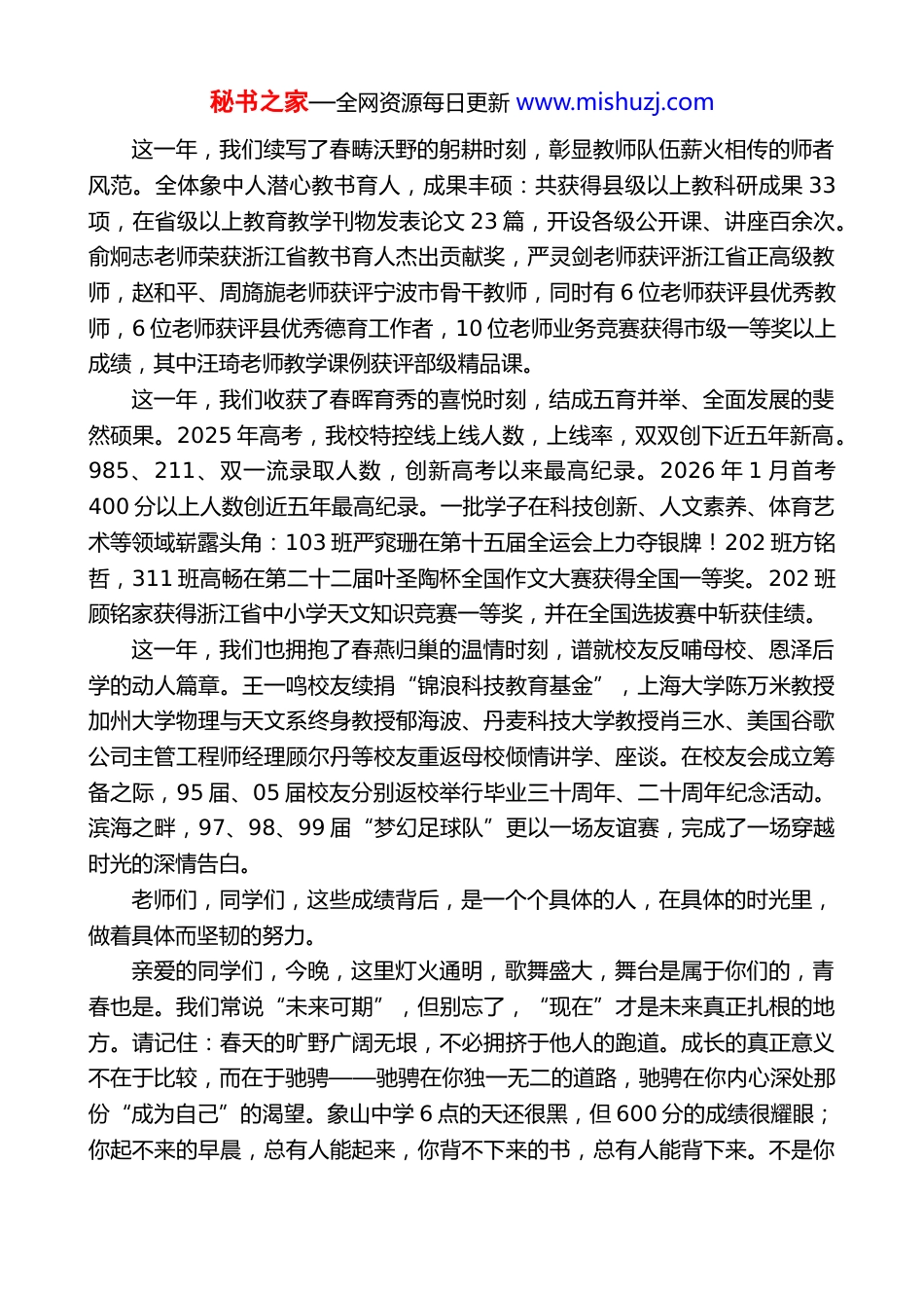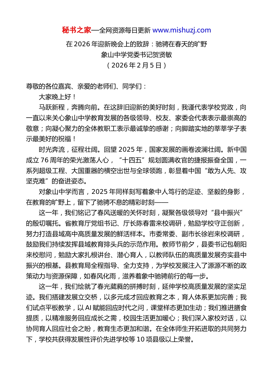 秘书之家—全网资源每日更新 www.mishuzj.com在 2026 年迎新晚会上的致辞:驰骋在春天的旷野象山中学党委书记贺贤敏(2026 年 2 月 5 日)尊敬的各位嘉宾、亲爱的老师们、同学们:大家晚上好!马跃新程,奔腾向前。在这辞旧迎新的美好时刻,我谨代表学校党政,向一直以来关心象山中学教育发展的各级领导、校友、家委会代表表示最崇高的敬意;向凝心聚力的全体教职工表示最诚挚的感谢;向脚踏实地的莘莘学子表示最美好的祝福!时光奔流,征程壮阔。回望 2025 年,国家发展的画卷波澜壮阔。新中国成立 76 周年的荣光激荡人心,“十四五”规划圆满收官的捷报振奋全国,一系列超级工程、大国重器的横空出世与全球领跑,彰显着中国“敢为人先、攻坚克难”的奋进姿态。对象山中学而言,2025 年同样刻写着象中人笃行的足迹、坚毅的身影,在教育的旷野上,留下了驰骋不息的精彩时刻——这一年,我们铭记了春风送暖的关怀时刻,凝聚各级领导对“县中振兴”的殷切嘱托。省教育厅党组书记、厅长陈春雷来校调研,勉励学校守正创新,努力打造县域高中高质量发展的鲜活样本。市委常委、副市长徐岩来校调研,鼓励我们持续发挥县域教育排头兵的示范作用。教师节前夕,县委书记包朝阳来校慰问,勉励大家扎根讲台、潜心育人,以教师队伍的高质量发展夯实县中振兴的根基。县教育局全程指导、全力支持,为学校发展注入了源源不断的政策动力与资源保障,如春风化雨,滋养着象中驰骋前行的每一步。这一年,我们绘就了春光葳蕤的拼搏时刻,延伸学校高质量发展的坚实足迹。我们搭建发展立交桥,以多元成才回应教育之本,育人体系更加完善;我们试点平板教学,以 AI 赋能回应时代之问,课堂样态更加生动;我们推进膳食提质,以精准服务回应成长之需,校园生活更加暖心;我们深入家校对话,以协同育人回应社会之盼,教育生态更加和谐。在全体师生开拓进取的共同努力下,学校共获得发展性评价先进学校等 10 项县级以上荣誉。秘书之家—全网资源每日更新 www.mishuzj.com这一年,我们续写了春畴沃野的躬耕时刻,彰显教师队伍薪火相传的师者风范。全体象中人潜心教书育人,成果丰硕:共获得县级以上教科研成果 33项,在省级以上教育教学刊物发表论文 23 篇,开设各级公开课、讲座百余次。俞炯志老师荣获浙江省教书育人杰出贡献奖,严灵剑老师获评浙江省正高级教师,赵和平、周旖旎老师获评宁波市骨干教师,同时有 6 位老师获评县优秀教师,6 位老师获评县优秀德育工作者,10 位老师业务竞赛获得市级一等奖以上成绩,其中汪琦老师教学课例获评部级精品课。这一年,我们收获了春晖育秀的喜悦时刻,结成五育并举、全面发展的斐然硕果。2025 年高考,我校特控线上线人数,上线率,双双创下近五年新高。985、211、双一流录取人数,创新高考以来最高纪录。2026 年 1 月首考400 分以上人数创近五年最高纪录。一批学子在科技创新、人文素养、体育艺术等领域崭露头角:103 班严窕珊在第十五届全运会上力夺银牌!202 班方铭哲,311 班高畅在第二十二届叶圣陶杯全国作文大赛获得全国一等奖。202 班顾铭家获得浙江省中小学天文知识竞赛一等奖,并在全国选拔赛中斩获佳绩。这一年,我们也拥抱了春燕归巢的温情时刻,谱就校友反哺母校、恩泽后学的动人篇章。王一鸣校友续捐“锦浪科技教育基金”,上海大学陈万米教授加州大学物理与天文系终身教授郁海波、丹麦科技大学教授肖三水、美国谷歌公司主管工程师经理顾尔丹等校友重返母校倾情讲学、座谈。在校友会成立筹备之际,95 届、05 届校友分别返校举行毕业三十周年、二十周年纪念活动。滨海之畔,97、98、99 届“梦幻足球队”更以一场友谊赛,完成了一场穿越时光的深情告白。老师们,同学们,这些成绩背后,是一个个具体的人,在具体的时光里,做着具体而坚韧的努力。亲爱的同学们,今晚,这里灯火通明,歌舞盛大,舞台是属于你们的,青春也是。我们常说“未来可期”,但别忘了,“现在”才是未来真正扎根的地方。请记住:春天的旷野广阔无垠,不必拥挤于他人的跑道。成长的真正意义不在于比较,而在于驰骋——驰骋在你独一无二的道路,驰...