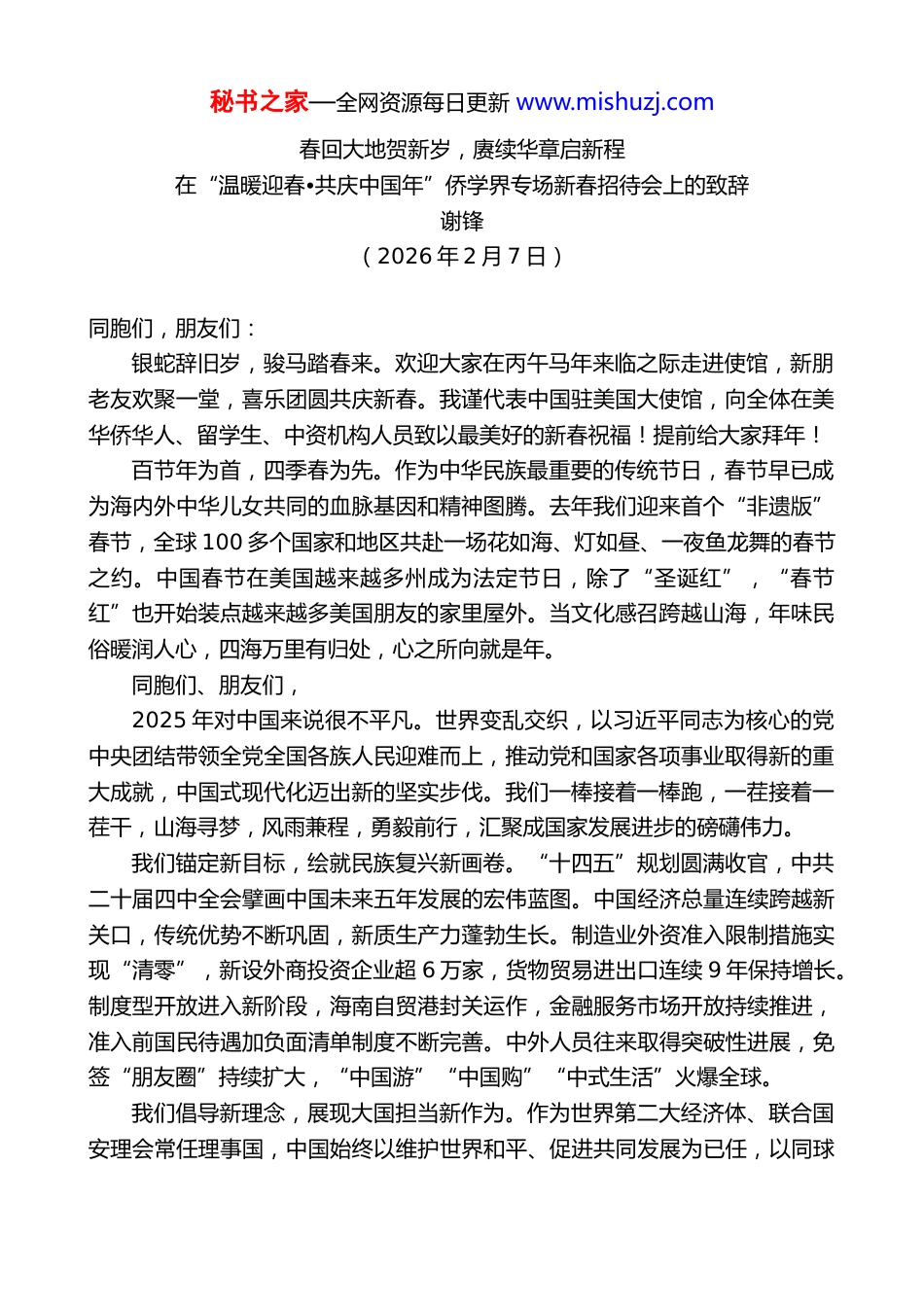 秘书之家—全网资源每日更新 www.mishuzj.com春回大地贺新岁,赓续华章启新程在“温暖迎春•共庆中国年”侨学界专场新春招待会上的致辞谢锋(2026 年 2 月 7 日)同胞们,朋友们:银蛇辞旧岁,骏马踏春来。欢迎大家在丙午马年来临之际走进使馆,新朋老友欢聚一堂,喜乐团圆共庆新春。我谨代表中国驻美国大使馆,向全体在美华侨华人、留学生、中资机构人员致以最美好的新春祝福!提前给大家拜年!百节年为首,四季春为先。作为中华民族最重要的传统节日,春节早已成为海内外中华儿女共同的血脉基因和精神图腾。去年我们迎来首个“非遗版”春节,全球 100 多个国家和地区共赴一场花如海、灯如昼、一夜鱼龙舞的春节之约。中国春节在美国越来越多州成为法定节日,除了“圣诞红”,“春节红”也开始装点越来越多美国朋友的家里屋外。当文化感召跨越山海,年味民俗暖润人心,四海万里有归处,心之所向就是年。同胞们、朋友们,2025 年对中国来说很不平凡。世界变乱交织,以习近平同志为核心的党中央团结带领全党全国各族人民迎难而上,推动党和国家各项事业取得新的重大成就,中国式现代化迈出新的坚实步伐。我们一棒接着一棒跑,一茬接着一茬干,山海寻梦,风雨兼程,勇毅前行,汇聚成国家发展进步的磅礴伟力。我们锚定新目标,绘就民族复兴新画卷。“十四五”规划圆满收官,中共二十届四中全会擘画中国未来五年发展的宏伟蓝图。中国经济总量连续跨越新关口,传统优势不断巩固,新质生产力蓬勃生长。制造业外资准入限制措施实现“清零”,新设外商投资企业超 6 万家,货物贸易进出口连续 9 年保持增长。制度型开放进入新阶段,海南自贸港封关运作,金融服务市场开放持续推进,准入前国民待遇加负面清单制度不断完善。中外人员往来取得突破性进展,免签“朋友圈”持续扩大,“中国游”“中国购”“中式生活”火爆全球。我们倡导新理念,展现大国担当新作为。作为世界第二大经济体、联合国安理会常任理事国,中国始终以维护世界和平、促进共同发展为已任,以同球秘书之家—全网资源每日更新 www.mishuzj.com共济超越地缘博弈,以合作共赢取代零和思维,积极推动构建人类命运共同体我们隆重纪念中国人民抗日战争暨世界反法西斯战争胜利 80 周年,庄严宣示中国维护国际和平与发展正义事业的坚定决心和强大实力。我们秉持客观公正立场,开展穿梭外交,积极劝和促谈,推动国际和地区热点的政治解决进程。我们同相关国家共同倡导成立国际调解院,为各国化解矛盾分歧提供中国智慧习近平主席郑重提出全球治理倡议,这一倡议与全球发展倡议、全球安全倡议全球文明倡议一道,着眼应对人类社会面临的和平赤字、发展赤字、安全赤字治理赤字,从不同角度为动荡不安的世界注入稳定性和确定性。我们直面新挑战,续写正确相处新篇章。在中美元首战略引领下,中美关系经历波折实现企稳。面对关税战、贸易战,我们坚定捍卫自身利益,坚决维护以世贸组织为核心的多边贸易体制。中美经贸团队举行 5 轮磋商,就两国经贸关系达成一系列积极共识。台湾问题是中国核心利益中的核心,是中美关系第一条不可逾越的红线。中方将继续采取措施坚定捍卫国家主权和领土完整,坚决反对反制“台独”分裂行径和外部势力干预。事实再次证明,中美合则两利、斗则俱伤,对话和合作是唯一正确选择。中美应该相互尊重、和平共处、合作共赢。我们展现新风貌,汇聚同心筑梦新力量。使馆各项工作的开展,离不开广大侨胞的大力支持。各位侨胞远离祖(籍)国,在异乡打拼奋斗,驰骋五洲,心系故土,以实干书写担当,以热忱连接中外。你们坚定支持祖(籍)国现代化建设,举办纪念中国人民抗日战争暨世界反法西斯战争胜利 80 周年音乐会,参加纪念台湾光复 80 周年座谈会,坚决反对“台独”分裂图谋,支持中国和平统一大业。大家以坚定、坚韧、坚守直面困难与挑战,积极筹办参与“华盛顿中国文化节”“中国城里品中国”等活动,热情传播中华优秀传统文化,搭建中美人文交流桥梁纽带。前不久“韧”字当选 2025 年中国年度汉字,今天我要把这个字送给大家,不仅是向大家致以由衷的敬意,也真切希望大家将“韧”的精...