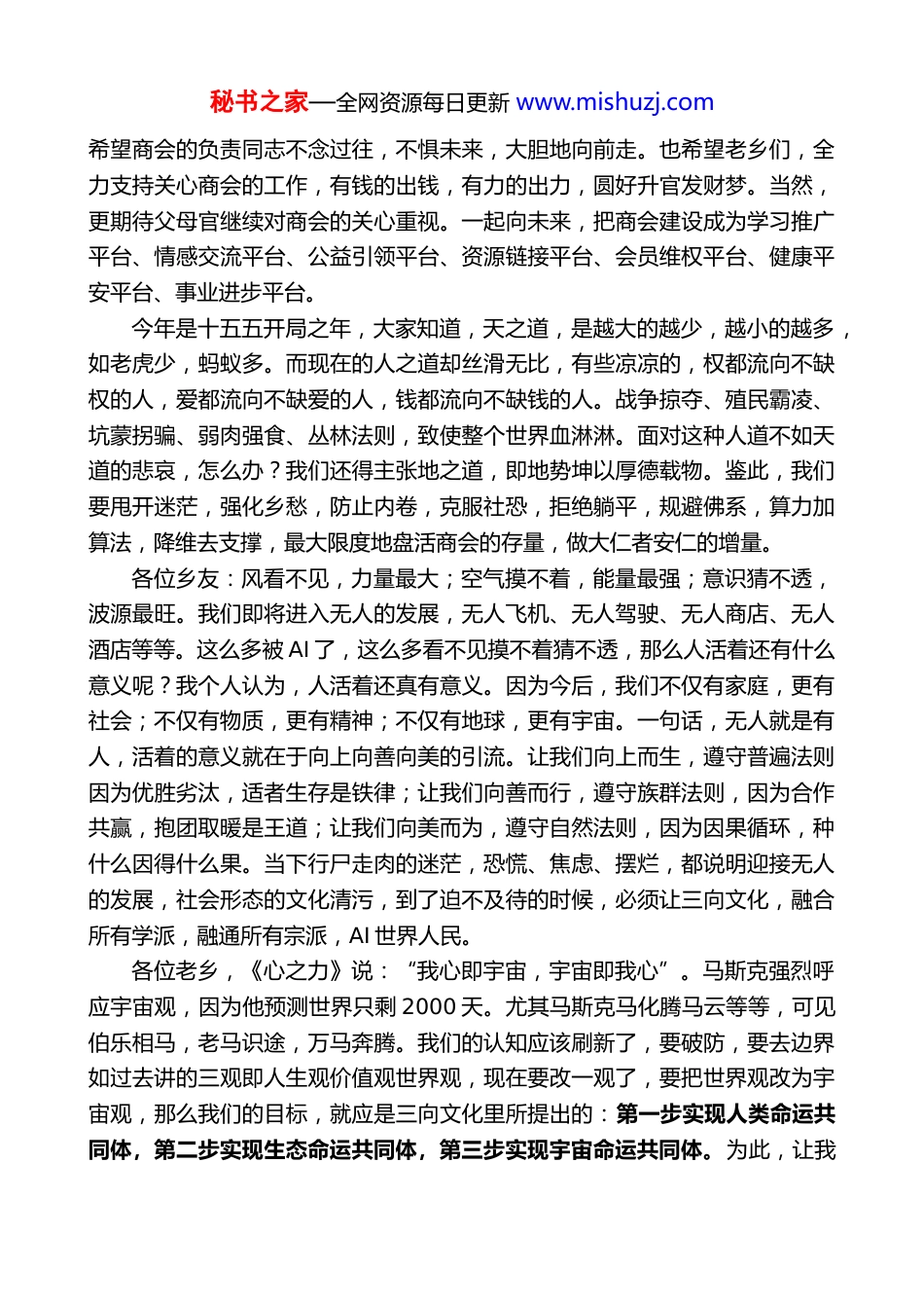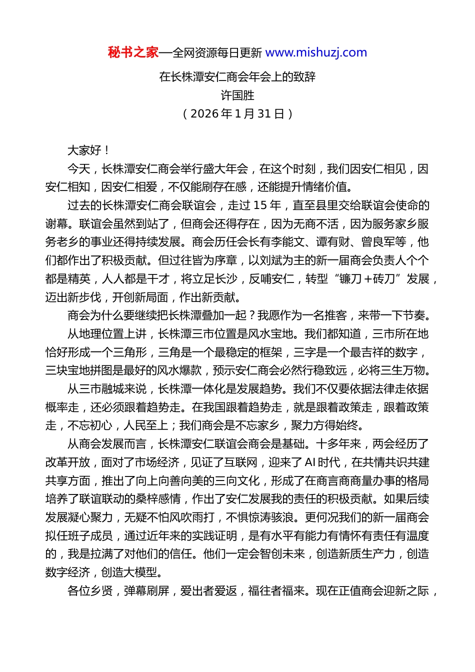 秘书之家—全网资源每日更新 www.mishuzj.com在长株潭安仁商会年会上的致辞许国胜(2026 年 1 月 31 日)大家好!今天,长株潭安仁商会举行盛大年会,在这个时刻,我们因安仁相见,因安仁相知,因安仁相爱,不仅能刷存在感,还能提升情绪价值。过去的长株潭安仁商会联谊会,走过 15 年,直至县里交给联谊会使命的谢幕。联谊会虽然到站了,但商会还得存在,因为无商不活,因为服务家乡服务老乡的事业还得持续发展。商会历任会长有李能文、谭有财、曾良军等,他们都作出了积极贡献。但过往皆为序章,以刘斌为主的新一届商会负责人个个都是精英,人人都是干才,将立足长沙,反哺安仁,转型“镰刀+砖刀”发展,迈出新步伐,开创新局面,作出新贡献。商会为什么要继续把长株潭叠加一起?我愿作为一名推客,来带一下节奏。从地理位置上讲,长株潭三市位置是风水宝地。我们都知道,三市所在地恰好形成一个三角形,三角是一个最稳定的框架,三字是一个最吉祥的数字,三块宝地拼图是最好的风水爆款,预示安仁商会必然行稳致远,必将三生万物。从三市融城来说,长株潭一体化是发展趋势。我们不仅要依据法律走依据概率走,还必须跟着趋势走。在我国跟着趋势走,就是跟着政策走,跟着政策走,不忘初心,人民至上;我们商会是不忘家乡,聚力方得始终。从商会发展而言,长株潭安仁联谊会商会是基础。十多年来,两会经历了改革开放,面对了市场经济,见证了互联网,迎来了 AI 时代,在共情共识共建共享方面,推出了向上向善向美的三向文化,形成了在商言商商量办事的格局培养了联谊联动的桑梓感情,作出了安仁发展我的责任的积极贡献。如果后续发展凝心聚力,无疑不怕风吹雨打,不惧惊涛骇浪。更何况我们的新一届商会拟任班子成员,通过近年来的实践证明,是有水平有能力有情怀有责任有温度的,我是拉满了对他们的信任。他们一定会智创未来,创造新质生产力,创造数字经济,创造大模型。各位乡贤,弹幕刷屏,爱出者爱返,福往者福来。现在正值商会迎新之际,秘书之家—全网资源每日更新 www.mishuzj.com希望商会的负责同志不念过往,不惧未来,大胆地向前走。也希望老乡们,全力支持关心商会的工作,有钱的出钱,有力的出力,圆好升官发财梦。当然,更期待父母官继续对商会的关心重视。一起向未来,把商会建设成为学习推广平台、情感交流平台、公益引领平台、资源链接平台、会员维权平台、健康平安平台、事业进步平台。今年是十五五开局之年,大家知道,天之道,是越大的越少,越小的越多,如老虎少,蚂蚁多。而现在的人之道却丝滑无比,有些凉凉的,权都流向不缺权的人,爱都流向不缺爱的人,钱都流向不缺钱的人。战争掠夺、殖民霸凌、坑蒙拐骗、弱肉强食、丛林法则,致使整个世界血淋淋。面对这种人道不如天道的悲哀,怎么办?我们还得主张地之道,即地势坤以厚德载物。鉴此,我们要甩开迷茫,强化乡愁,防止内卷,克服社恐,拒绝躺平,规避佛系,算力加算法,降维去支撑,最大限度地盘活商会的存量,做大仁者安仁的增量。各位乡友:风看不见,力量最大;空气摸不着,能量最强;意识猜不透,波源最旺。我们即将进入无人的发展,无人飞机、无人驾驶、无人商店、无人酒店等等。这么多被 AI 了,这么多看不见摸不着猜不透,那么人活着还有什么意义呢?我个人认为,人活着还真有意义。因为今后,我们不仅有家庭,更有社会;不仅有物质,更有精神;不仅有地球,更有宇宙。一句话,无人就是有人,活着的意义就在于向上向善向美的引流。让我们向上而生,遵守普遍法则因为优胜劣汰,适者生存是铁律;让我们向善而行,遵守族群法则,因为合作共赢,抱团取暖是王道;让我们向美而为,遵守自然法则,因为因果循环,种什么因得什么果。当下行尸走肉的迷茫,恐慌、焦虑、摆烂,都说明迎接无人的发展,社会形态的文化清污,到了迫不及待的时候,必须让三向文化,融合所有学派,融通所有宗派,AI 世界人民。各位老乡,《心之力》说:“我心即宇宙,宇宙即我心”。马斯克强烈呼应宇宙观,因为他预测世界只剩 2000 天。尤其马斯克马化腾马云等等,可见伯乐相马,老马识途,万马奔腾。我们的认知应...