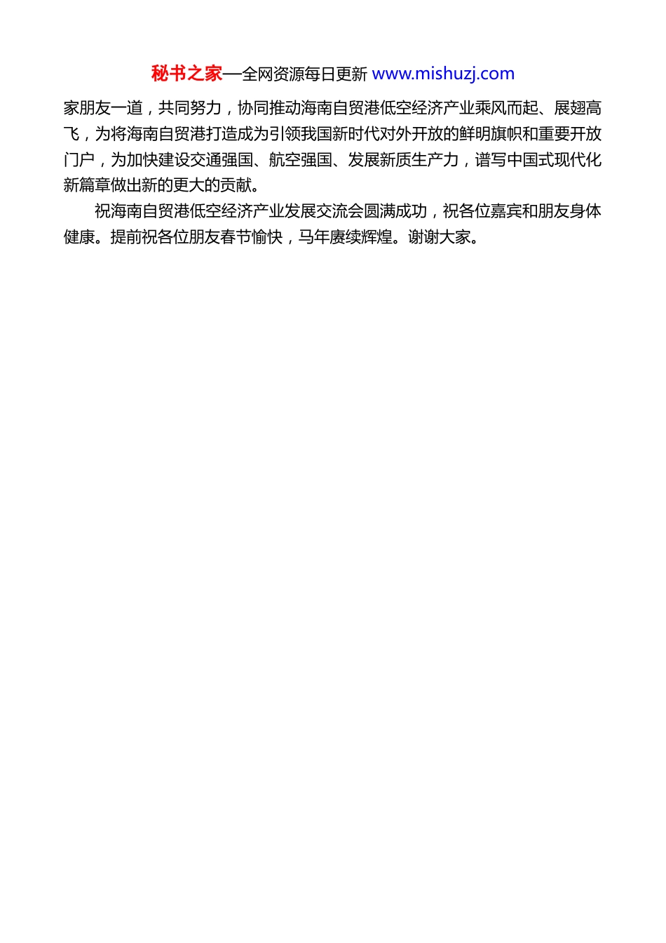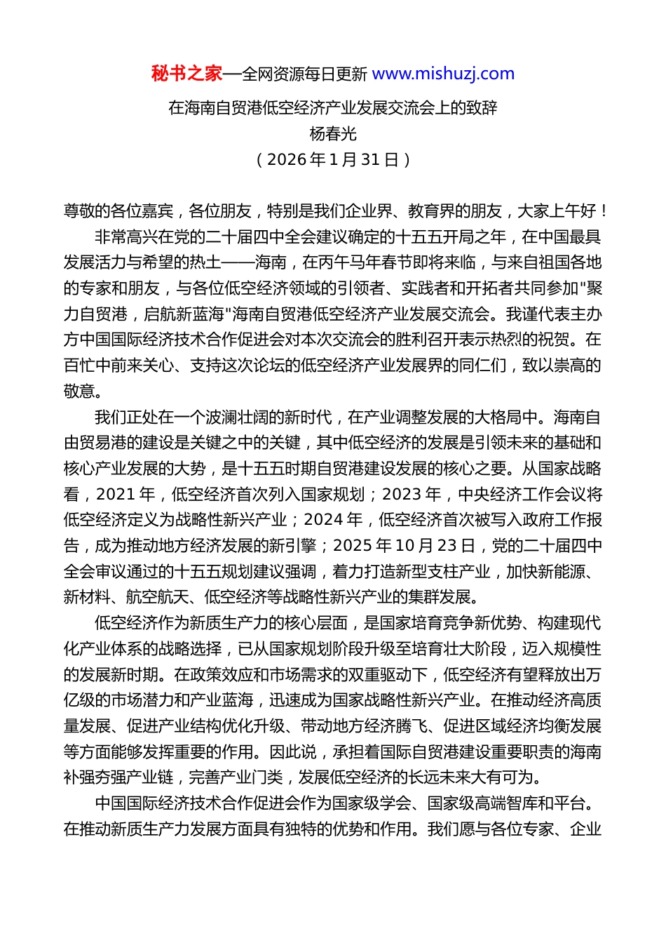秘书之家—全网资源每日更新 www.mishuzj.com在海南自贸港低空经济产业发展交流会上的致辞杨春光(2026 年 1 月 31 日)尊敬的各位嘉宾,各位朋友,特别是我们企业界、教育界的朋友,大家上午好!非常高兴在党的二十届四中全会建议确定的十五五开局之年,在中国最具发展活力与希望的热土——海南,在丙午马年春节即将来临,与来自祖国各地的专家和朋友,与各位低空经济领域的引领者、实践者和开拓者共同参加"聚力自贸港,启航新蓝海"海南自贸港低空经济产业发展交流会。我谨代表主办方中国国际经济技术合作促进会对本次交流会的胜利召开表示热烈的祝贺。在百忙中前来关心、支持这次论坛的低空经济产业发展界的同仁们,致以崇高的敬意。我们正处在一个波澜壮阔的新时代,在产业调整发展的大格局中。海南自由贸易港的建设是关键之中的关键,其中低空经济的发展是引领未来的基础和核心产业发展的大势,是十五五时期自贸港建设发展的核心之要。从国家战略看,2021 年,低空经济首次列入国家规划;2023 年,中央经济工作会议将低空经济定义为战略性新兴产业;2024 年,低空经济首次被写入政府工作报告,成为推动地方经济发展的新引擎;2025 年 10 月 23 日,党的二十届四中全会审议通过的十五五规划建议强调,着力打造新型支柱产业,加快新能源、新材料、航空航天、低空经济等战略性新兴产业的集群发展。低空经济作为新质生产力的核心层面,是国家培育竞争新优势、构建现代化产业体系的战略选择,已从国家规划阶段升级至培育壮大阶段,迈入规模性的发展新时期。在政策效应和市场需求的双重驱动下,低空经济有望释放出万亿级的市场潜力和产业蓝海,迅速成为国家战略性新兴产业。在推动经济高质量发展、促进产业结构优化升级、带动地方经济腾飞、促进区域经济均衡发展等方面能够发挥重要的作用。因此说,承担着国际自贸港建设重要职责的海南补强夯强产业链,完善产业门类,发展低空经济的长远未来大有可为。中国国际经济技术合作促进会作为国家级学会、国家级高端智库和平台。在推动新质生产力发展方面具有独特的优势和作用。我们愿与各位专家、企业秘书之家—全网资源每日更新 www.mishuzj.com家朋友一道,共同努力,协同推动海南自贸港低空经济产业乘风而起、展翅高飞,为将海南自贸港打造成为引领我国新时代对外开放的鲜明旗帜和重要开放门户,为加快建设交通强国、航空强国、发展新质生产力,谱写中国式现代化新篇章做出新的更大的贡献。祝海南自贸港低空经济产业发展交流会圆满成功,祝各位嘉宾和朋友身体健康。提前祝各位朋友春节愉快,马年赓续辉煌。谢谢大家。
