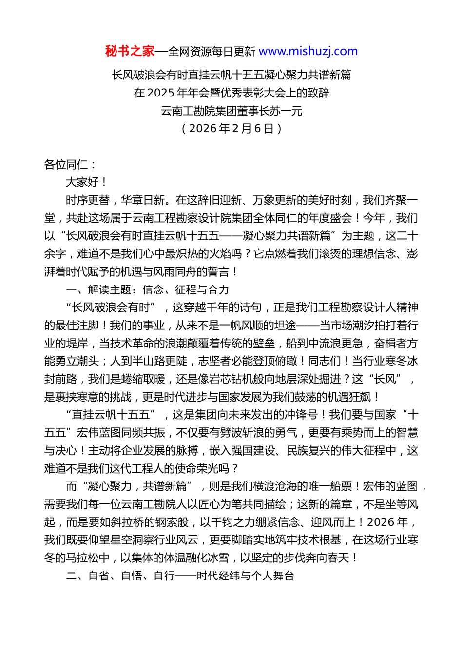 秘书之家—全网资源每日更新 www.mishuzj.com长风破浪会有时直挂云帆十五五凝心聚力共谱新篇在 2025 年年会暨优秀表彰大会上的致辞云南工勘院集团董事长苏一元(2026 年 2 月 6 日)各位同仁:大家好!时序更替,华章日新。在这辞旧迎新、万象更新的美好时刻,我们齐聚一堂,共赴这场属于云南工程勘察设计院集团全体同仁的年度盛会!今年,我们以“长风破浪会有时直挂云帆十五五——凝心聚力共谱新篇”为主题,这二十余字,难道不是我们心中最炽热的火焰吗?它点燃着我们滚烫的理想信念、澎湃着时代赋予的机遇与风雨同舟的誓言!一、解读主题:信念、征程与合力“长风破浪会有时”,这穿越千年的诗句,正是我们工程勘察设计人精神的最佳注脚!我们的事业,从来不是一帆风顺的坦途——当市场潮汐拍打着行业的堤岸,当技术革命的浪潮颠覆着传统的壁垒,船到中流浪更急,奋楫者方能勇立潮头;人到半山路更陡,志坚者必能登顶俯瞰!同志们!当行业寒冬冰封前路,我们是蜷缩取暖,还是像岩芯钻机般向地层深处掘进?这“长风”,是裹挟寒意的挑战,更是时代进步与国家发展为我们鼓荡的机遇狂飙!“直挂云帆十五五”,这是集团向未来发出的冲锋号!我们要与国家“十五五”宏伟蓝图同频共振,不仅要有劈波斩浪的勇气,更要有乘势而上的智慧与决心!主动将企业发展的脉搏,嵌入强国建设、民族复兴的伟大征程中,这难道不是我们这代工程人的使命荣光吗?而“凝心聚力,共谱新篇”,则是我们横渡沧海的唯一船票!宏伟的蓝图,需要我们每一位云南工勘院人以匠心为笔共同描绘;这新的篇章,不是坐等风起,而是要如斜拉桥的钢索般,以千钧之力绷紧信念、迎风而上!2026 年,我们既要仰望星空洞察行业风云,更要脚踏实地筑牢技术根基,在这场行业寒冬的马拉松中,以集体的体温融化冰雪,以坚定的步伐奔向春天!二、自省、自悟、自行——时代经纬与个人舞台秘书之家—全网资源每日更新 www.mishuzj.com同仁们,我们正站在变革的悬崖边!当 BIM 技术像海啸般吞噬传统设计流程,当绿色建筑标准如利剑般重构行业规则,当 AI 绘图工具开始替代人工出图——你是否在深夜加班时猛然惊醒:我的核心竞争力还能支撑到明天吗?但我要说,这恰恰是我们自我革新、自我超越、自我重生的涅槃之机!烦恼即菩提,危机即转机!行业的每一次震荡,技术的每一次迭代,市场的每一次洗牌,看似是深渊,实则是我们破茧成蝶的跳板!爱因斯坦曾说:“危机中蕴藏着尚未被发现的机遇。”它迫使我们停下惯性的脚步,重新审视我们的核心价值究竟是什么?我们过去的经验哪些是财富,哪些已成为枷锁?我们个人在技术浪潮中,是随波逐流的浮萍,还是中流砥柱的礁石?这个时代,给了我们从“别赶路”到“感受路”的觉醒时刻!过去,我们或许更关注项目数量、合同额的增长速度;现在,我们更需要思考:如何让每一份设计都成为精品?如何让每一次服务都超越期待?这不是减速,而是为了在正确的赛道上加速!这就是勘察设计的真谛——正如勘察工作,不能只追求钻孔的米数,更要读懂每一层岩土诉说的大地密码;设计工作,不能只满足于规范的符合,更要追求空间与人文、环境与未来的和谐共鸣。这正是“找到自己频率”的黄金时代!国家的战略蓝图——“美丽中国”呼唤绿色技术的突破,“数字中国”驱动智能设计的革命,“高质量发展”苛求工程品质的极致——它们如同三重奏的指挥棒,为我们每个人校准生命的节拍、奏响事业的强音!在这场时代交响乐中,我们是甘当沉默的观众,还是成为领奏的首席?我们能否让自己的专业之声,成为不可替代的独特旋律?自悟,是为了更坚定的自行!看清时代的经纬,明了企业的航向,最终要熔铸在我们每个人的掌心!企业的高质量发展,不是挂在墙上的标语,而是由你我的每一份图纸精度、每一次现场坚守、每一个创新方案共同浇筑的钢铁长城!当客户说“云南工勘院的方案就是让人放心”,这份沉甸甸的信任,难道不是比任何奖杯都闪耀的勋章吗?这个时代不再仅仅奖励“快”,它更慷慨地加冕“专”的深度、“精”的极致、“特”的锋芒、“新”的突破!深耕你的专业领域,淬炼成为刺穿复杂岩土难题的...