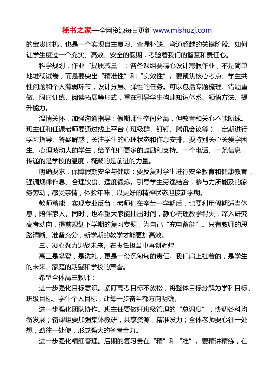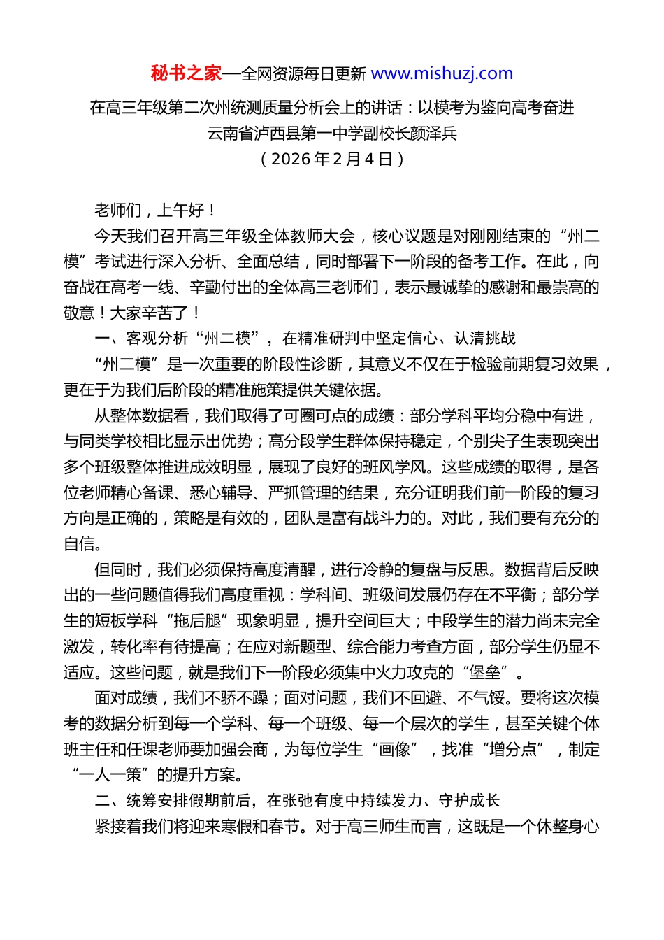 秘书之家—全网资源每日更新 www.mishuzj.com在高三年级第二次州统测质量分析会上的讲话:以模考为鉴向高考奋进云南省泸西县第一中学副校长颜泽兵(2026 年 2 月 4 日)老师们,上午好!今天我们召开高三年级全体教师大会,核心议题是对刚刚结束的“州二模”考试进行深入分析、全面总结,同时部署下一阶段的备考工作。在此,向奋战在高考一线、辛勤付出的全体高三老师们,表示最诚挚的感谢和最崇高的敬意!大家辛苦了!一、客观分析“州二模”,在精准研判中坚定信心、认清挑战“州二模”是一次重要的阶段性诊断,其意义不仅在于检验前期复习效果 ,更在于为我们后阶段的精准施策提供关键依据。从整体数据看,我们取得了可圈可点的成绩:部分学科平均分稳中有进,与同类学校相比显示出优势;高分段学生群体保持稳定,个别尖子生表现突出多个班级整体推进成效明显,展现了良好的班风学风。这些成绩的取得,是各位老师精心备课、悉心辅导、严抓管理的结果,充分证明我们前一阶段的复习方向是正确的,策略是有效的,团队是富有战斗力的。对此,我们要有充分的自信。但同时,我们必须保持高度清醒,进行冷静的复盘与反思。数据背后反映出的一些问题值得我们高度重视:学科间、班级间发展仍存在不平衡;部分学生的短板学科“拖后腿”现象明显,提升空间巨大;中段学生的潜力尚未完全激发,转化率有待提高;在应对新题型、综合能力考查方面,部分学生仍显不适应。这些问题,就是我们下一阶段必须集中火力攻克的“堡垒”。面对成绩,我们不骄不躁;面对问题,我们不回避、不气馁。要将这次模考的数据分析到每一个学科、每一个班级、每一个层次的学生,甚至关键个体班主任和任课老师要加强会商,为每位学生“画像”,找准“增分点”,制定“一人一策”的提升方案。二、统筹安排假期前后,在张弛有度中持续发力、守护成长紧接着我们将迎来寒假和春节。对于高三师生而言,这既是一个休整身心秘书之家—全网资源每日更新 www.mishuzj.com的宝贵时机,也是一个实现自主复习、查漏补缺、弯道超越的关键阶段。如何让学生度过一个充实、高效、安全的假期,考验着我们的智慧和责任心。科学规划,作业“提质减量”:各备课组要精心设计寒假作业,不是简单地堆砌试卷,而是要突出“精准性”和“实效性”。要聚焦核心考点、学生共性问题和个人薄弱环节,设计分层、弹性的任务。可以包括专题梳理、错题重做、限时训练、阅读拓展等形式,重在引导学生构建知识体系、领悟方法、提升能力。温情关怀,加强沟通指导:假期师生空间分离,但教育和关心不能断线。班主任和任课老师要通过线上平台(班级群、钉钉、腾讯会议等),定期进行学习指导、答疑解惑,关注学生的心理状态和作息安排。要特别关心关爱学困生、心理波动大的学生,给予他们更多的鼓励和支持。一个电话、一条信息,传递的是学校的温度,凝聚的是前进的力量。明确要求,保障假期安全与健康:要反复对学生进行安全教育和健康教育,强调规律作息、合理饮食、适度锻炼。引导学生劳逸结合,参与力所能及的家务劳动,感受亲情,体验年味,以更好的精神状态迎接新学期。教师蓄能,实现专业反刍:老师们在辛苦一学期后,也要利用假期适当休息,陪伴家人。同时,也希望大家能抽出时间,静心梳理教学得失,深入研究高考动向,提前规划下学期的复习专题,为自己“充电蓄能”。只有教师的思路清晰、准备充分,新学期的教学才能更加高效。三、凝心聚力迎战未来,在责任担当中再创辉煌高三是攀登,是洗礼,更是一份沉甸甸的责任。我们肩上扛着的,是学生的未来、家庭的期望和学校的声誉。希望全体高三教师:进一步强化目标意识。紧盯高考目标不放松,将整体目标分解为学科目标、班级目标、学生个人目标,让每一步奋斗都方向明确。进一步强化团队协作。班主任要做好班级管理的“总调度”,协调各科均衡发展;备课组要加强集体教研,共享资源,精准发力;全体老师要心往一处想,劲往一处使,形成强大的备考合力。进一步强化精细管理。后期的复习贵在“精”和“准”。要精讲精练,在秘书之家—全网资源每日更新 www.mishuzj.com提升课堂效率上下功夫;...