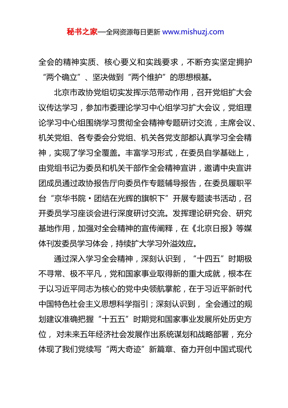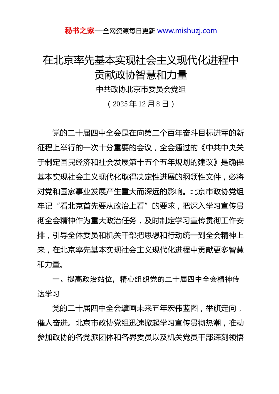 秘书之家—全网资源每日更新 www.mishuzj.com在北京率先基本实现社会主义现代化进程中贡献政协智慧和力量中共政协北京市委员会党组(2025 年 12 月 8 日)党的二十届四中全会是在向第二个百年奋斗目标进军的新征程上举行的一次十分重要的会议,全会通过的《中共中央关于制定国民经济和社会发展第十五个五年规划的建议》是确保基本实现社会主义现代化取得决定性进展的纲领性文件,必将对党和国家事业发展产生重大而深远的影响。北京市政协党组牢记“看北京首先要从政治上看”的要求,把深入学习宣传贯彻全会精神作为重大政治任务,及时制定学习宣传贯彻工作安排,引导全体委员和机关干部把思想和行动统一到全会精神上来,在北京率先基本实现社会主义现代化进程中贡献更多智慧和力量。一、提高政治站位,精心组织党的二十届四中全会精神传达学习党的二十届四中全会擘画未来五年宏伟蓝图,举旗定向,催人奋进。北京市政协党组迅速掀起学习宣传贯彻热潮,推动参加政协的各党派团体和各界委员以及机关党员干部深刻领悟秘书之家—全网资源每日更新 www.mishuzj.com全会的精神实质、核心要义和实践要求,不断夯实坚定拥护“两个确立”、坚决做到“两个维护”的思想根基。北京市政协党组切实发挥示范带动作用,召开党组扩大会议传达学习,参加市委理论学习中心组学习扩大会议,党组理论学习中心组围绕学习贯彻全会精神专题研讨交流,主席会议、机关党组、各专委会分党组、机关各党支部都认真学习全会精神,实现了学习全覆盖。丰富学习形式,在委员自学基础上,由党组书记为委员和机关干部作全会精神宣讲,邀请中央宣讲团成员通过政协报告厅向委员作专题辅导报告,在委员履职平台“京华书院·团结在光辉的旗帜下”开展专题读书活动,召开委员学习座谈会进行深度研讨交流。发挥理论研究会、研究基地作用,加强对全会精神的宣传阐释,在《北京日报》等媒体刊发委员学习体会,持续扩大学习外溢效应。通过深入学习全会精神,深刻认识到,“十四五”时期极不寻常、极不平凡,党和国家事业取得新的重大成就,根本在于以习近平同志为核心的党中央领航掌舵,在于习近平新时代中国特色社会主义思想科学指引;深刻认识到, 全会通过的规划建议准确把握“十五五”时期党和国家事业发展所处历史方位, 对未来五年经济社会发展作出系统谋划和战略部署,充分体现了我们党续写“两大奇迹”新篇章、奋力开创中国式现代秘书之家—全网资源每日更新 www.mishuzj.com化建设新局面的历史主动;深刻认识到, “十五五”时期是夯实基础、全面发力的关键阶段,虽然面临复杂严峻的形势, 但我国发展的战略机遇和独特优势更加凸显,只要我们保持战略定力,增强必胜信心,集中力量办好自己的事,就一定能继续把中国式现代化的宏伟事业推向前进。二、立足工作实际,抓好党的二十届四中全会精神贯彻落实人民政协作为国家治理体系重要组成部分,必须围绕中心服务大局,切实增强贯彻落实党的二十届四中全会精神的政治自觉、思想自觉和行动自觉。北京市政协党组在传达学习全会精神基础上,及时对标对表,找准履职方向和重点,把学习成果转化为干事创业、履职尽责、推动高质量发展的实际成效。积极建言北京市“十五五”规划编制。北京作为首都,各方面工作具有代表性、指向性,在社会主义现代化建设大局中承担着重要使命和责任。编制好北京市“十五五”规划意义重大。北京市政协党组把助力“十五五”规划编制作为履职重点,立足城市战略定位,聚焦首都发展的战略性、关键性问题深入研究,依托委员工作室广泛征求各方面意见建议,通过提案、社情民意信息等形式及时提出意见建议,选派委员参与规划建议文本征求意见工作,推动各方智慧融入首都发展蓝图,为科秘书之家—全网资源每日更新 www.mishuzj.com学编制规划贡献政协智慧。紧扣首都现代化建设中的重大问题协商议政。认真组织实施年度协商监督计划,围绕国际绿色经济标杆城市建设、提升文体产品供给水平、发展都市型现代农业等议题深入调查研究、积极议政建言,聚焦“十五五”时期发展提出前瞻性、针对性意见建议,为党政决策提供有益参考。围绕生活垃圾分类...