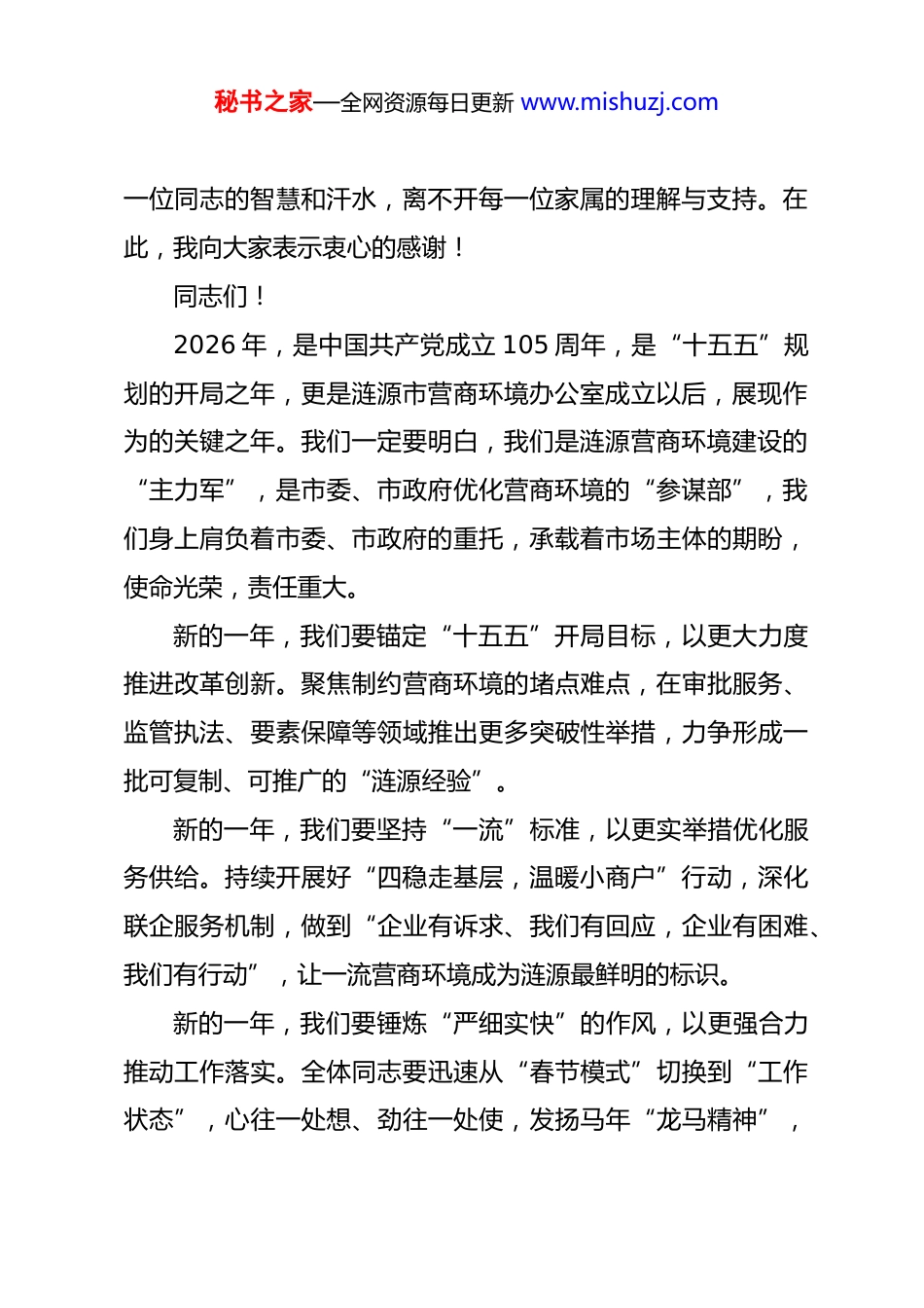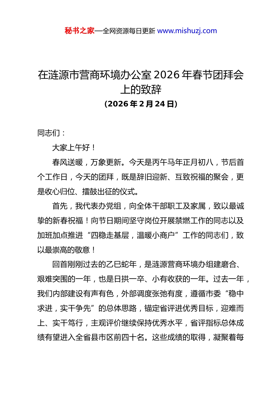 秘书之家—全网资源每日更新 www.mishuzj.com在涟源市营商环境办公室 2026 年春节团拜会上的致辞(2026 年 2 月 24 日)同志们:大家上午好!春风送暖,万象更新。今天是丙午马年正月初八,节后首个工作日,今天的团拜,既是辞旧迎新、互致祝福的聚会,更是收心归位、擂鼓出征的仪式。首先,我代表办党组,向全体干部职工及家属,致以最诚挚的新春祝福!向节日期间坚守岗位开展禁燃工作的同志以及加班加点推进“四稳走基层,温暖小商户”工作的同志们,致以最崇高的敬意!回首刚刚过去的乙巳蛇年,是涟源营商环境办组建磨合、艰难突围的一年,也是日拱一卒、小有收获的一年。过去一年,我们内部建设有声有色,外部调度张弛有度,遵循市委“稳中求进,实干争先”的总体思路,锚定省评进优秀目标,迎难而上、实干笃行,主观评价继续保持优秀水平,省评指标总体成绩有望进入全省县市区前四十名。这些成绩的取得,凝聚着每秘书之家—全网资源每日更新 www.mishuzj.com一位同志的智慧和汗水,离不开每一位家属的理解与支持。在此,我向大家表示衷心的感谢!同志们!2026 年,是中国共产党成立 105 周年,是“十五五”规划的开局之年,更是涟源市营商环境办公室成立以后,展现作为的关键之年。我们一定要明白,我们是涟源营商环境建设的“主力军”,是市委、市政府优化营商环境的“参谋部”,我们身上肩负着市委、市政府的重托,承载着市场主体的期盼,使命光荣,责任重大。新的一年,我们要锚定“十五五”开局目标,以更大力度推进改革创新。聚焦制约营商环境的堵点难点,在审批服务、监管执法、要素保障等领域推出更多突破性举措,力争形成一批可复制、可推广的“涟源经验”。新的一年,我们要坚持“一流”标准,以更实举措优化服务供给。持续开展好“四稳走基层,温暖小商户”行动,深化联企服务机制,做到“企业有诉求、我们有回应,企业有困难、我们有行动”,让一流营商环境成为涟源最鲜明的标识。新的一年,我们要锤炼“严细实快”的作风,以更强合力推动工作落实。全体同志要迅速从“春节模式”切换到“工作状态”,心往一处想、劲往一处使,发扬马年“龙马精神”,秘书之家—全网资源每日更新 www.mishuzj.com以开局就是决战、起步就是冲刺的劲头,不折不扣落实好各项工作任务,努力创造经得起实践、人民和历史检验的实绩。同志们!骏马追风扬气魄,寒梅傲雪见精神。马,象征着刚健、奋进、跨越。让我们更加紧密地团结在一起,在市委、市政府的坚强领导下,策马扬鞭、奋勇争先,以一流的营商环境助推涟源高质量发展,共同开创涟源市营商环境办公室更加美好的明天!最后,祝愿大家在新的一年里,身体健康、工作顺利、阖家幸福、马到成功!谢谢大家!