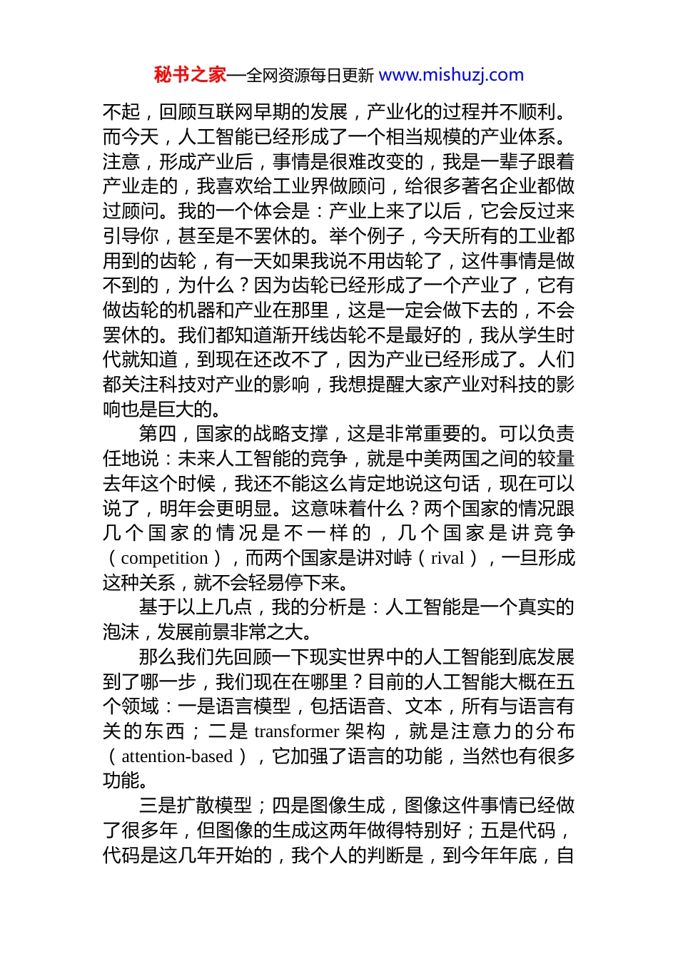 秘书之家—全网资源每日更新 www.mishuzj.com在深圳创投 25 周年大会上的主旨演讲:人工智能:突破口在哪里?各位朋友早上好,今天非常高兴受邀到这里做演讲,首先祝贺深圳创投 25 周年,深圳创投对深圳的发展与创新立下了汗马功劳,了不起!我们大家都感谢深圳创投做出的巨大贡献。我从事人工智能机器人方面的研究大概 40 年,今天想跟大家分享一下这方面的思考,求教于诸位。人工智能发展到今天,无论是大语言模型、机器视觉,自动驾驶汽车似乎基本上都到了一个顶端,那么,下一个突破口到底在哪里?最近这段时间,不少投资界的朋友,无论是国内的还是国外的,包括来自硅谷的,都到我家里来问我同一个问题:人工智能有没有泡沫?我给出的回答是:有,而且是巨大的。因为从价值(valuation)来看,如今几乎所有与人工智能相关的投资都是出于狂热。但是也不要太悲观,我给人工智能的泡沫下了一个定义——这是一个“真实的泡沫”。所谓“真实”,体现在几个关键点:第一,人工智能的突破是根本性的。从美国的曼哈顿计划开始,到今天,可能还没有任何一项科学技术能像人工智能这样,取得如此巨大的突破,具有这么重大的影响力,这可能是人类历史上的第一次,注意,我说的是根本性突破!第二,智能从现在开始成为了商品,生产力的潜力是巨大的,会渗透到各行各业,影响到千家万户,所有的行业都会发生变革,有着巨大的生产力提升空间。第三,人工智能已经形成了产业。这一点其实非常了秘书之家—全网资源每日更新 www.mishuzj.com不起,回顾互联网早期的发展,产业化的过程并不顺利。而今天,人工智能已经形成了一个相当规模的产业体系。注意,形成产业后,事情是很难改变的,我是一辈子跟着产业走的,我喜欢给工业界做顾问,给很多著名企业都做过顾问。我的一个体会是:产业上来了以后,它会反过来引导你,甚至是不罢休的。举个例子,今天所有的工业都用到的齿轮,有一天如果我说不用齿轮了,这件事情是做不到的,为什么?因为齿轮已经形成了一个产业了,它有做齿轮的机器和产业在那里,这是一定会做下去的,不会罢休的。我们都知道渐开线齿轮不是最好的,我从学生时代就知道,到现在还改不了,因为产业已经形成了。人们都关注科技对产业的影响,我想提醒大家产业对科技的影响也是巨大的。第四,国家的战略支撑,这是非常重要的。可以负责任地说:未来人工智能的竞争,就是中美两国之间的较量去年这个时候,我还不能这么肯定地说这句话,现在可以说了,明年会更明显。这意味着什么?两个国家的情况跟几 个 国 家 的 情 况 是 不 一 样 的 , 几 个 国 家 是 讲 竞 争(competition),而两个国家是讲对峙(rival),一旦形成这种关系,就不会轻易停下来。基于以上几点,我的分析是:人工智能是一个真实的泡沫,发展前景非常之大。那么我们先回顾一下现实世界中的人工智能到底发展到了哪一步,我们现在在哪里?目前的人工智能大概在五个领域:一是语言模型,包括语音、文本,所有与语言有关 的 东 西 ; 二 是 transformer 架 构 , 就 是 注 意 力 的 分 布(attention-based),它加强了语言的功能,当然也有很多功能。三是扩散模型;四是图像生成,图像这件事情已经做了很多年,但图像的生成这两年做得特别好;五是代码,代码是这几年开始的,我个人的判断是,到今年年底,自秘书之家—全网资源每日更新 www.mishuzj.com动生成上百行代码会非常普遍,代码生成会像语文课写作文造句一样,系统会自己衍生出来。至于其他方面的东西有没有太大的本质性进步呢?我认为没有。如果把这些现状放在一起看,人工智能今后应该往哪里走?首先,我们要从“语言”过渡到“非语言”,一定要从“语言”这个框里走出去。除人类以外,世界上有“智能”的东西,你去看看,比如说鸟、兔子、蛇,它们有语言吗?没有。其次,要从“计算”到“非计算”,“非计算”指的不是“没有数字”,指的是除了“数据(data)”以外的东西,以及数据本身代表的“智能”程度。现在都是围绕着数据转。正是在这个从“语言”走向“非语言”、从“计算”走向“非计算”的过...