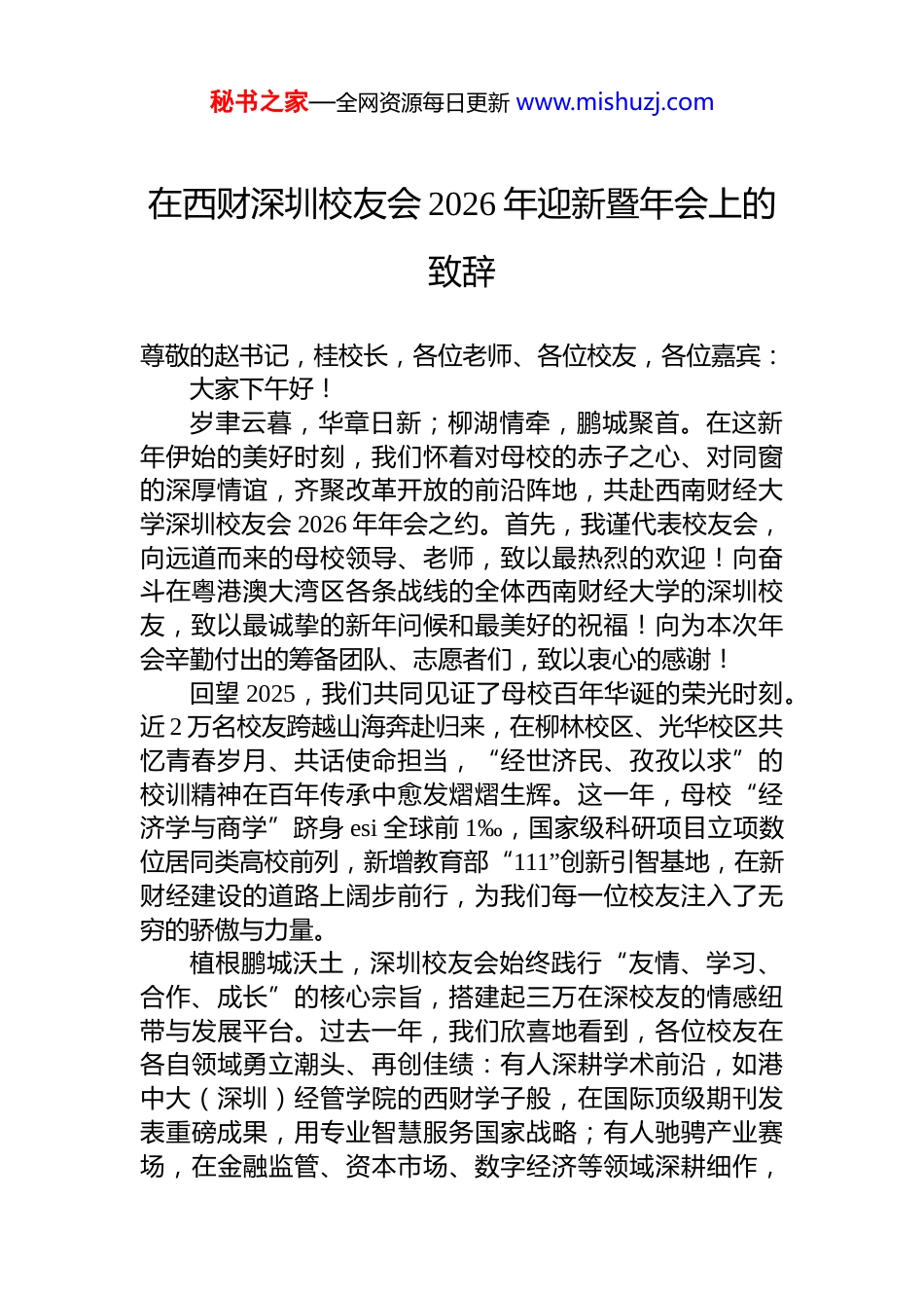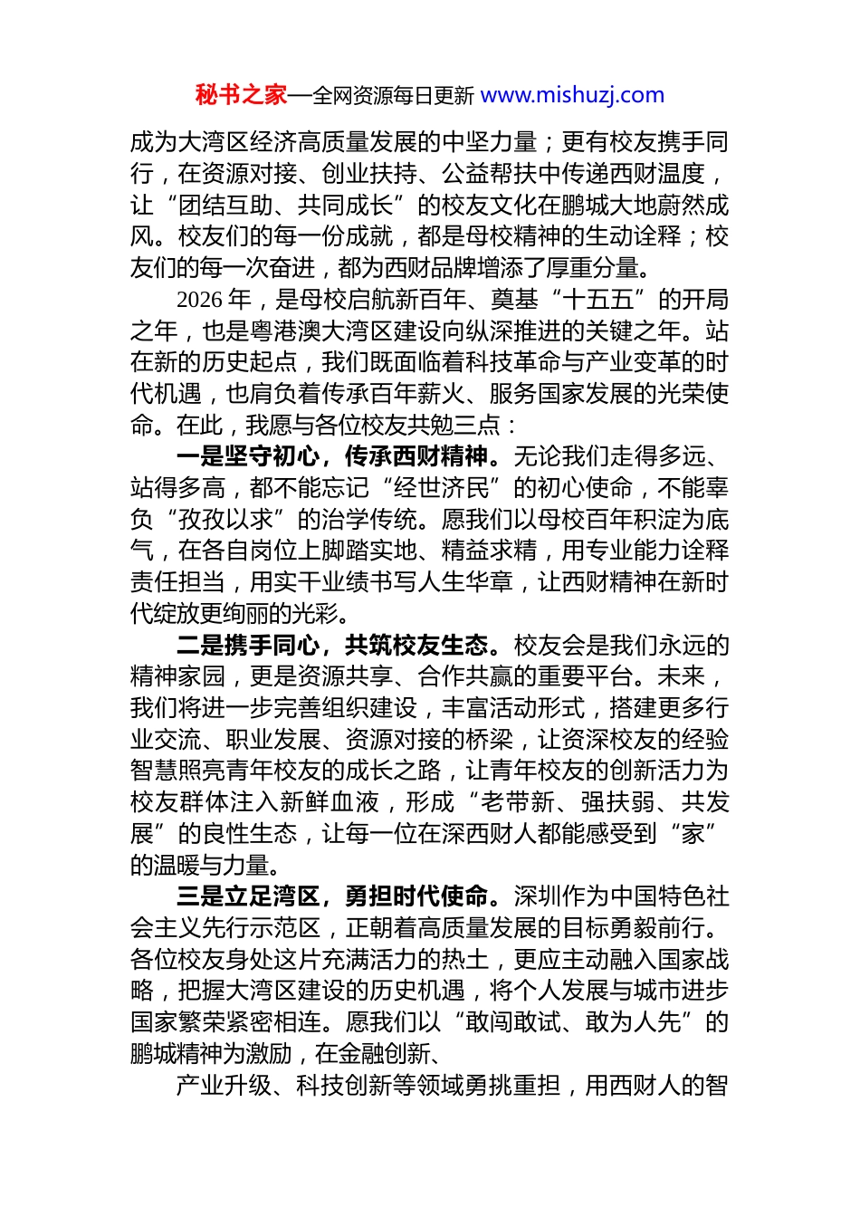 秘书之家—全网资源每日更新 www.mishuzj.com在西财深圳校友会 2026 年迎新暨年会上的致辞尊敬的赵书记,桂校长,各位老师、各位校友,各位嘉宾:大家下午好!岁聿云暮,华章日新;柳湖情牵,鹏城聚首。在这新年伊始的美好时刻,我们怀着对母校的赤子之心、对同窗的深厚情谊,齐聚改革开放的前沿阵地,共赴西南财经大学深圳校友会 2026 年年会之约。首先,我谨代表校友会,向远道而来的母校领导、老师,致以最热烈的欢迎!向奋斗在粤港澳大湾区各条战线的全体西南财经大学的深圳校友,致以最诚挚的新年问候和最美好的祝福!向为本次年会辛勤付出的筹备团队、志愿者们,致以衷心的感谢!回望 2025,我们共同见证了母校百年华诞的荣光时刻。近 2 万名校友跨越山海奔赴归来,在柳林校区、光华校区共忆青春岁月、共话使命担当,“经世济民、孜孜以求”的校训精神在百年传承中愈发熠熠生辉。这一年,母校“经济学与商学”跻身 esi 全球前 1‰,国家级科研项目立项数位居同类高校前列,新增教育部“111”创新引智基地,在新财经建设的道路上阔步前行,为我们每一位校友注入了无穷的骄傲与力量。植根鹏城沃土,深圳校友会始终践行“友情、学习、合作、成长”的核心宗旨,搭建起三万在深校友的情感纽带与发展平台。过去一年,我们欣喜地看到,各位校友在各自领域勇立潮头、再创佳绩:有人深耕学术前沿,如港中大(深圳)经管学院的西财学子般,在国际顶级期刊发表重磅成果,用专业智慧服务国家战略;有人驰骋产业赛场,在金融监管、资本市场、数字经济等领域深耕细作,秘书之家—全网资源每日更新 www.mishuzj.com成为大湾区经济高质量发展的中坚力量;更有校友携手同行,在资源对接、创业扶持、公益帮扶中传递西财温度,让“团结互助、共同成长”的校友文化在鹏城大地蔚然成风。校友们的每一份成就,都是母校精神的生动诠释;校友们的每一次奋进,都为西财品牌增添了厚重分量。2026 年,是母校启航新百年、奠基“十五五”的开局之年,也是粤港澳大湾区建设向纵深推进的关键之年。站在新的历史起点,我们既面临着科技革命与产业变革的时代机遇,也肩负着传承百年薪火、服务国家发展的光荣使命。在此,我愿与各位校友共勉三点:一是坚守初心,传承西财精神。无论我们走得多远、站得多高,都不能忘记“经世济民”的初心使命,不能辜负“孜孜以求”的治学传统。愿我们以母校百年积淀为底气,在各自岗位上脚踏实地、精益求精,用专业能力诠释责任担当,用实干业绩书写人生华章,让西财精神在新时代绽放更绚丽的光彩。二是携手同心,共筑校友生态。校友会是我们永远的精神家园,更是资源共享、合作共赢的重要平台。未来,我们将进一步完善组织建设,丰富活动形式,搭建更多行业交流、职业发展、资源对接的桥梁,让资深校友的经验智慧照亮青年校友的成长之路,让青年校友的创新活力为校友群体注入新鲜血液,形成“老带新、强扶弱、共发展”的良性生态,让每一位在深西财人都能感受到“家”的温暖与力量。三是立足湾区,勇担时代使命。深圳作为中国特色社会主义先行示范区,正朝着高质量发展的目标勇毅前行。各位校友身处这片充满活力的热土,更应主动融入国家战略,把握大湾区建设的历史机遇,将个人发展与城市进步国家繁荣紧密相连。愿我们以“敢闯敢试、敢为人先”的鹏城精神为激励,在金融创新、产业升级、科技创新等领域勇挑重担,用西财人的智秘书之家—全网资源每日更新 www.mishuzj.com慧与担当,为大湾区发展注入更强动能,为母校争光添彩。各位校友、各位嘉宾,岁月不老,情谊长存;初心如磐,未来可期。母校永远是我们最坚实的后盾,校友会永远是我们最温暖的港湾。无论我们身在何方、从事何种职业,“西财人”这一共同的身份,始终是我们彼此联结的精神纽带。最后,衷心祝愿母校在新百年的征程上再创辉煌,早日建成财经特色鲜明的世界一流大学!祝愿各位领导,各位老师,各位嘉宾,各位校友在 2026 年龙马精神、事业腾达、阖家幸福、万事皆可期!祝愿我们深圳校友会的明天更加美好!
