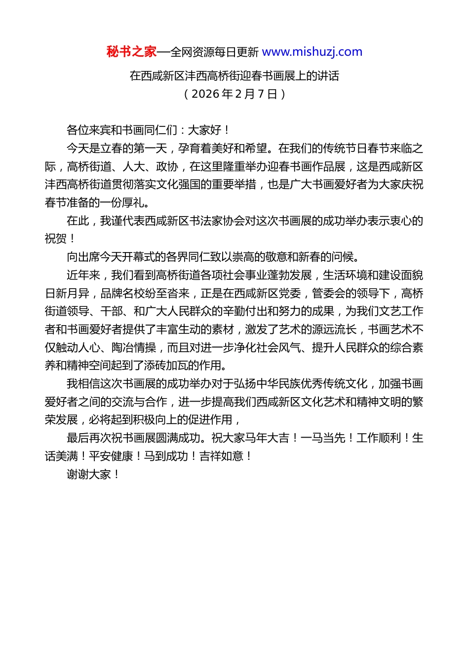 秘书之家—全网资源每日更新 www.mishuzj.com在西咸新区沣西高桥街迎春书画展上的讲话(2026 年 2 月 7 日)各位来宾和书画同仁们:大家好!今天是立春的第一天,孕育着美好和希望。在我们的传统节日春节来临之际,高桥街道、人大、政协,在这里隆重举办迎春书画作品展,这是西咸新区沣西高桥街道贯彻落实文化强国的重要举措,也是广大书画爱好者为大家庆祝春节准备的一份厚礼。在此,我谨代表西咸新区书法家协会对这次书画展的成功举办表示衷心的祝贺!向出席今天开幕式的各界同仁致以崇高的敬意和新春的问候。近年来,我们看到高桥街道各项社会事业蓬勃发展,生活环境和建设面貌日新月异,品牌名校纷至沓来,正是在西咸新区党委,管委会的领导下,高桥街道领导、干部、和广大人民群众的辛勤付出和努力的成果,为我们文艺工作者和书画爱好者提供了丰富生动的素材,激发了艺术的源远流长,书画艺术不仅触动人心、陶冶情操,而且对进一步净化社会风气、提升人民群众的综合素养和精神空间起到了添砖加瓦的作用。我相信这次书画展的成功举办对于弘扬中华民族优秀传统文化,加强书画爱好者之间的交流与合作,进一步提高我们西咸新区文化艺术和精神文明的繁荣发展,必将起到积极向上的促进作用,最后再次祝书画展圆满成功。祝大家马年大吉!一马当先!工作顺利!生话美满!平安健康!马到成功!吉祥如意!谢谢大家!