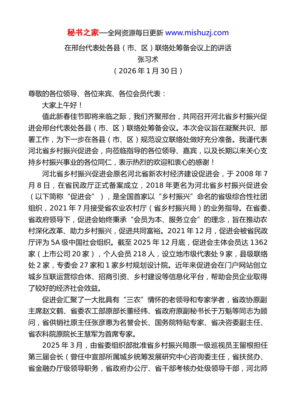 秘书之家—全网资源每日更新 www.mishuzj.com在邢台代表处各县(市、区)联络处筹备会议上的讲话张习术(2026 年 1 月 30 日)尊敬的各位领导、各位来宾、各位会员代表:大家上午好!值此新春佳节即将来临之际,我们齐聚邢台,共同召开河北省乡村振兴促进会邢台代表处各县(市、区)联络处筹备会议。本次会议旨在凝聚共识、部署工作,为下一步在各县(市、区)规范设立联络处做好充分准备。我谨代表河北省乡村振兴促进会,向莅临指导的各位领导、嘉宾,以及长期以来关心支持乡村振兴事业的各位同仁,表示热烈的欢迎和衷心的感谢!河北省乡村振兴促进会原名河北省新农村经济建设促进会,于 2008 年 7月 8 日,在省民政厅正式备案成立,2018 年更名为河北省乡村振兴促进会(以下简称“促进会”),是全国首家以“乡村振兴”命名的省级综合性社团组织,2021 年 7 月接受省农业农村厅(省乡村振兴局)的业务指导。在省委、省政府领导下,促进会始终秉承“会员为本、服务立会”的理念,旨在推动农村深化改革、助力乡村振兴,促进共同富裕。2021 年 12 月,促进会被省民政厅评为 5A 级中国社会组织。截至 2025 年 12 月底,促进会主体会员达 1362家(上市公司 20 家),个人会员 218 人,设立地市级代表处 9 家,县级联络处 2 家,专委会 27 家和 1 家乡村规划设计院。近年来促进会在门户网站创立城乡互联运营综合体、招商引资、乡村建设等信息化平台,帮助会员企业取得了较好的经济社会效益。促进会汇聚了一大批具有“三农”情怀的老领导和专家学者,省政协原副主席赵文鹤、省委农工部原部长董经纬、省政府原副秘书长于万魁等同志为顾问,省供销社原主任张彦惠为名誉会长、国务院特贴专家、省决咨委副主任、省农科院原院长王慧军为首席专家。2025 年 3 月,由省委组织部批准省乡村振兴局原一级巡视员王留根担任第三届会长(曾任中宣部所属城乡统筹发展研究中心咨询委主任,省扶贫办、省金融办厅级领导职务,省政府办公厅、省干部考核办处级领导干部,河北师秘书之家—全网资源每日更新 www.mishuzj.com范大学客座教授,长期从事组织干部、经济金融、农业农村工作,出版专著10 部)。2025 年经省农业农村厅批准,促进会成为省级高素质农民培训机构。同年 4 月和 6 月,分别发起设立乡村发展研究院和乡村文化研究院,目前已汇集了 20 多所大学、60 多名专家学者,现根据形势的发展,拟定将两院合并筹建河北乡村振兴研究院。回顾过去的 2025 年,促进会在省委、省政府的坚强领导和有关部门的有力指导下,紧紧围绕全省乡村振兴战略,以“会员为本、服务立会”为宗旨,在组织建设、调查研究、资源整合、品牌打造、项目推动等方面取得了积极进展。我们新增了 26 家优质会员单位,设立了唐山、张家口代表处,开展了 13次深入基层的调研,举办了 11 场有影响力的品牌活动,培训各类人才 580 人次,初步构建了覆盖规划、研究、文化等多维度的专业支撑体系。这些成绩的取得,离不开在座各位的共同努力与辛勤付出,也为我们下一步深化服务网络建设打下了坚实基础。今天,我们启动邢台地区县级联络处的筹备工作,正是为了将服务触角进一步延伸至县域基层,更直接、更有效地响应乡村发展需求,这标志着我们在完善全省乡村振兴服务网络的进程中,即将迈出关键的一步。借此机会,我就本次筹备工作及联络处的未来使命,谈几点意见:第一,明确“为何要筹备各县区联络处”:深刻认识联络处设立的必要性与战略性。筹备设立县级联络处,并非简单地增加一个机构,而是省促进会事业发展与战略布局的内在要求。其根本目的,在于构建一个“贴近一线、反应灵敏、执行有力”的基层服务节点,以破解政策与资源落地的“最后一公里”难题。未来的联络处,将是促进会章程与管理办法在县域的贯彻主体,是连接省促进会、市级代表处与广大乡村、会员单位的重要纽带。我们必须从战略高度认识其重要性,以严谨、规范的态度做好各项筹备工作,确保其从一开始就沿着正确的轨道发展。第二,弄清“要筹备什么”:准确把握筹备阶段的核心任务与职责蓝图。本次筹备会...