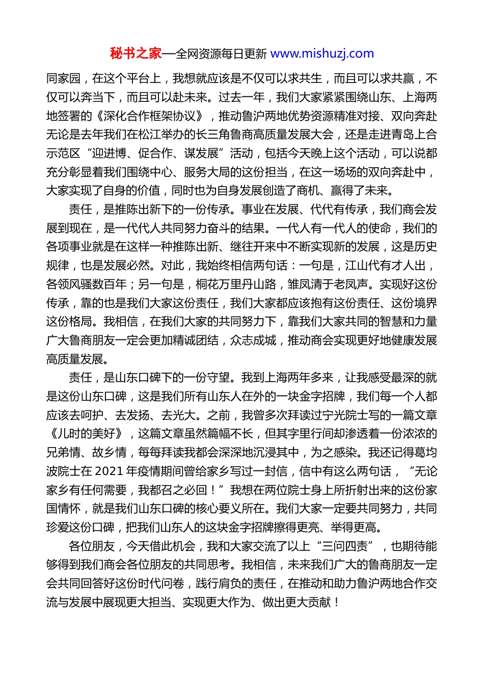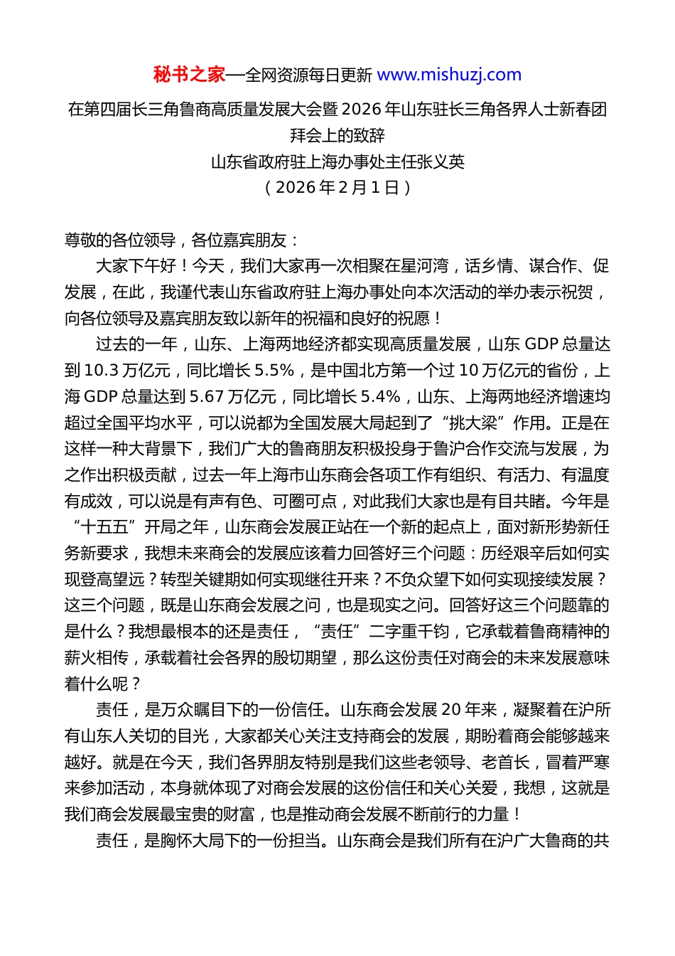 秘书之家—全网资源每日更新 www.mishuzj.com在第四届长三角鲁商高质量发展大会暨 2026 年山东驻长三角各界人士新春团拜会上的致辞山东省政府驻上海办事处主任张义英(2026 年 2 月 1 日)尊敬的各位领导,各位嘉宾朋友:大家下午好!今天,我们大家再一次相聚在星河湾,话乡情、谋合作、促发展,在此,我谨代表山东省政府驻上海办事处向本次活动的举办表示祝贺,向各位领导及嘉宾朋友致以新年的祝福和良好的祝愿!过去的一年,山东、上海两地经济都实现高质量发展,山东 GDP 总量达到 10.3 万亿元,同比增长 5.5%,是中国北方第一个过 10 万亿元的省份,上海 GDP 总量达到 5.67 万亿元,同比增长 5.4%,山东、上海两地经济增速均超过全国平均水平,可以说都为全国发展大局起到了“挑大梁”作用。正是在这样一种大背景下,我们广大的鲁商朋友积极投身于鲁沪合作交流与发展,为之作出积极贡献,过去一年上海市山东商会各项工作有组织、有活力、有温度有成效,可以说是有声有色、可圈可点,对此我们大家也是有目共睹。今年是“十五五”开局之年,山东商会发展正站在一个新的起点上,面对新形势新任务新要求,我想未来商会的发展应该着力回答好三个问题:历经艰辛后如何实现登高望远?转型关键期如何实现继往开来?不负众望下如何实现接续发展?这三个问题,既是山东商会发展之问,也是现实之问。回答好这三个问题靠的是什么?我想最根本的还是责任,“责任”二字重千钧,它承载着鲁商精神的薪火相传,承载着社会各界的殷切期望,那么这份责任对商会的未来发展意味着什么呢?责任,是万众瞩目下的一份信任。山东商会发展 20 年来,凝聚着在沪所有山东人关切的目光,大家都关心关注支持商会的发展,期盼着商会能够越来越好。就是在今天,我们各界朋友特别是我们这些老领导、老首长,冒着严寒来参加活动,本身就体现了对商会发展的这份信任和关心关爱,我想,这就是我们商会发展最宝贵的财富,也是推动商会发展不断前行的力量!责任,是胸怀大局下的一份担当。山东商会是我们所有在沪广大鲁商的共秘书之家—全网资源每日更新 www.mishuzj.com同家园,在这个平台上,我想就应该是不仅可以求共生,而且可以求共赢,不仅可以奔当下,而且可以赴未来。过去一年,我们大家紧紧围绕山东、上海两地签署的《深化合作框架协议》,推动鲁沪两地优势资源精准对接、双向奔赴无论是去年我们在松江举办的长三角鲁商高质量发展大会,还是走进青岛上合示范区“迎进博、促合作、谋发展”活动,包括今天晚上这个活动,可以说都充分彰显着我们围绕中心、服务大局的这份担当,在这一场场的双向奔赴中,大家实现了自身的价值,同时也为自身发展创造了商机、赢得了未来。责任,是推陈出新下的一份传承。事业在发展、代代有传承,我们商会发展到现在,是一代代人共同努力奋斗的结果。一代人有一代人的使命,我们的各项事业就是在这样一种推陈出新、继往开来中不断实现新的发展,这是历史规律,也是发展必然。对此,我始终相信两句话:一句是,江山代有才人出,各领风骚数百年;另一句是,桐花万里丹山路,雏凤清于老凤声。实现好这份传承,靠的也是我们大家这份责任,我们大家都应该抱有这份责任、这份境界这份格局。我相信,在我们大家的共同努力下,靠我们大家共同的智慧和力量广大鲁商朋友一定会更加精诚团结,众志成城,推动商会实现更好地健康发展高质量发展。责任,是山东口碑下的一份守望。我到上海两年多来,让我感受最深的就是这份山东口碑,这是我们所有山东人在外的一块金字招牌,我们每一个人都应该去呵护、去发扬、去光大。之前,我曾多次拜读过宁光院士写的一篇文章《儿时的美好》,这篇文章虽然篇幅不长,但其字里行间却渗透着一份浓浓的兄弟情、故乡情,每每拜读我都会深深地沉浸其中,为之感染。我还记得葛均波院士在 2021 年疫情期间曾给家乡写过一封信,信中有这么两句话,“无论家乡有任何需要,我都召之必回!”我想在两位院士身上所折射出来的这份家国情怀,就是我们山东口碑的核心要义所在。我们大家一定要共同努力,共同珍爱这份口碑,把我们山东人的这块金字...