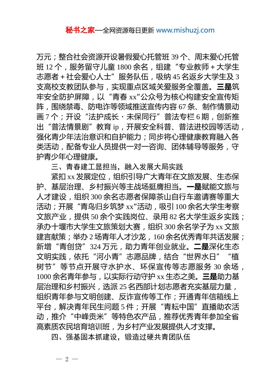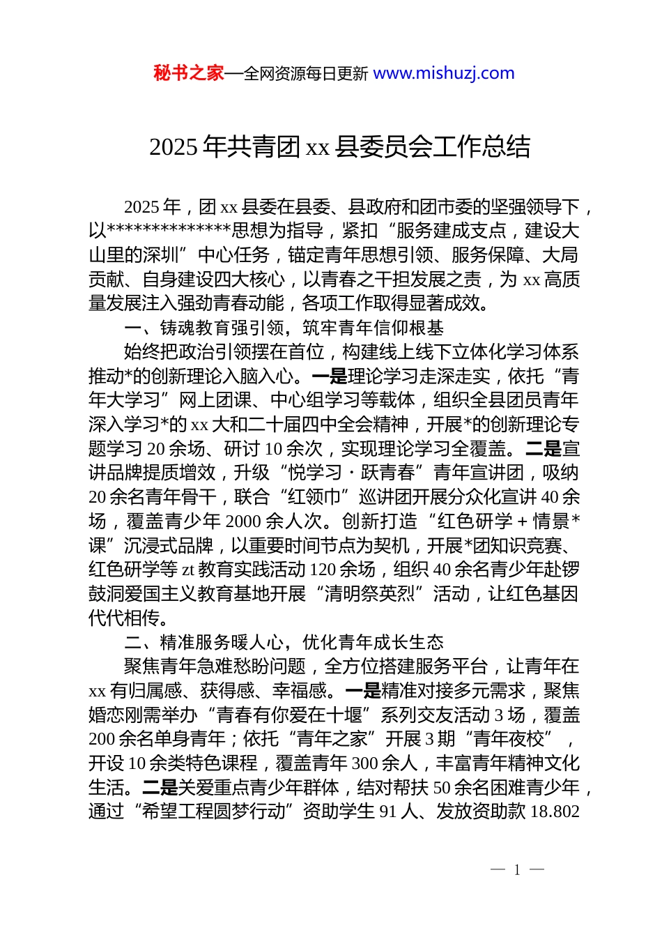 秘书之家—全网资源每日更新 www.mishuzj.com2025 年共青团 xx 县委员会工作总结2025 年,团 xx 县委在县委、县政府和团市委的坚强领导下,以**************思想为指导,紧扣“服务建成支点,建设大山里的深圳”中心任务,锚定青年思想引领、服务保障、大局贡献、自身建设四大核心,以青春之干担发展之责,为 xx 高质量发展注入强劲青春动能,各项工作取得显著成效。一、铸魂教育强引领,筑牢青年信仰根基始终把政治引领摆在首位,构建线上线下立体化学习体系推动*的创新理论入脑入心。一是理论学习走深走实,依托“青年大学习”网上团课、中心组学习等载体,组织全县团员青年深入学习*的 xx 大和二十届四中全会精神,开展*的创新理论专题学习 20 余场、研讨 10 余次,实现理论学习全覆盖。二是宣讲品牌提质增效,升级“悦学习・跃青春”青年宣讲团,吸纳20 余名青年骨干,联合“红领巾”巡讲团开展分众化宣讲 40 余场,覆盖青少年 2000 余人次。创新打造“红色研学+情景*课”沉浸式品牌,以重要时间节点为契机,开展*团知识竞赛、红色研学等 zt 教育实践活动 120 余场,组织 40 余名青少年赴锣鼓洞爱国主义教育基地开展“清明祭英烈”活动,让红色基因代代相传。二、精准服务暖人心,优化青年成长生态聚焦青年急难愁盼问题,全方位搭建服务平台,让青年在xx 有归属感、获得感、幸福感。一是精准对接多元需求,聚焦婚恋刚需举办“青春有你爱在十堰”系列交友活动 3 场,覆盖200 余名单身青年;依托“青年之家”开展 3 期“青年夜校”,开设 10 余类特色课程,覆盖青年 300 余人,丰富青年精神文化生活。二是关爱重点青少年群体,结对帮扶 50 余名困难青少年,通过“希望工程圆梦行动”资助学生 91 人、发放资助款 18.802— 1 —秘书之家—全网资源每日更新 www.mishuzj.com万元;整合社会资源开设暑假爱心托管班 39 个、周末爱心托管班 12 个,服务留守儿童 1800 余名,组建“专业教师+大学生志愿者+社会爱心人士”服务队伍,吸纳 45 名返乡大学生及 3支高校支教团队参与,实现重点区域关爱服务全覆盖。三是筑牢安全防护屏障,以“青春 xx”公众号为核心构建安全宣传矩阵,围绕禁毒、防电诈等领域推送宣传内容 67 条、制作情景动画 7 个;开设“法护成长・未保同行”普法专栏 6 期,创新推出“普法情景剧”教育 ip,开展安全科普、普法进校园等活动,强化青少年法治意识和自护能力;同步将心理健康教育融入各类活动,配备专业人员提供一对一咨询、团体辅导等服务,守护青少年心理健康。三、青春建工显担当,融入发展大局实践紧扣 xx 发展定位,组织引导广大青年在文旅发展、生态保护、基层治理、乡村振兴等主战场挺膺担当。一是赋能文旅与人才建设,组织 300 余名志愿者保障茶山自行车邀请赛等重大活动;开展“青鸟归乡筑梦 xx”活动,吸引 100 余名大学生考察文旅产业,提供 50 余个实践岗位、录用 82 名大学生返乡实践;承办十堰市大学生文旅策划大赛,组织 300 余名学子为 xx 文旅建言献策;举办 2 场青年人才沙龙,160 余名优秀青年共话发展;新增“青创贷”324 万元,助力青年创业就业。二是深化生态文明实践,依托“河小青”志愿品牌,结合“世界水日”“植树节”等节点开展守水护水、环保宣传等志愿服务 30 余场,1000 余名青年参与,以实际行动守护 xx 生态之美。三是助力基层治理和乡村振兴,选派 25 名西部计划志愿者充实基层力量,组织青年参与文明创建、反诈宣传等工作;开通青年信箱线上平台,解决青年民生问题 5 件;开展“青耘中国”直播助农活动,推介“中峰贡米”等特色农产品,推荐优秀青年参加全省高素质农民培育培训班,为乡村产业发展提供人才支撑。四、强基固本抓建设,锻造过硬共青团队伍— 2 —秘书之家—全网资源每日更新 www.mishuzj.com坚持全面从严治团,不断夯实组织基础、提升队伍素质、强化作风建设,增强团组织凝聚力和战斗力。一是夯实组织基础,持续推进“两企三新”领域团组织应建尽建,指导 6 个基层团组织完成换届;严格落实“三会一课”...