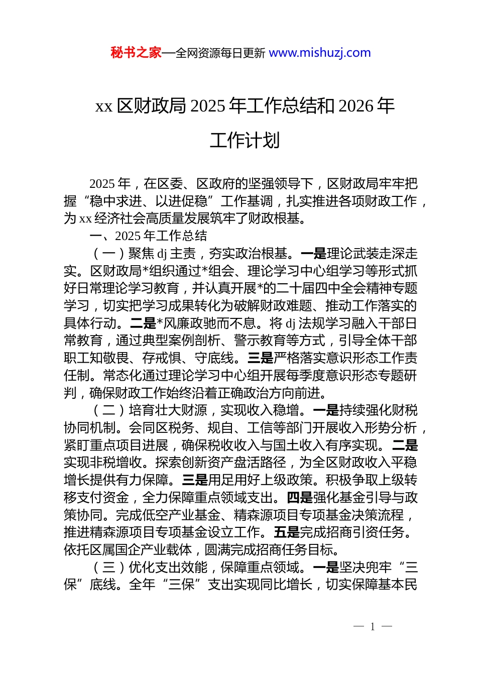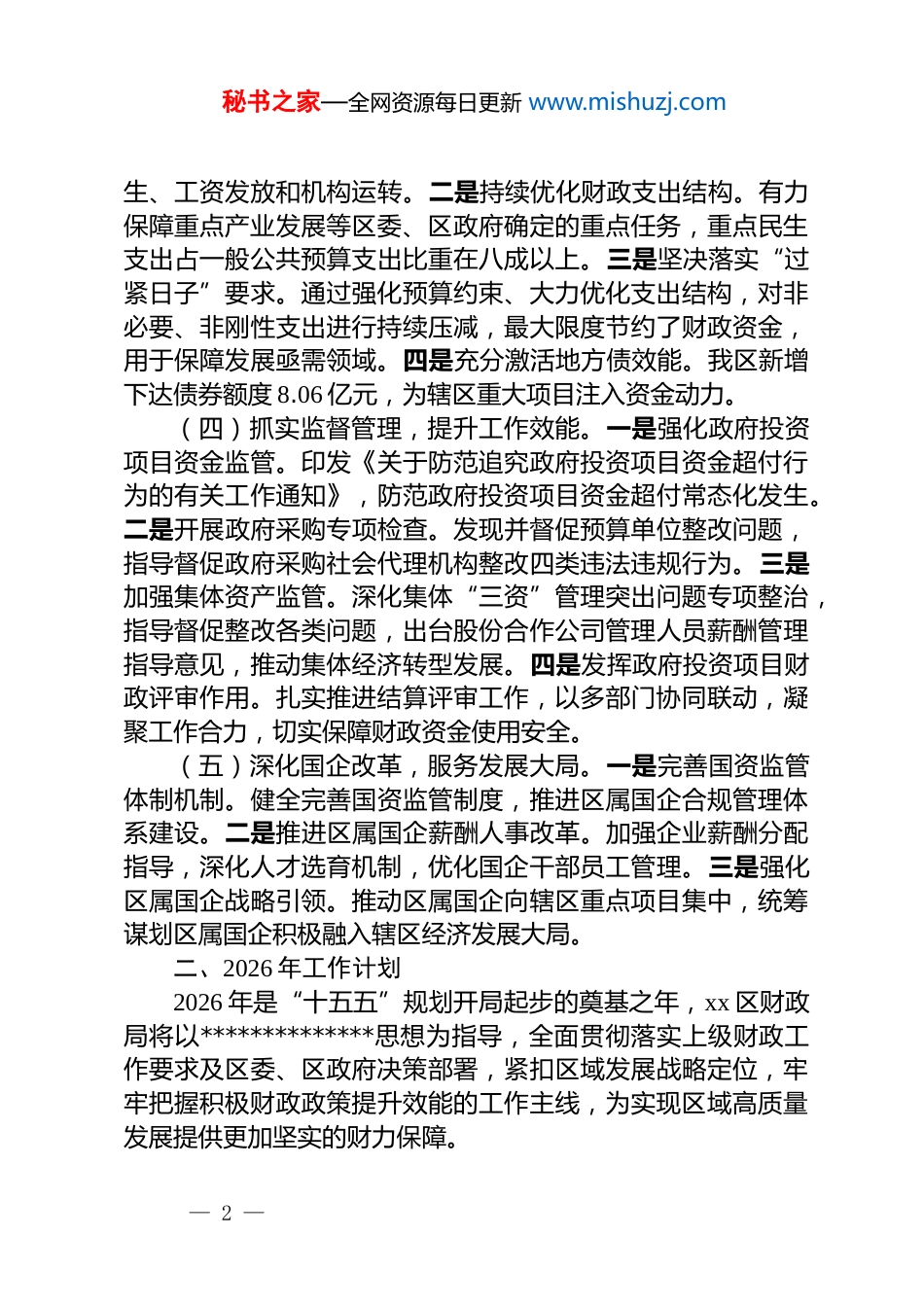 秘书之家—全网资源每日更新 www.mishuzj.comxx 区财政局 2025 年工作总结和 2026 年工作计划2025 年,在区委、区政府的坚强领导下,区财政局牢牢把握“稳中求进、以进促稳”工作基调,扎实推进各项财政工作,为 xx 经济社会高质量发展筑牢了财政根基。一、2025 年工作总结(一)聚焦 dj 主责,夯实政治根基。一是理论武装走深走实。区财政局*组织通过*组会、理论学习中心组学习等形式抓好日常理论学习教育,并认真开展*的二十届四中全会精神专题学习,切实把学习成果转化为破解财政难题、推动工作落实的具体行动。二是*风廉政驰而不息。将 dj 法规学习融入干部日常教育,通过典型案例剖析、警示教育等方式,引导全体干部职工知敬畏、存戒惧、守底线。三是严格落实意识形态工作责任制。常态化通过理论学习中心组开展每季度意识形态专题研判,确保财政工作始终沿着正确政治方向前进。(二)培育壮大财源,实现收入稳增。一是持续强化财税协同机制。会同区税务、规自、工信等部门开展收入形势分析,紧盯重点项目进展,确保税收收入与国土收入有序实现。二是实现非税增收。探索创新资产盘活路径,为全区财政收入平稳增长提供有力保障。三是用足用好上级政策。积极争取上级转移支付资金,全力保障重点领域支出。四是强化基金引导与政策协同。完成低空产业基金、精森源项目专项基金决策流程,推进精森源项目专项基金设立工作。五是完成招商引资任务。依托区属国企产业载体,圆满完成招商任务目标。(三)优化支出效能,保障重点领域。一是坚决兜牢“三保”底线。全年“三保”支出实现同比增长,切实保障基本民— 1 —秘书之家—全网资源每日更新 www.mishuzj.com生、工资发放和机构运转。二是持续优化财政支出结构。有力保障重点产业发展等区委、区政府确定的重点任务,重点民生支出占一般公共预算支出比重在八成以上。三是坚决落实“过紧日子”要求。通过强化预算约束、大力优化支出结构,对非必要、非刚性支出进行持续压减,最大限度节约了财政资金,用于保障发展亟需领域。四是充分激活地方债效能。我区新增下达债券额度 8.06 亿元,为辖区重大项目注入资金动力。(四)抓实监督管理,提升工作效能。一是强化政府投资项目资金监管。印发《关于防范追究政府投资项目资金超付行为的有关工作通知》,防范政府投资项目资金超付常态化发生。二是开展政府采购专项检查。发现并督促预算单位整改问题,指导督促政府采购社会代理机构整改四类违法违规行为。三是加强集体资产监管。深化集体“三资”管理突出问题专项整治,指导督促整改各类问题,出台股份合作公司管理人员薪酬管理指导意见,推动集体经济转型发展。四是发挥政府投资项目财政评审作用。扎实推进结算评审工作,以多部门协同联动,凝聚工作合力,切实保障财政资金使用安全。(五)深化国企改革,服务发展大局。一是完善国资监管体制机制。健全完善国资监管制度,推进区属国企合规管理体系建设。二是推进区属国企薪酬人事改革。加强企业薪酬分配指导,深化人才选育机制,优化国企干部员工管理。三是强化区属国企战略引领。推动区属国企向辖区重点项目集中,统筹谋划区属国企积极融入辖区经济发展大局。二、2026 年工作计划2026 年是“十五五”规划开局起步的奠基之年,xx 区财政局将以**************思想为指导,全面贯彻落实上级财政工作要求及区委、区政府决策部署,紧扣区域发展战略定位,牢牢把握积极财政政策提升效能的工作主线,为实现区域高质量发展提供更加坚实的财力保障。— 2 —秘书之家—全网资源每日更新 www.mishuzj.com(一)强 dj、严治*,夯实财政工作政治保障。坚持以*的政治建设为统领,统筹推进 dj 工作与全面从严治*。深化理论武装,严格落实“第一议题”制度,规范*内政治生活,夯实基层*组织建设。压紧压实管*治*政治责任,持之以恒正风肃纪,严守财经纪律和廉洁底线,强化财政资金监管风险防控。推动dj 与财政业务深度融合,为全区经济社会高质量发展提供坚强政治保障。(二)抓收入、增动能,筑牢财政可持续发展根基。持续强化与税务、产业部门的协同联动,完善重点税源监测...